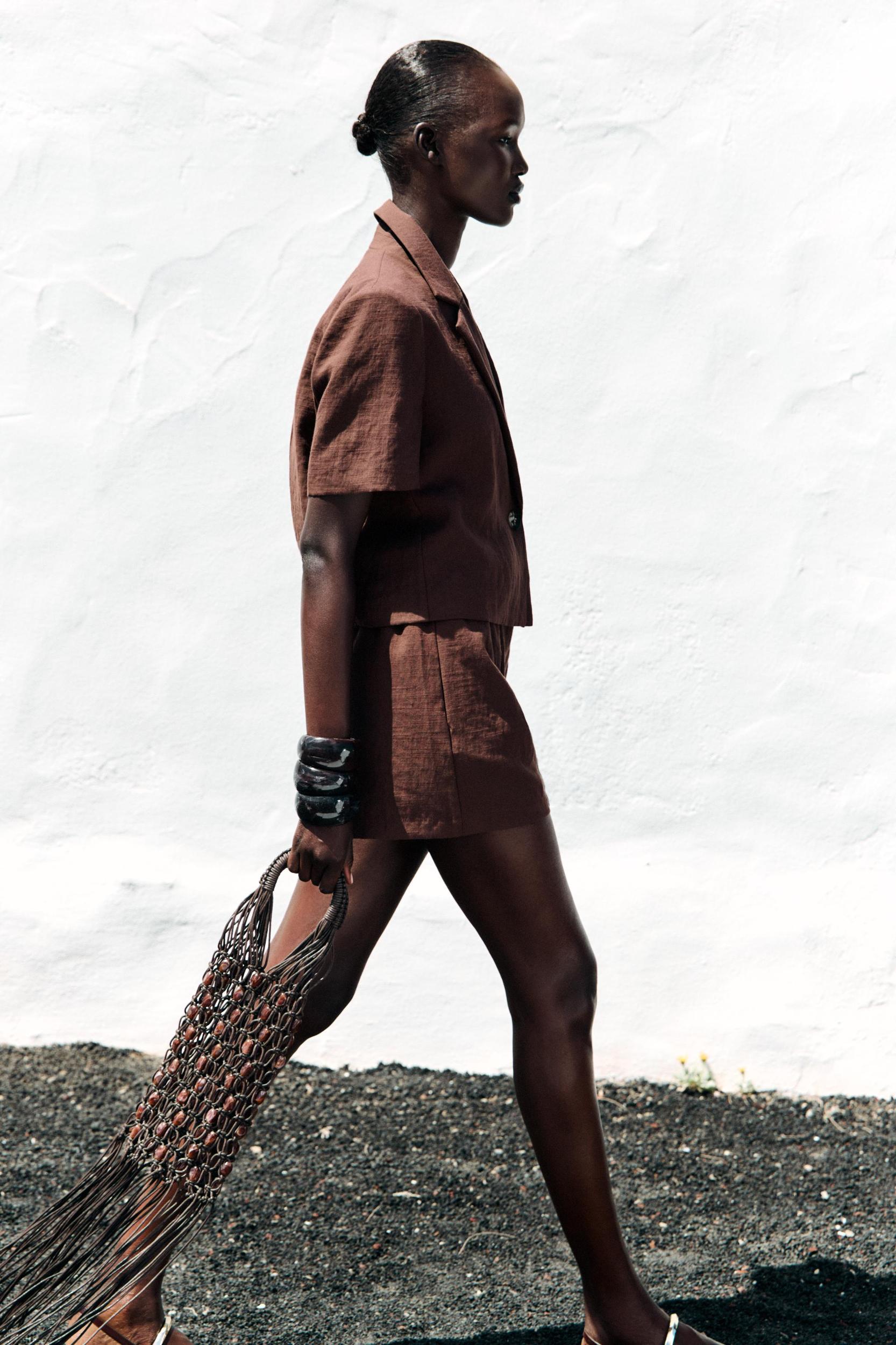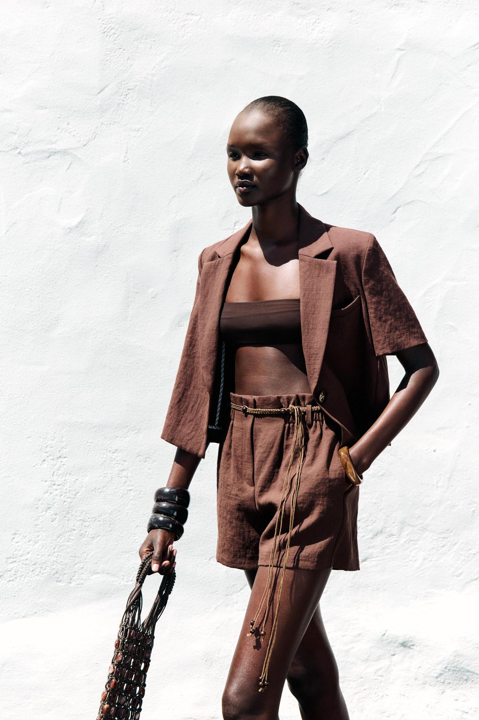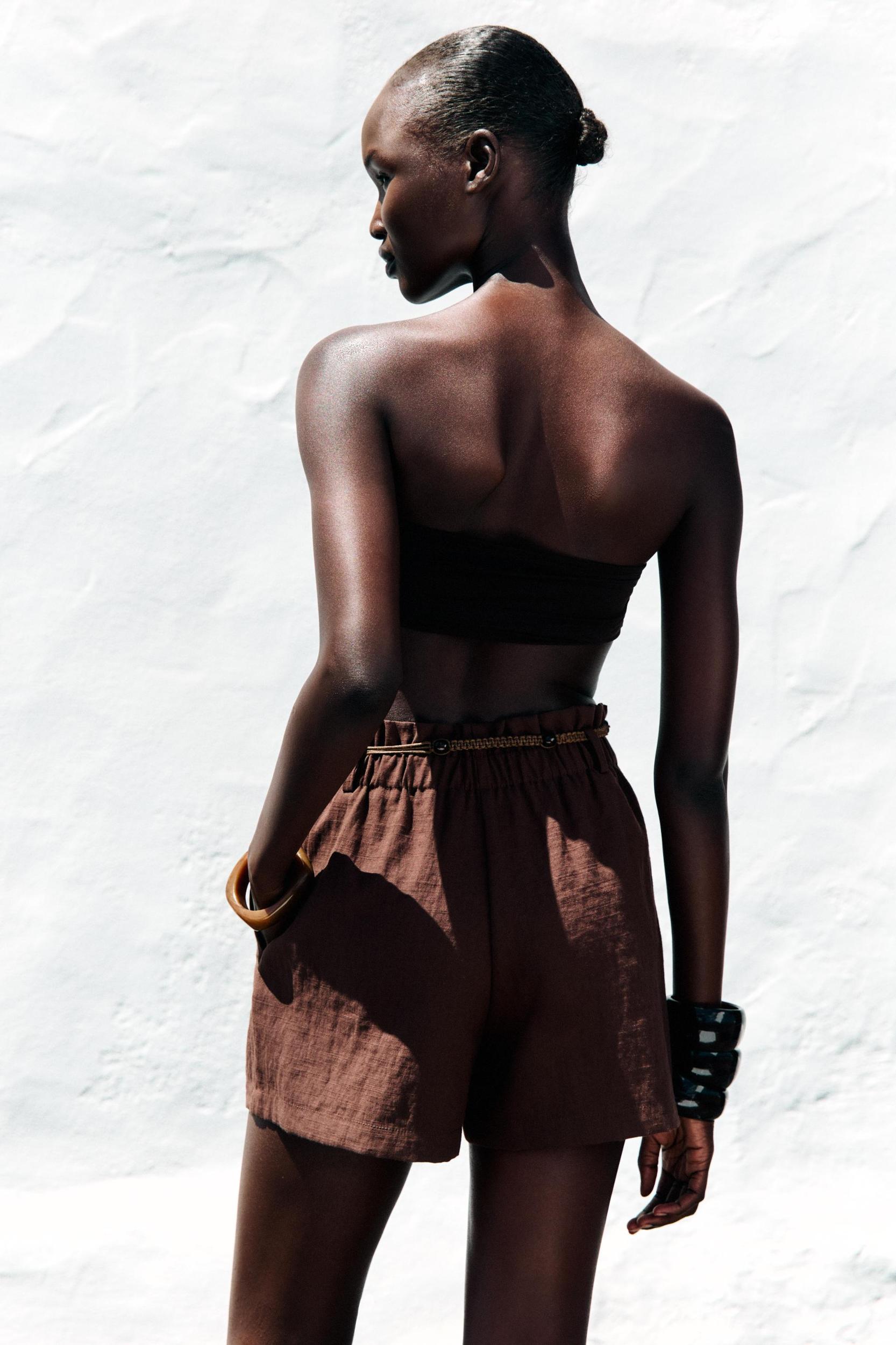 High-waisted shorts with elastic waistband and ruching. Front pockets. Braided belt detail with beads. Front closure with zipper, inner button, and hook.