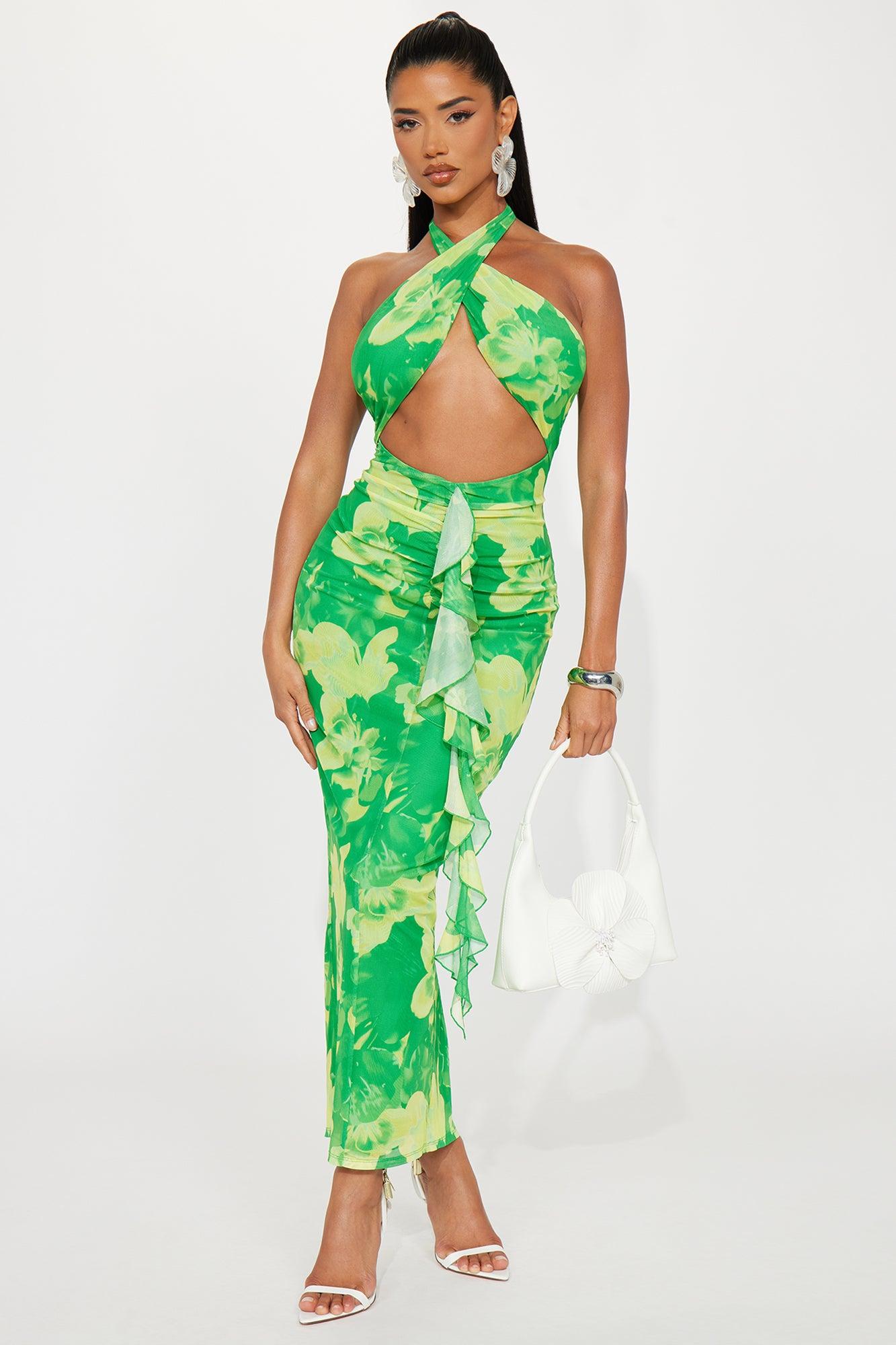 Available In Hot Pink/combo And Green/combo. Mesh Maxi Dress Halter Criss Cross Neckline Cut Out Ruffle Detail Backless Back Slit Lined Stretch Disclaimer : Design Pattern Placement Will Vary Self: 97% Polyester 3% Spandex Lining: 95% Polyester 5% Spandex Imported