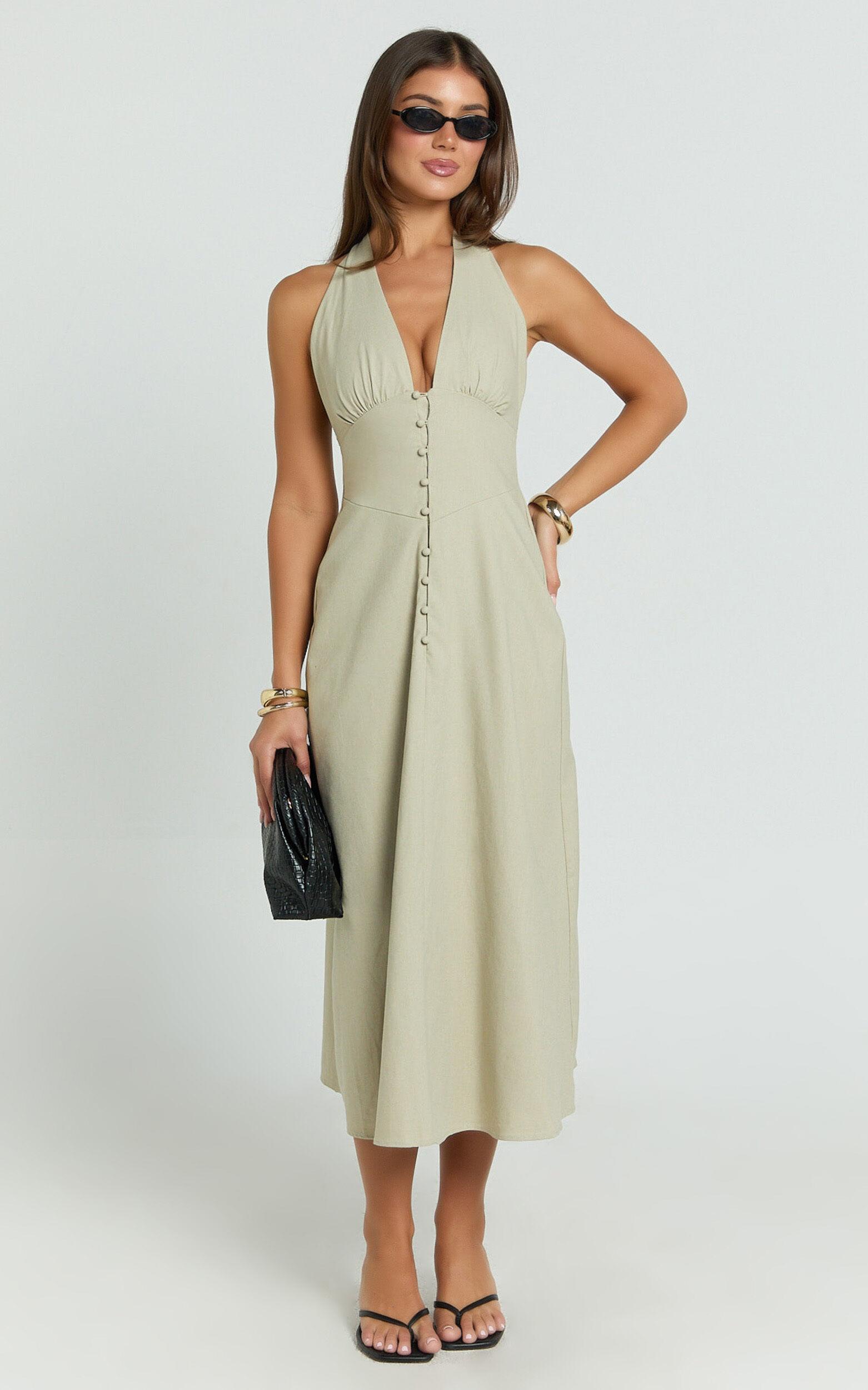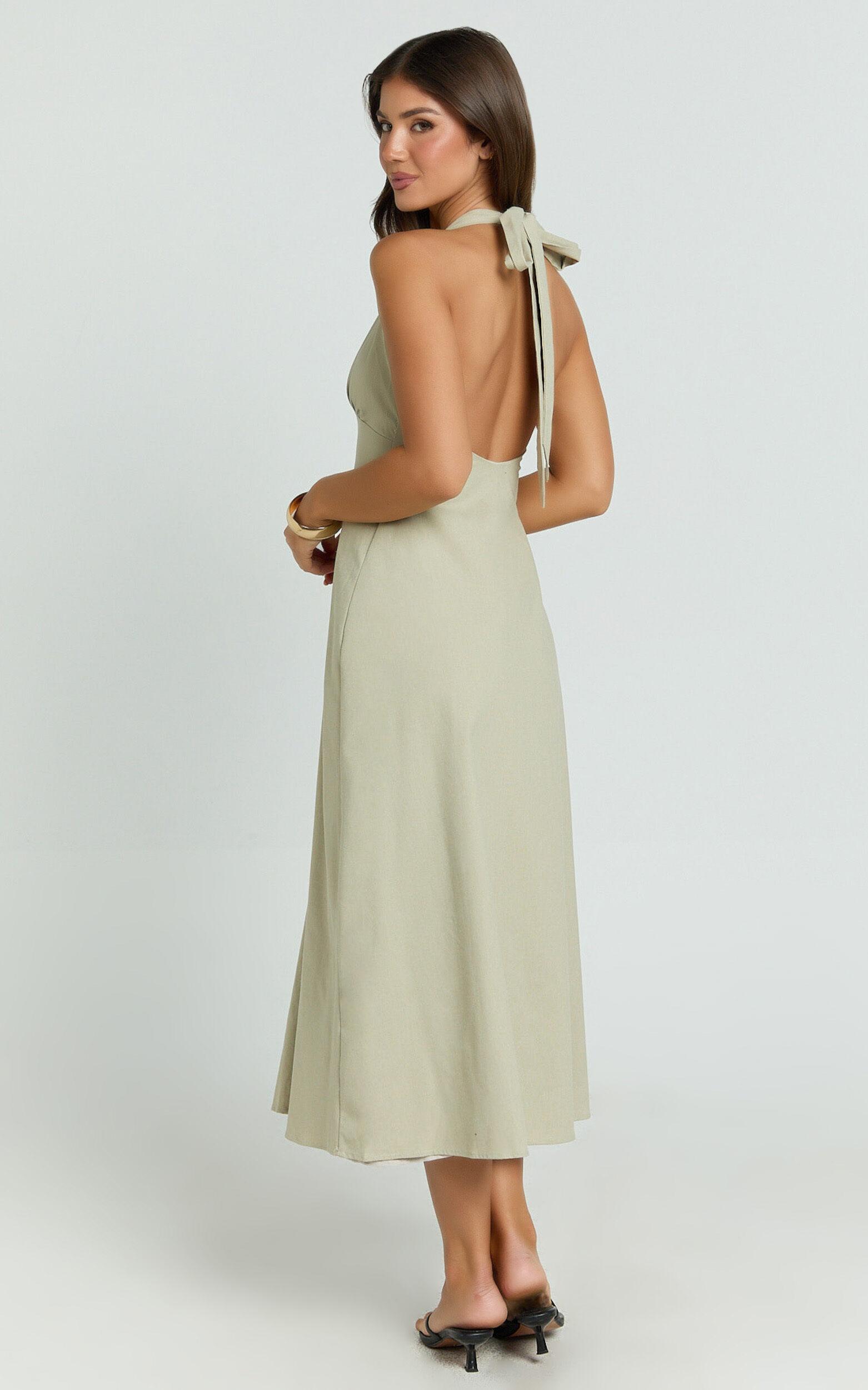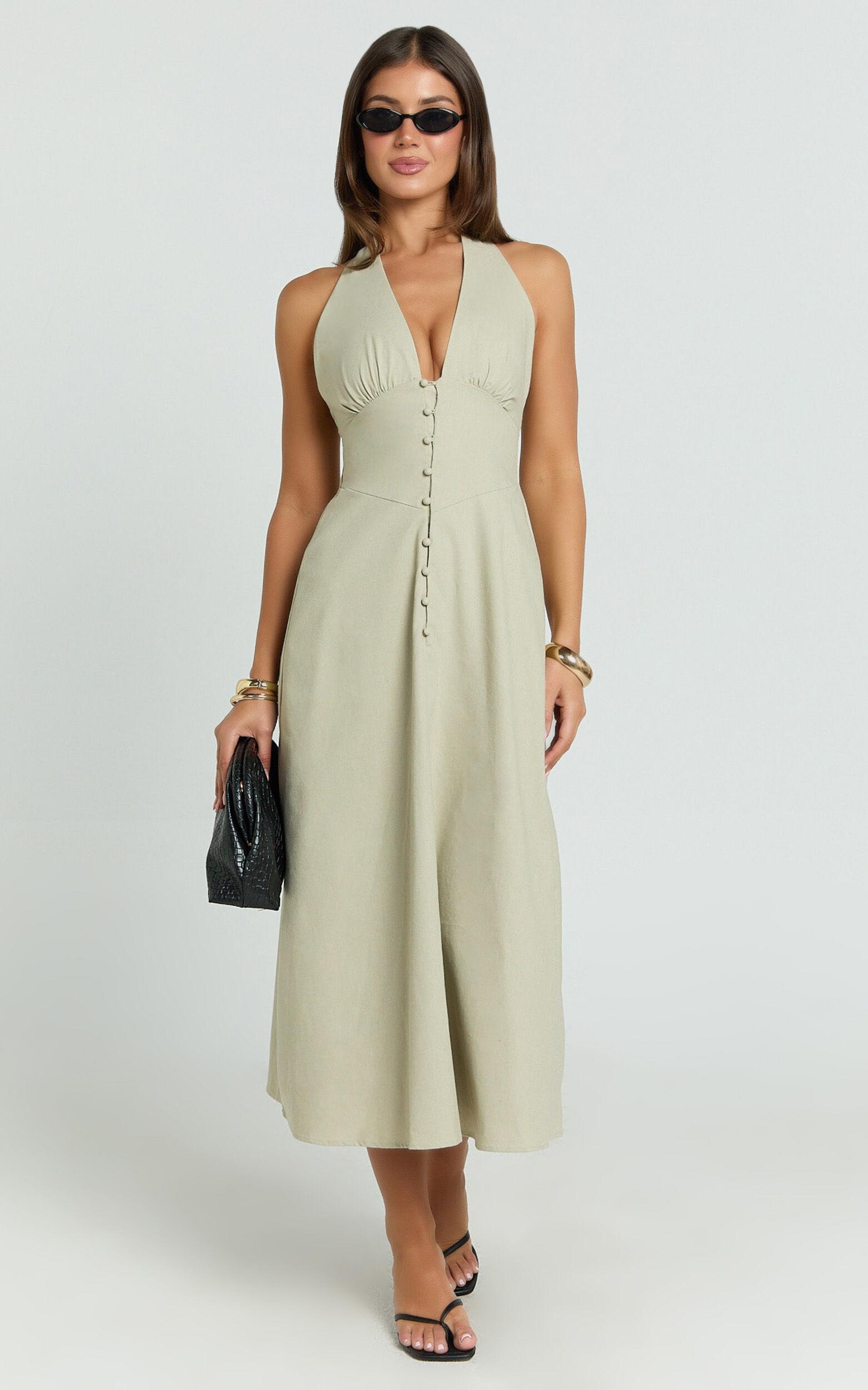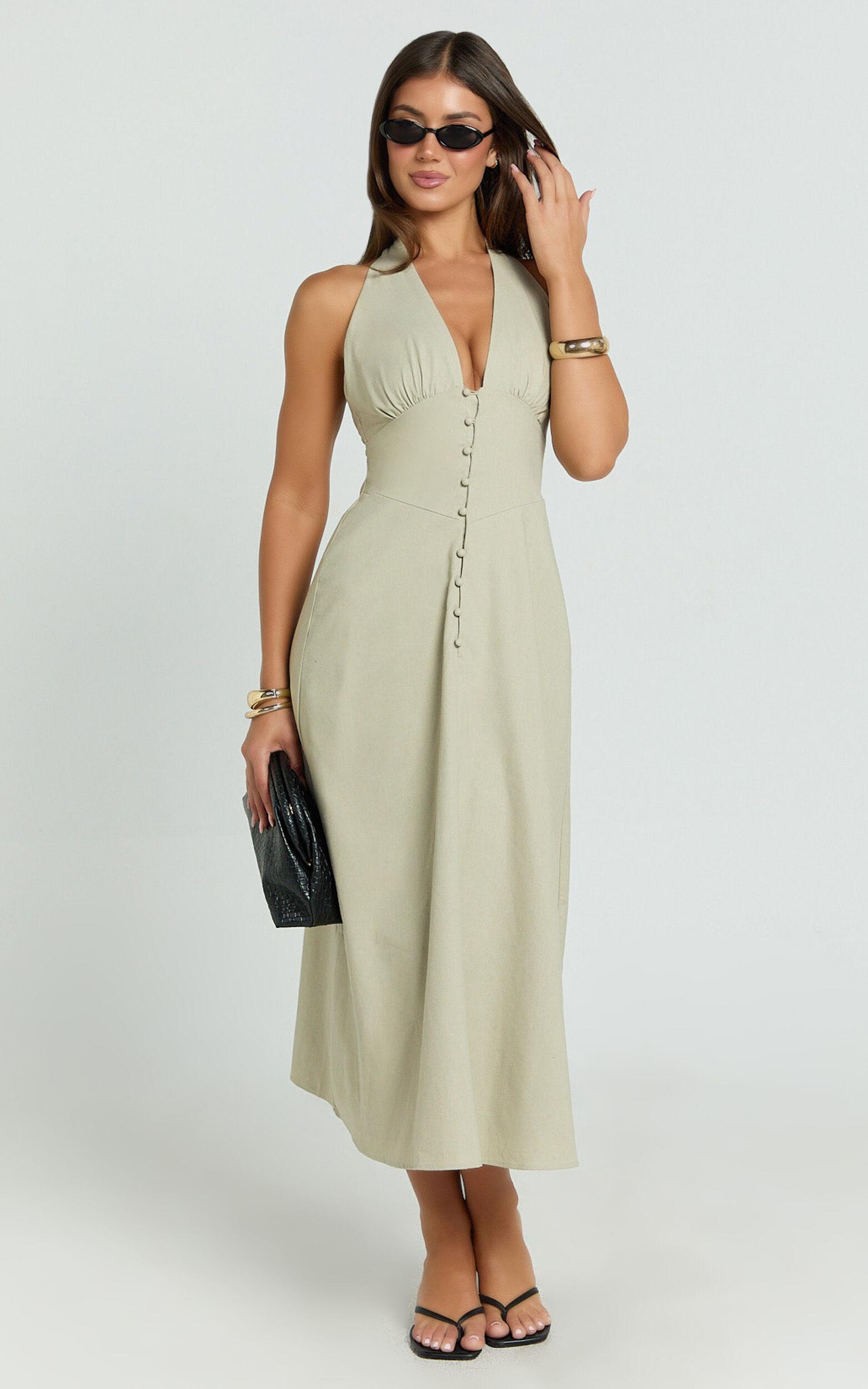 Beata Midi Dress - Plunge Halter A-Line Dress in Sage
