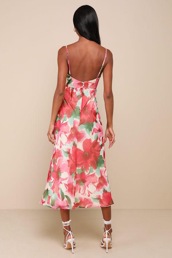 Admiring attention will always come your way in the Lulus Beautiful Entrance Fuchsia Multi Floral Twist-Front Midi Dress! Lightweight woven fabric (with a fuchsia, pink, cream, and green floral print throughout) shapes adjustable spaghetti straps that support a bodice with a twisted detail at the front. Fitted waist tops an A-line skirt that finishes at a mid hem. Hidden zipper/clasp at back.