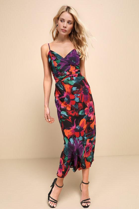 Admiring attention will always come your way in the Lulus Beautiful Entrance Multi Floral Twist-Front Midi Dress! Lightweight woven fabric, with a dramatic orange, purple, teal, and black floral print throughout, shapes adjustable spaghetti straps that support a bodice with a twisted detail at the front. Fitted waist tops an A-line skirt that finishes at a mid hem. Hidden zipper/clasp at back.