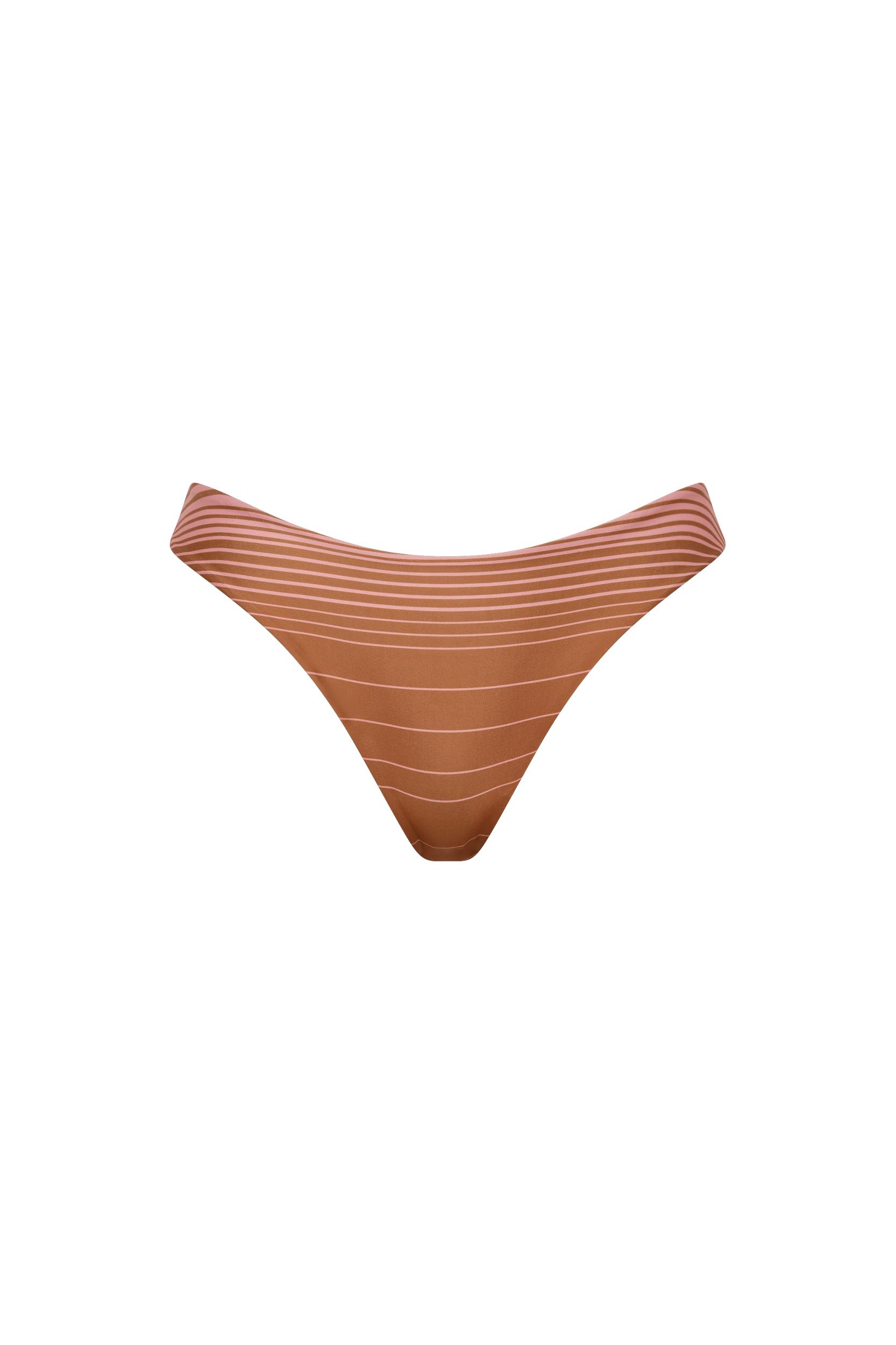 A timeless triangle bikini top with neck and back ties, both adjustable. With a slightly gathered bust, it can also slide for more or less coverage. Designed in a soft pink and caramel brown stripe with a metallic-like finish, style with the matching Bebe Bikini Bottom for your next vacation. This style is true to size and offers medium coverage. The ties allow for adjustability.