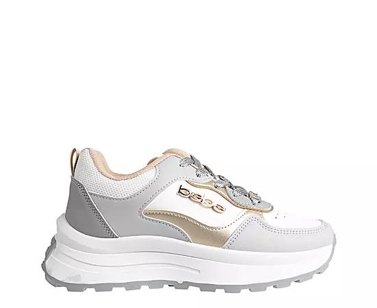 bebe Eva Womens Sneaker Grey/Multicolor Upgrade your Sneaker style with the bebe Eva Sneaker. With a color-blocked faux leather upper featuring a sleek bebe logo hardware detail, this Shoe gives a nostalgic feel with its silhouette. The heel pull tab ensures easy entry, while the Padded footbed and traction outsole offer all-day support. Synthetic upper Lace-up closure Heel pull tab Padded footbed Traction outsole