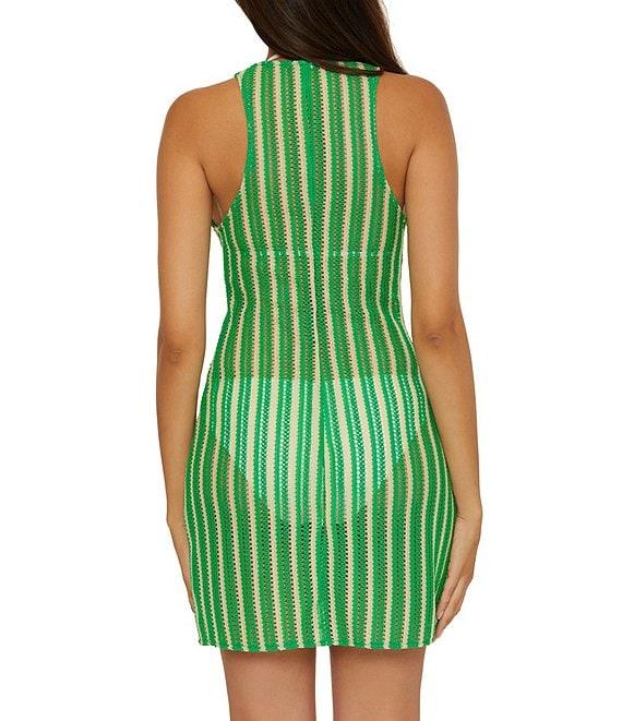 From Becca by Rebecca Virtue, this swim cover-up features: Crochet fabrication Dress silhouette Stripe print High neckline Sleeveless Unlined Straight hemline Pullover construction Approx. 34" length Polyester/spandex Hand wash Imported.