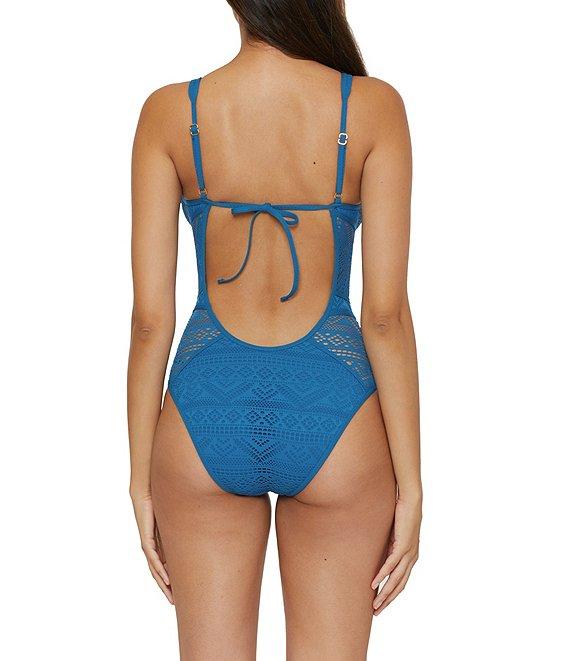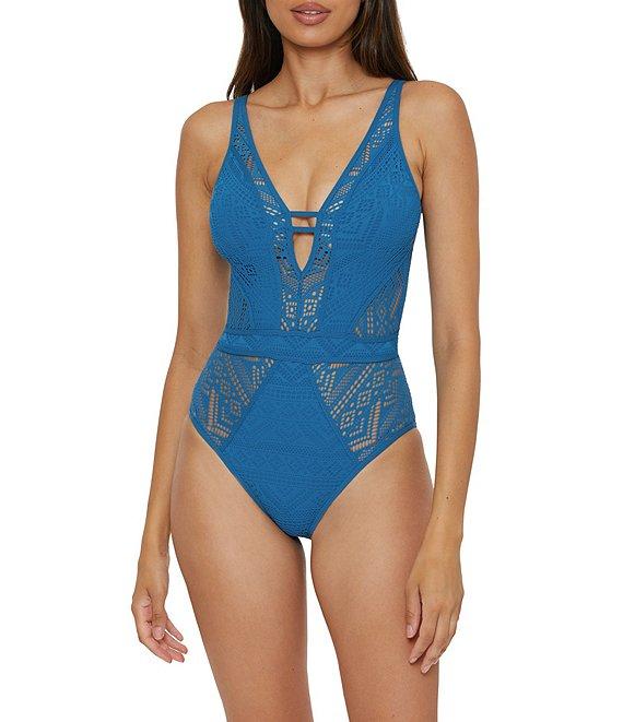 From Becca by Rebecca Virtue, this one piece swimsuit features: Stripe zig zag crochet pattern Plunge neckline Shelf with removable soft cups Adjustable straps with gold ring sliders Sheer crochet insets with binding Diagonal inset seaming Waist inset Front ladder tabs at bust Binding edging Moderate coverage Fully lined Pull-on construction Nylon/spandex Hand wash Imported.