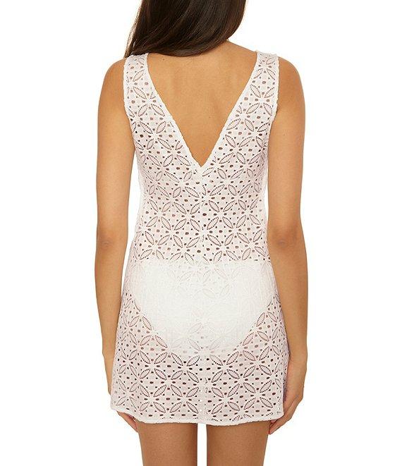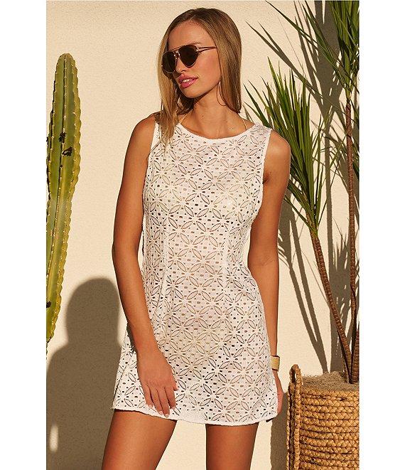 From Becca by Rebecca Virtue, this swim cover-up features: Stretch lace crochet fabrication Dress silhouette Medallion print Two way neckline Sleeveless Unlined Straight hemline Pullover construction Approx. 34" length Nylon/spandex Hand wash Imported.