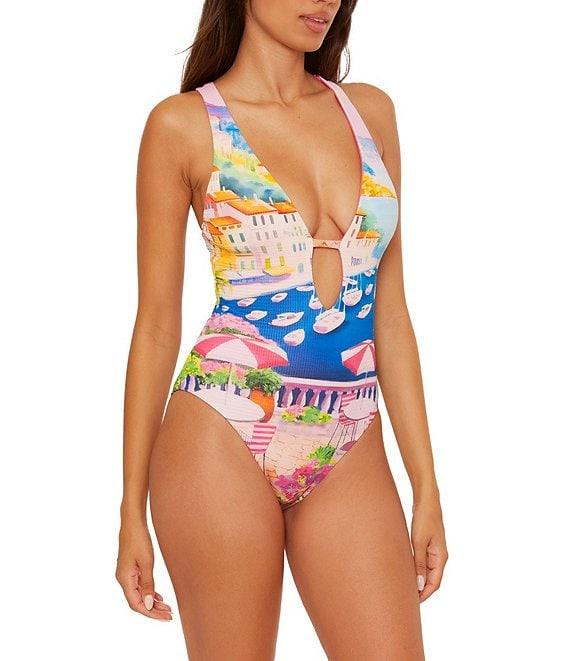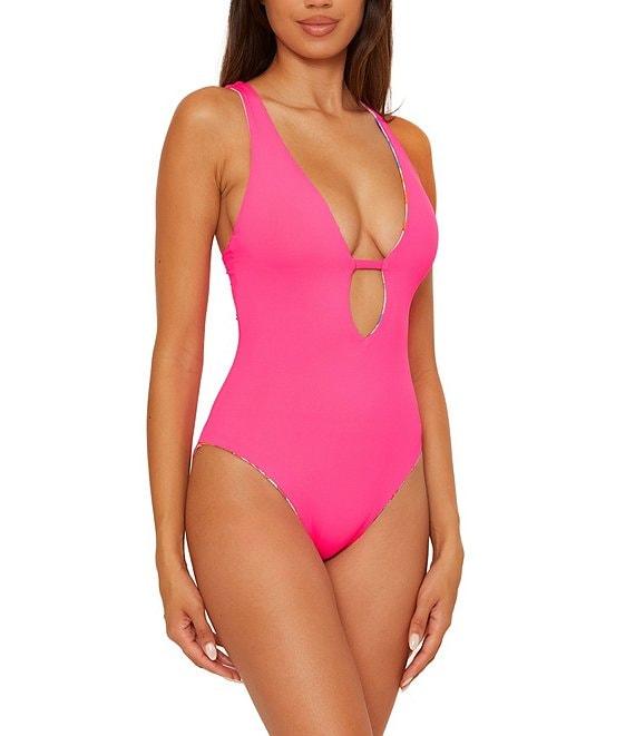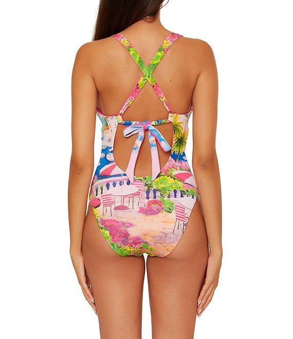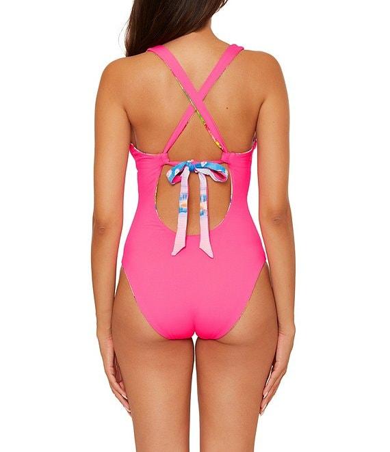 From Becca by Rebecca Virtue, this one piece swimsuit feature: Seersucker texture fabrication Plunge silhouette Reversible print Fixed halter cups Underbust elastic for support Center front tab Adjustable cross back ties Moderate coverage Fully lined Pull-on construction Nylon/spandex Hand wash Imported.