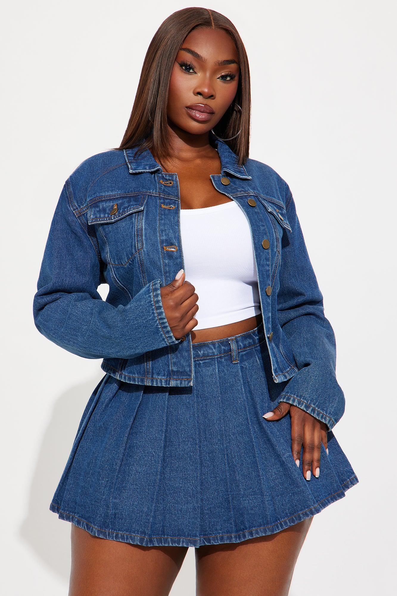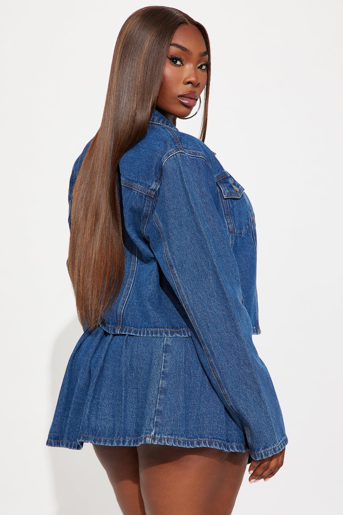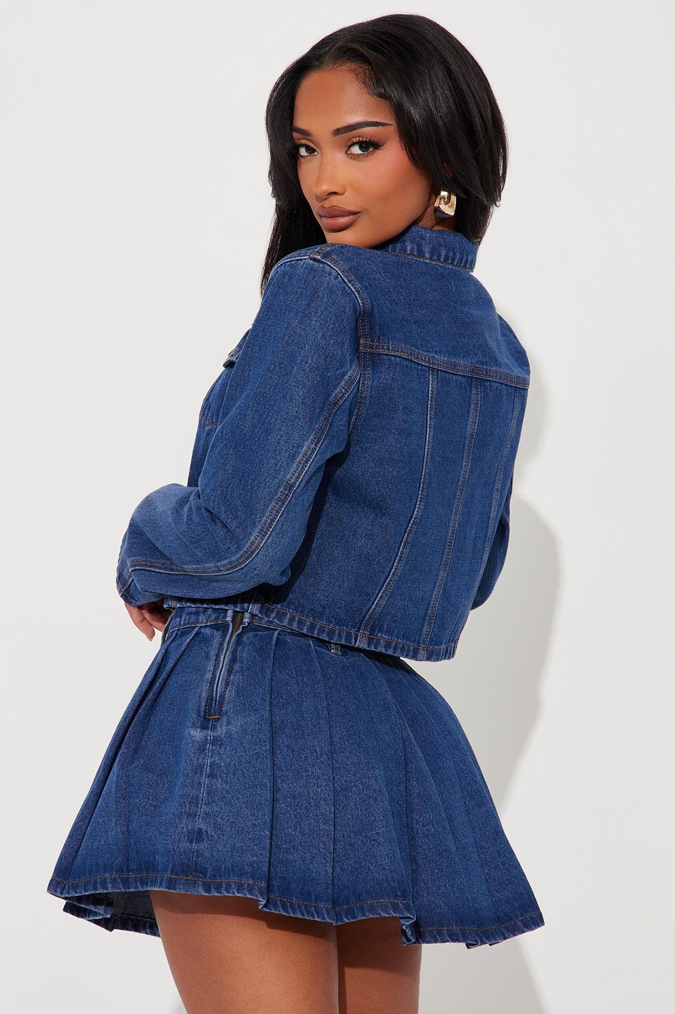 Available In Medium Wash. Long Sleeve Jacket and Pleated Skirt Set 12.5" Length Side Zip Closure Non Stretch Disclaimer: Due To The Specialized Wash Process, Each Garment Is Unique. 100% Cotton Imported California Proposition 65WARNING: Cancer and Reproductive Harm - www.P65Warnings.ca.gov.