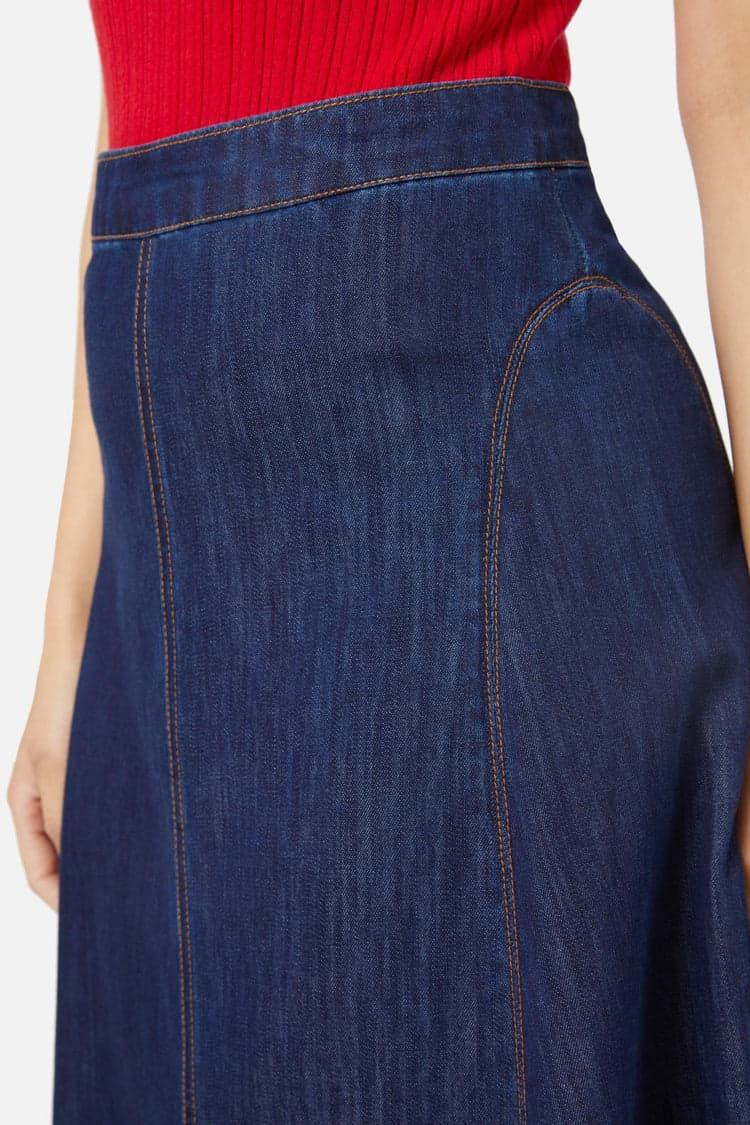 Becca Midi Skirt by Princess HighwayThe Becca Midi Skirt offers a chic, retro-inspired silhouette with its high-waisted, A-line shape and flattering curved side panels. Crafted from 100% cotton denim, this dark denim skirt features a center front seam, midi length, and a convenient back zipper with button closure.Fabric & Care:Material: 100% Cotton DenimCare Instructions:Cold machine washWash garment inside outWash separately; color will fade over timeDo not wring or spinDo not bleach or soakDo not tumble dryLine dry in shadeWarm iron on reverse if requiredDo not dry clean
