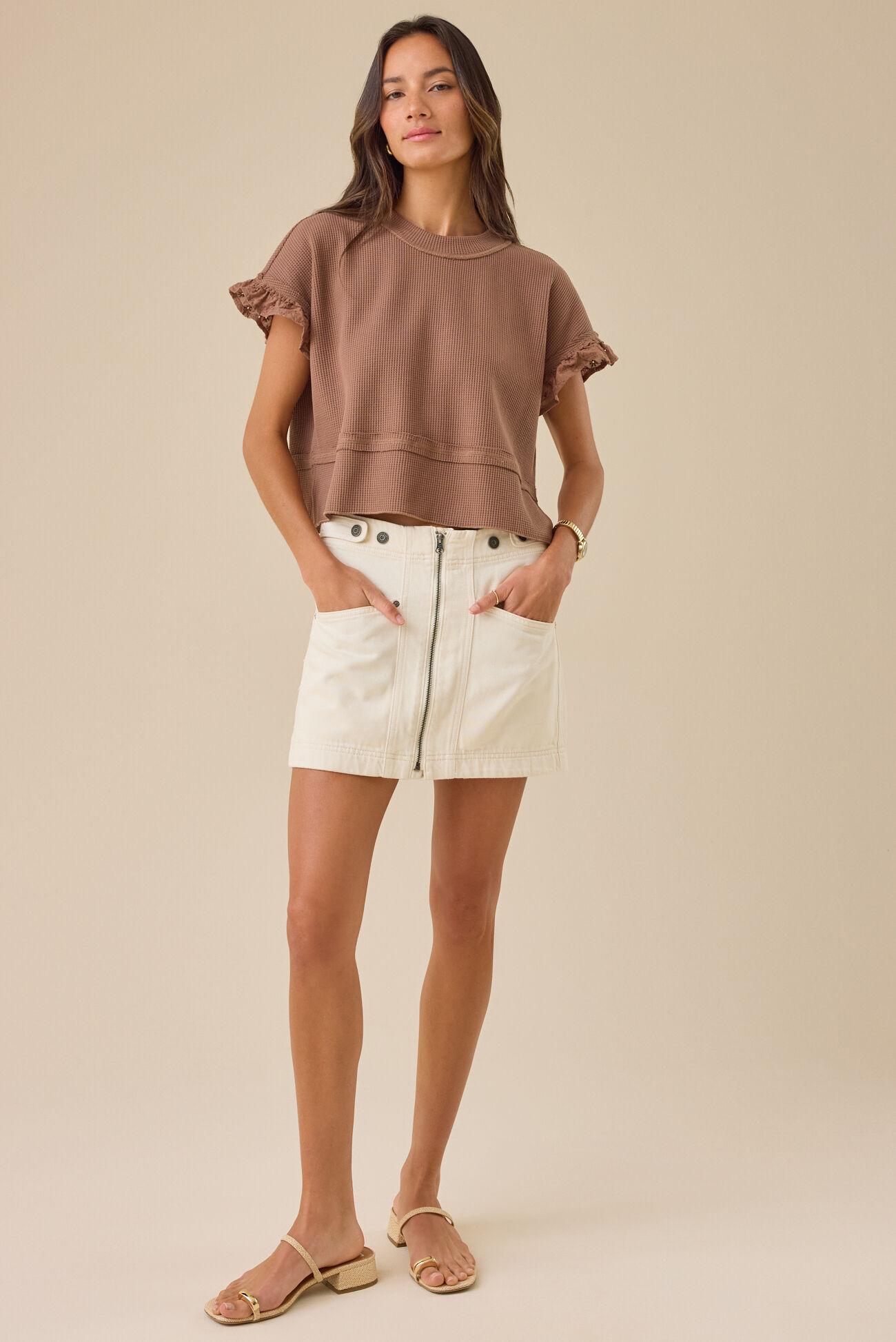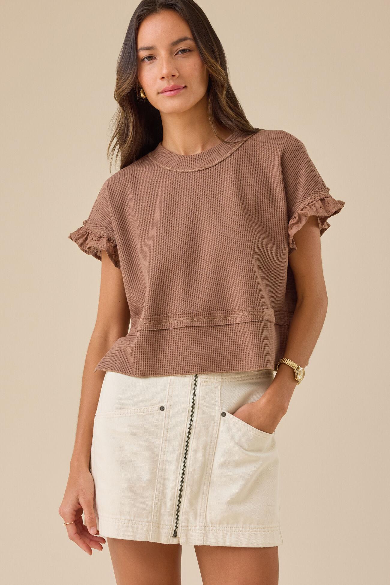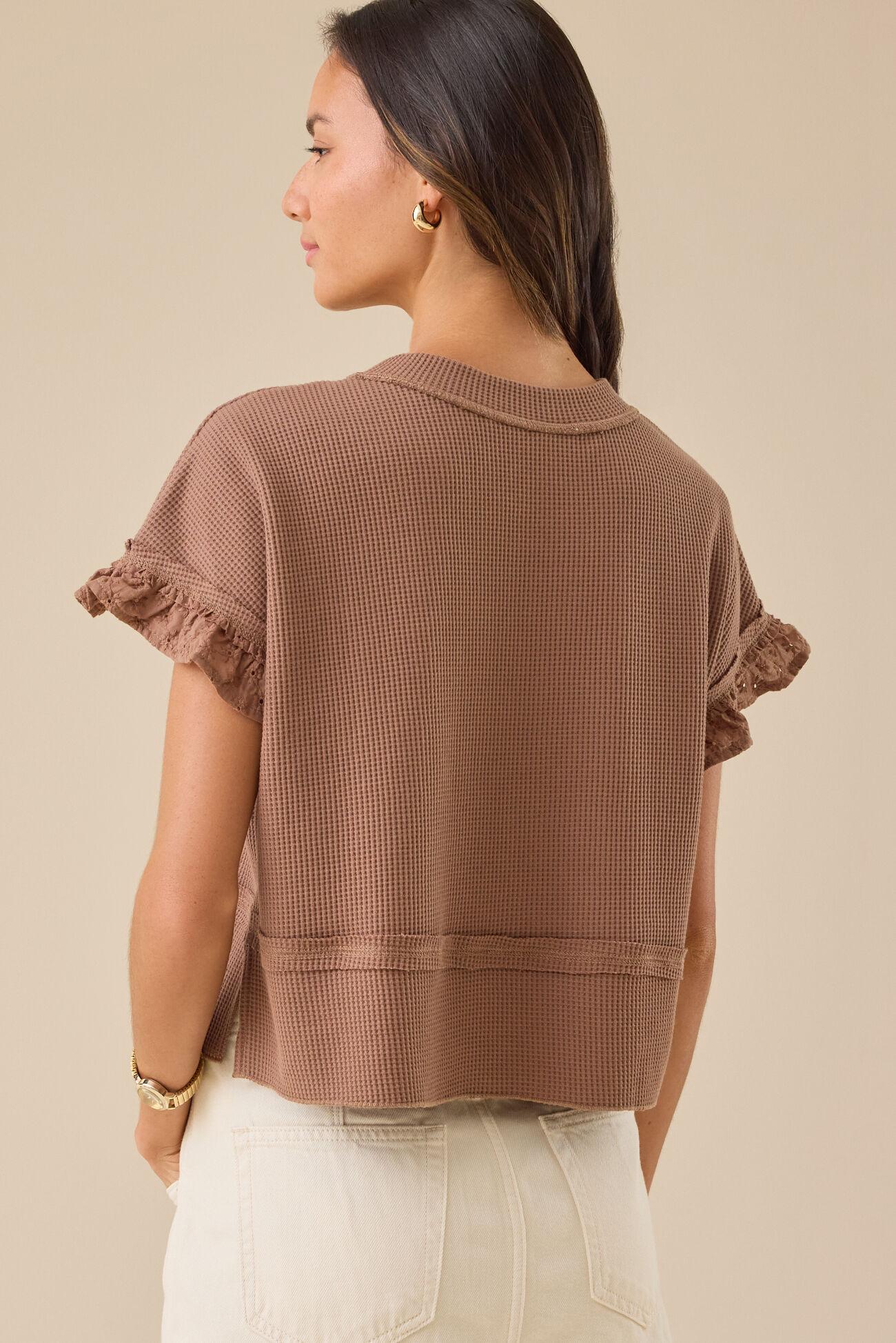 Sweet meets cozy in this Thermal Lace Top, featuring delicate lace-trimmed short sleeves, a soft thermal texture, and a relaxed boxy babydoll silhouette.