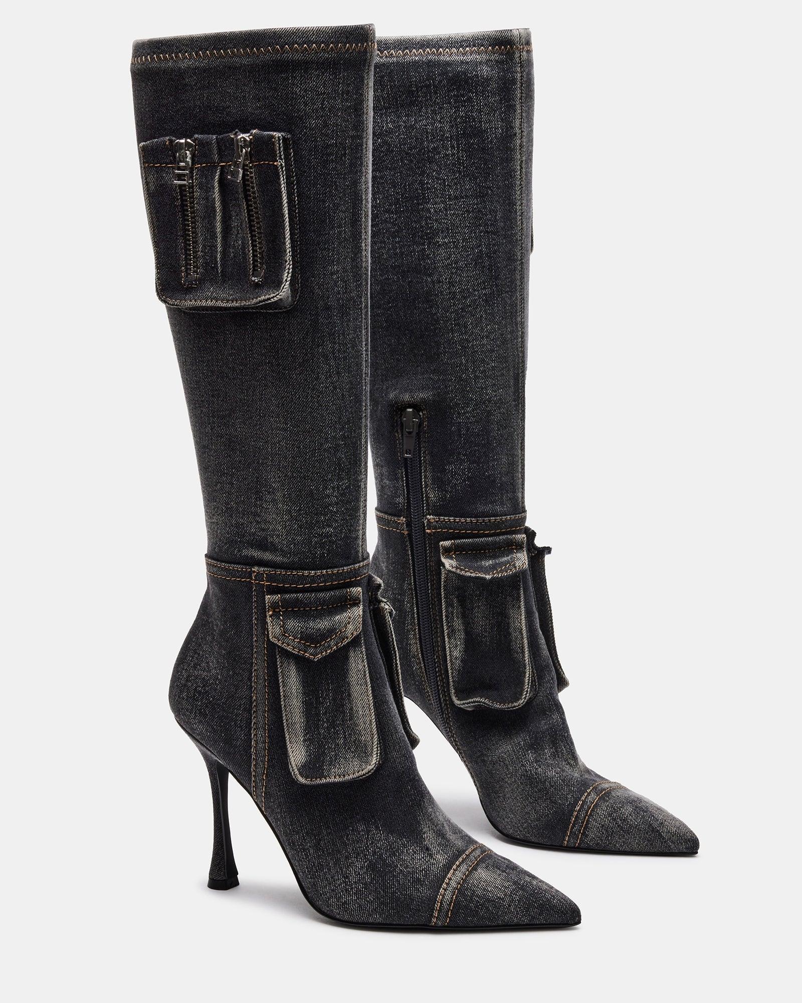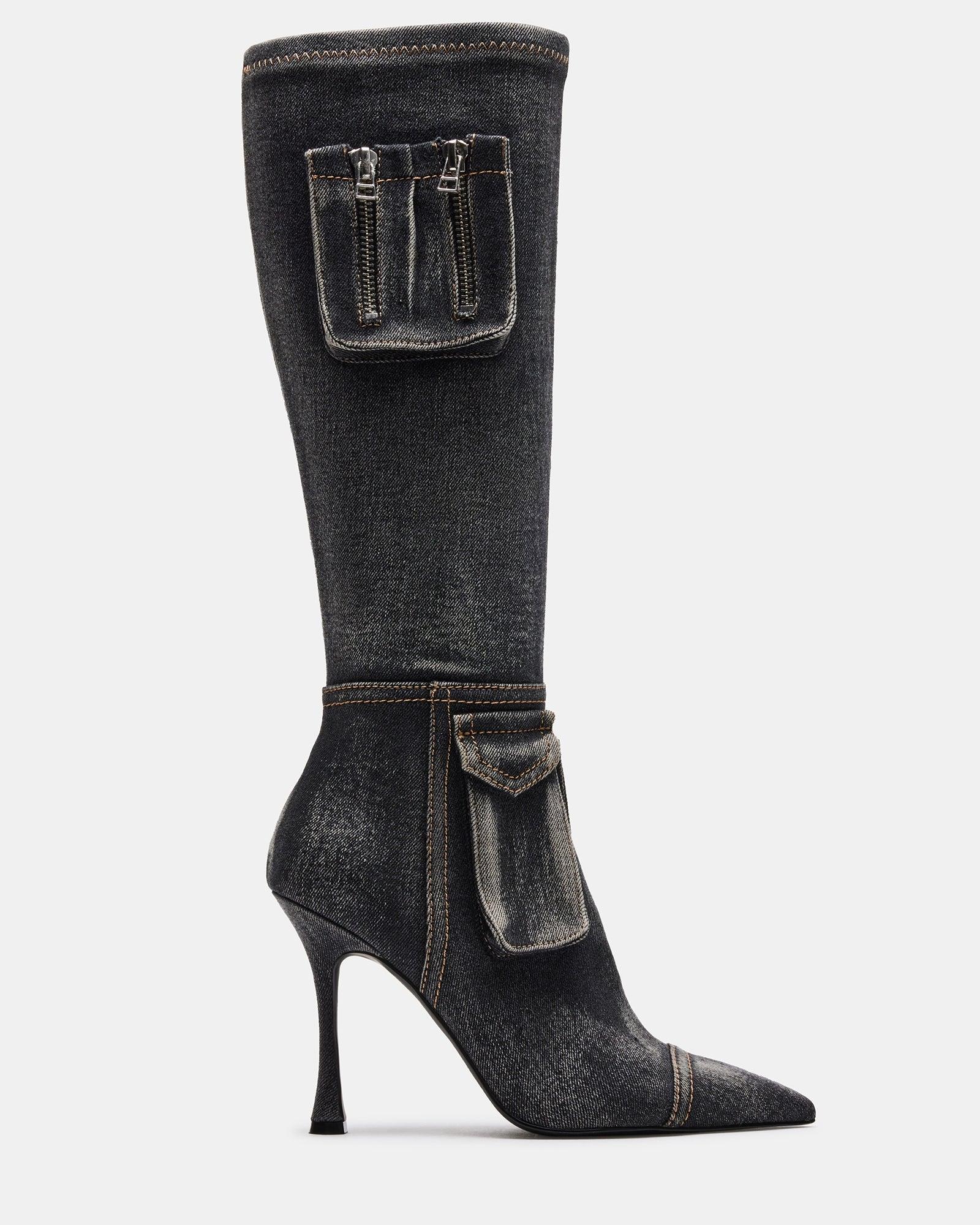 GRITTY + CLEVER + CHEEKYThe BECKHAM knee boot contrasts a sleek point toe and stiletto heel with chunky cargo pockets and substantial seams inspired by rugged denim styles Point toe stiletto knee boot with cargo pocket accents Half zipper closure at side Jeans-inspired seams and cargo pockets 3.75 inch heel height Size 6 measurements: 12 inch shaft circumference, 14 inch shaft height Size 8 measurements: 13 inch shaft circumference, 15 inch shaft height Size 10 measurements: 14 inch shaft circumference, 14.5 inch shaft height Textile upper material Textile lining Synthetic sock Synthetic sole This product is made with premium materials that are dyed and washed for special finishes. As a result, the product can vary slightly from the pictures. Imported