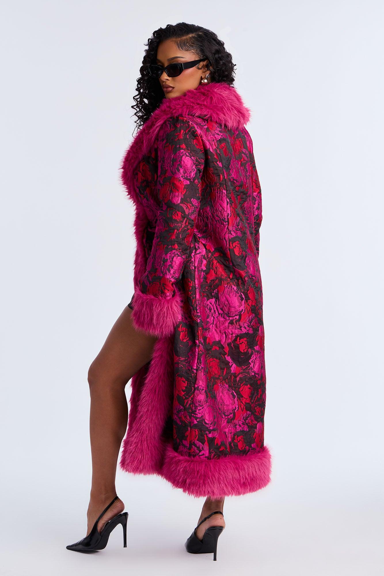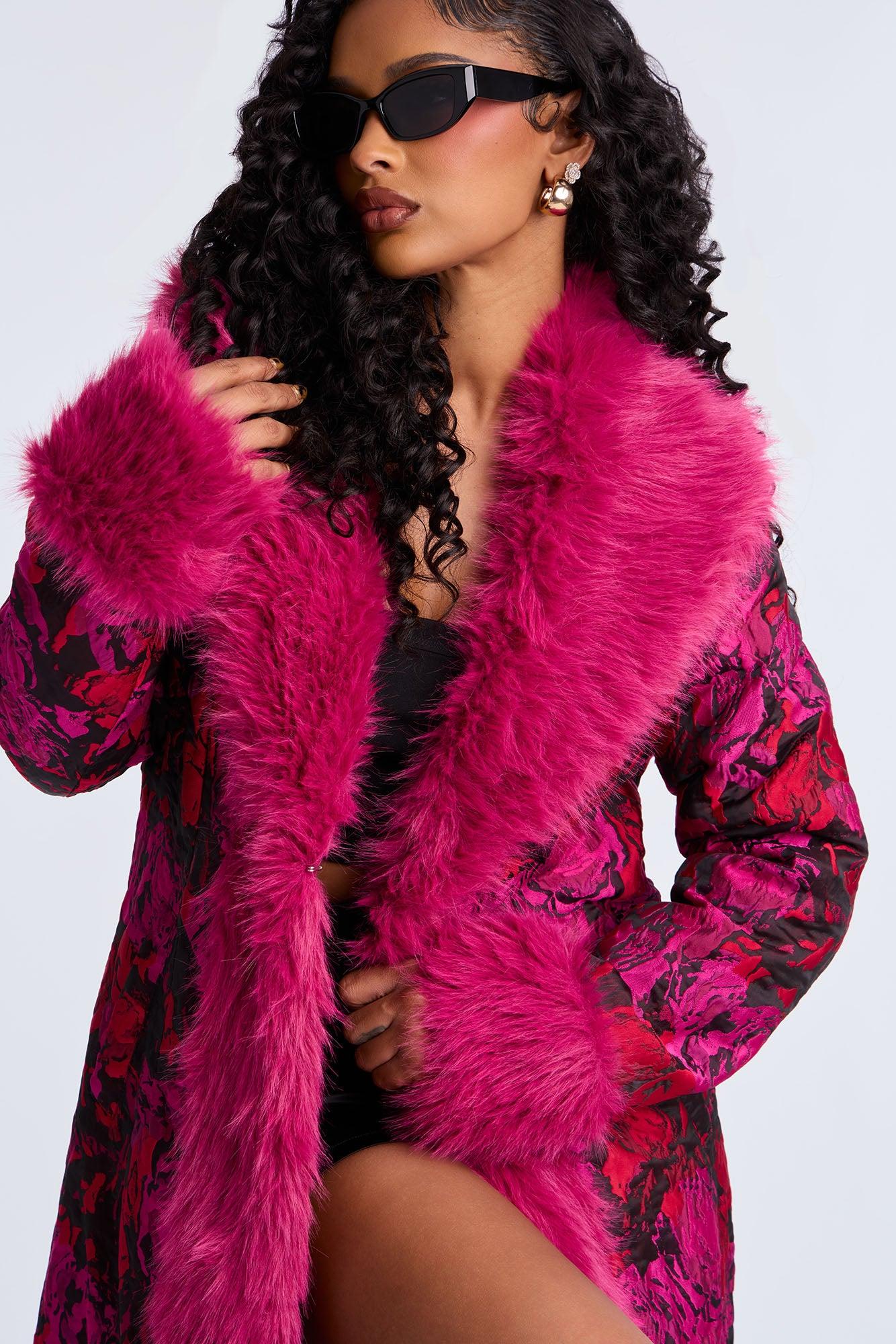 Available In Black And Magenta. Jacquard Coat Collar Neckline Long Sleeves Hook And Eye Closure Floral Print Fur Trim Fully Lined Self: 75% Polyester 25% Nylon Fur/Lining/filling: 100% Polyester Imported California Proposition 65WARNING: Cancer and Reproductive Harm - www.P65Warnings.ca.gov.