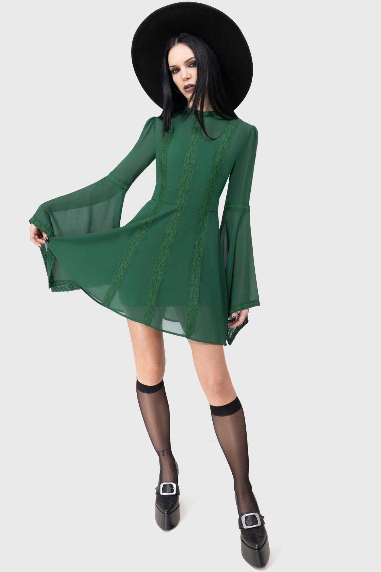 BEGONE - Non-stretch, soft-touch woven fabric.- Semi sheer.- Long flared sleeves.- Mini length.- Lace design detail.- High neck.- Zip fastening on back.- Fitted.Model is 5’8 and wears a size XS.With KILLSTAR branding, 100% polyester lining: 100% polyester.Machine wash cold (30°C) / do not bleach/ do not tumble dry/ do not iron/ do not dry clean.