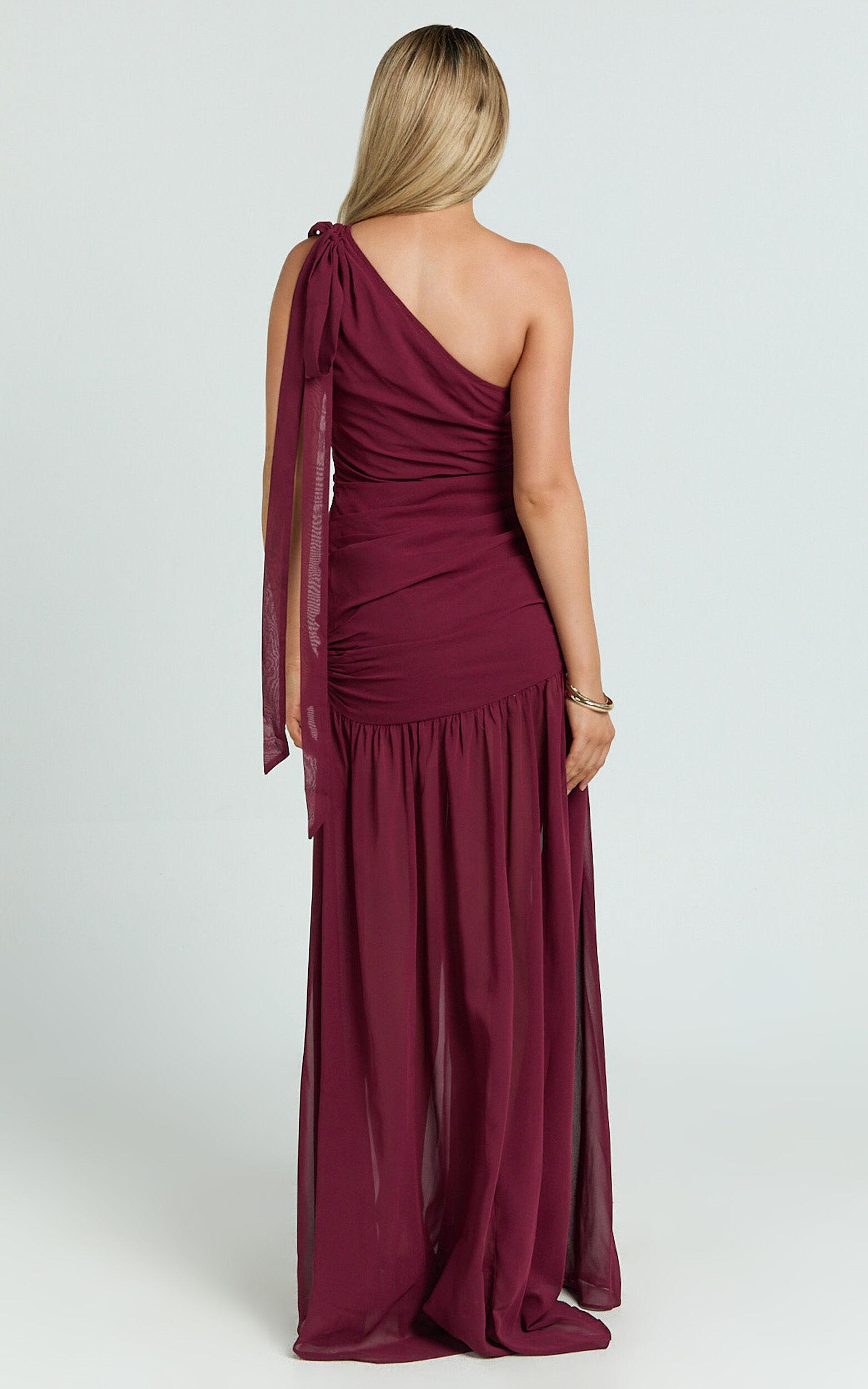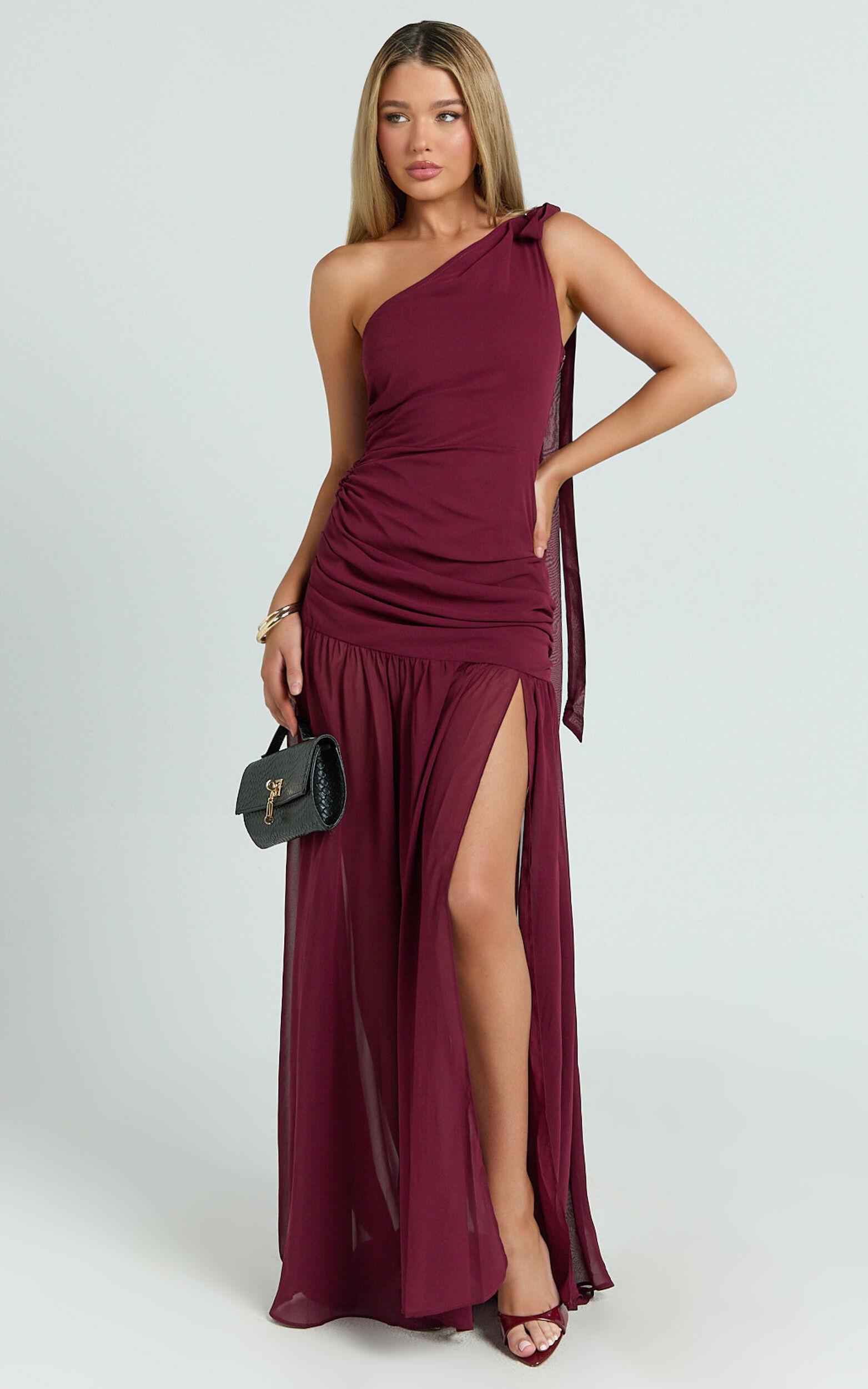 Elevate your style with our Behati Maxi Dress - One Shoulder Cut Out Fit And Flare Dress in Wine. Designed for those unforgettable formal occasions, this stunning maxi dress combines elegance and allure with its chic one shoulder neckline and flattering sleeveless design. Crafted in smooth, lightweight georgette polyester, it comfortably hugs your curves before cascading into a timeless mermaid silhouette, accentuating your figure beautifully. Whether you're attending a wedding, gala or special celebration, the Behati dress is here to empower your confidence and celebrate your unique beauty. Make a statement and dance the night away feeling incredible.Product Details:Zips closure Inner lined design Leg split detail Mermaid maxi dress One shoulder neckline Sleeveless style Formal occasion wear Georgette polyester fabricSize and FitSize S / 8 length: 152cm / 59.84inStudio model is wearing size XS / 6 AU / 2 US / 6 UK / 34 EUStudio model measurements are:Height: 172cm / 5'8''Bust: 80cm / 31''Waist: 60cm / 24''Hip: 88cm / 35''Material and CareMain Fabric: 100% Polyester Lining: 100% PolyesterNo Stretch