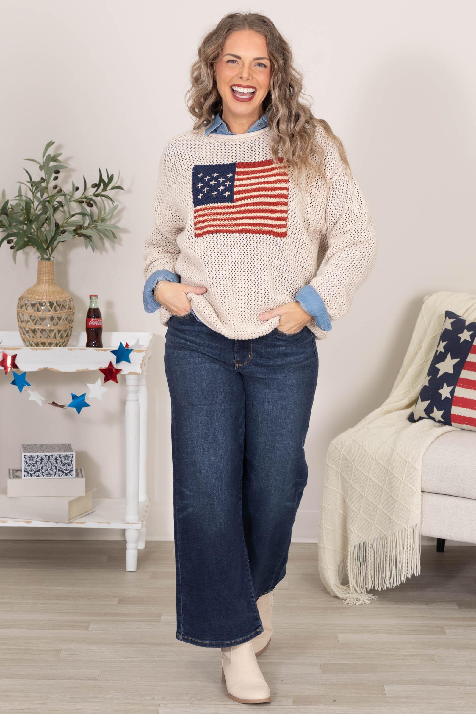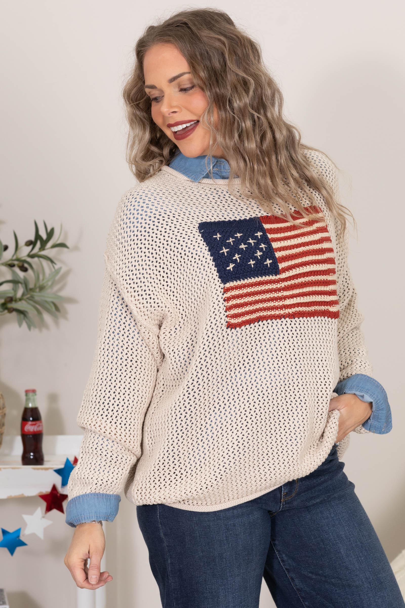 Product Details Colors: Beige, Dark Red, Navy Print: Americana Neckline: Round Sleeve: Long Sleeve Hemline: Straight Brand: Zenana Material and Care 100% Cotton Hand Wash Cold Hang/Line Dry Size and Fit Small: Bust 48" Waist 46" Length 24" Medium: Bust 50" Waist 48" Length 24.5" Large: Bust 52" Waist 50" Length 25" Erica is 5'7 and wearing a size small