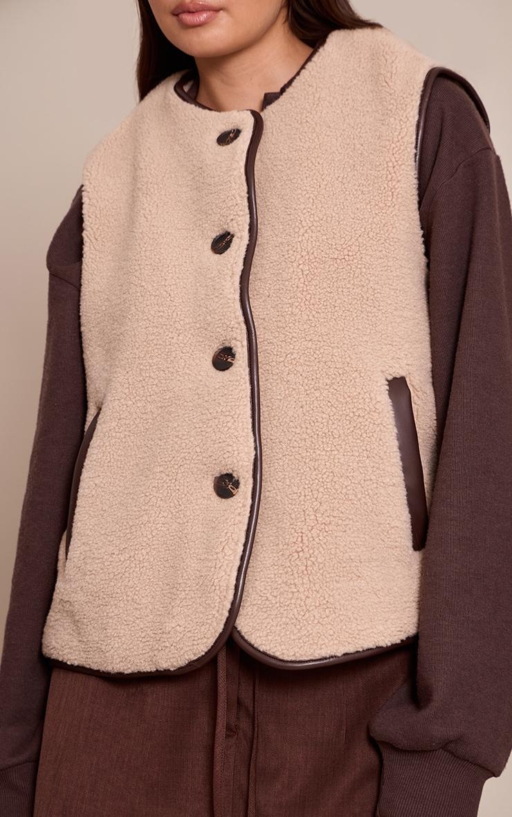 Own effortless style in this beige borg faux leather trim vest. It boasts a round neckline, button-front, and sharp faux leather trim. Perfect for effortlessly elevating everyday errands or casual outings. Style with tailored pants, a simple sweater, sleek western boots, and delicate drop earrings.Length approx 48.5cm/19inch (Based on sample size US 4)Model wears size UK 8/ EU 36/ AUS 8/ US 4Model Height - 5ft 7inchp]:!mb-4inch>Category: OuterwearProduct type: VestColor: BeigeMaterial: Faux LeatherOccasion: Day