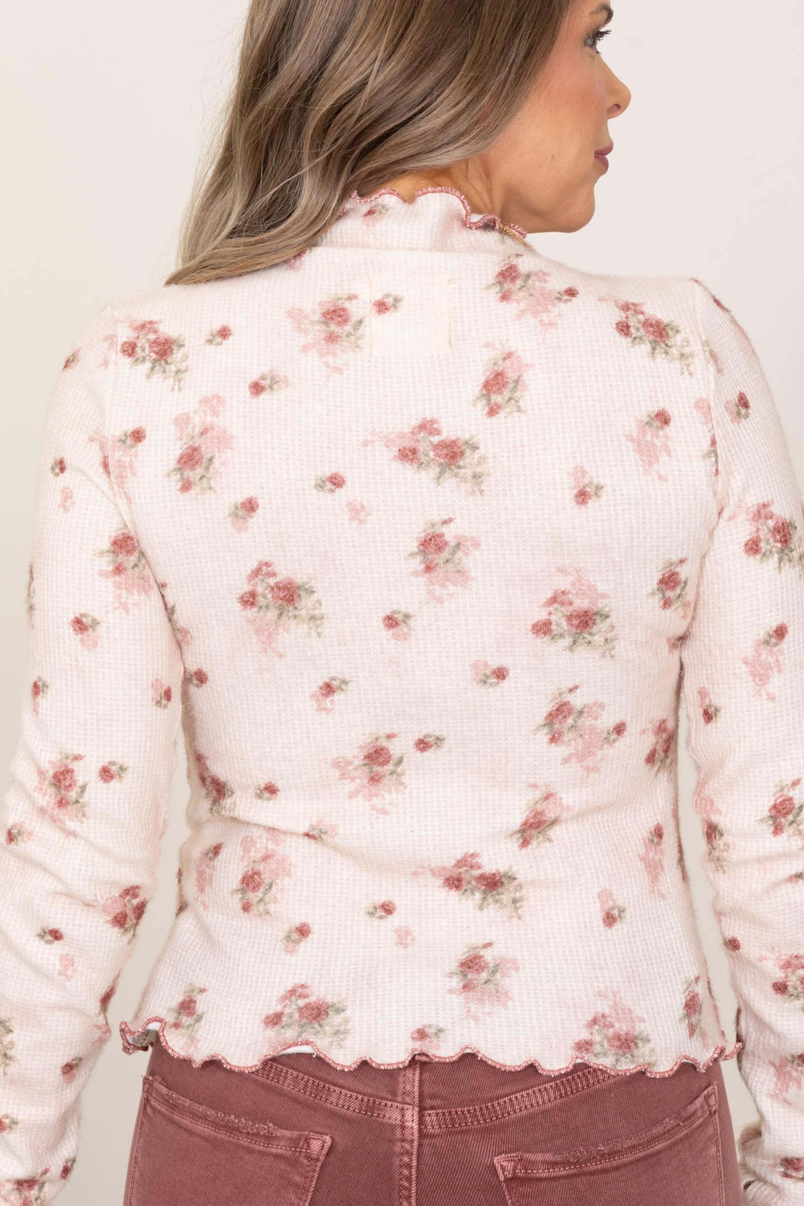 Product Details Colors: Beige, Dusty Rose, Sage Print: Floral Neckline: Mock Neck Sleeve: Long Sleeve Hemline: Ruffled Hem Brand: LovLov Material and Care Shell: 100% Polyester Machine Wash Cold Hang/Line Dry Size and Fit Small: Bust 36" Waist 30" Length 23" Medium: Bust 38" Waist 32" Length 23.5" Large: Bust 40" Waist 34" Length 24" X Large: Bust 42" Waist 36" Length 24.5" Erica is 5’7” and wearing her true size small
