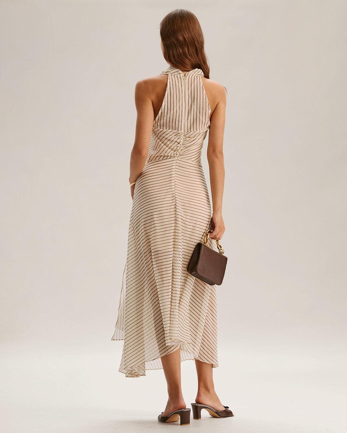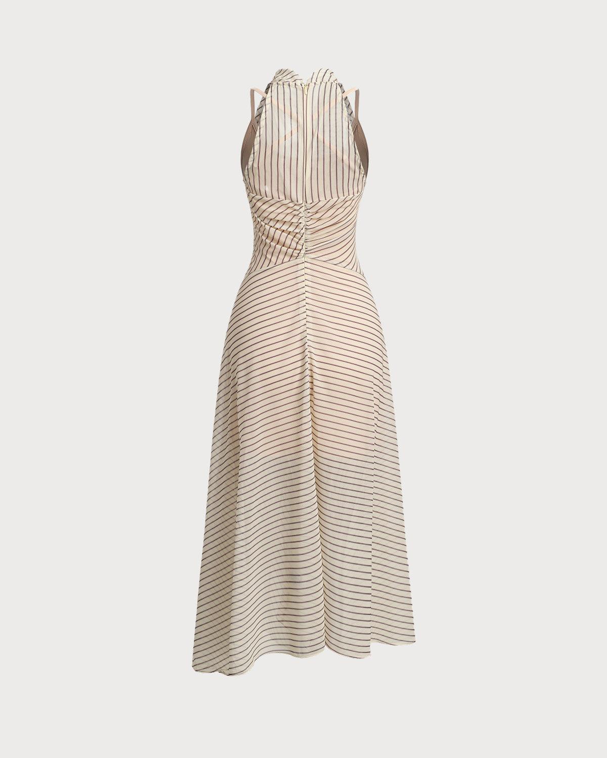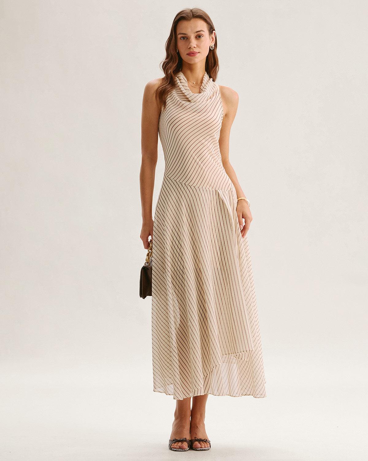 Beige Striped Cowl Neck Sleeveless Midi Dress