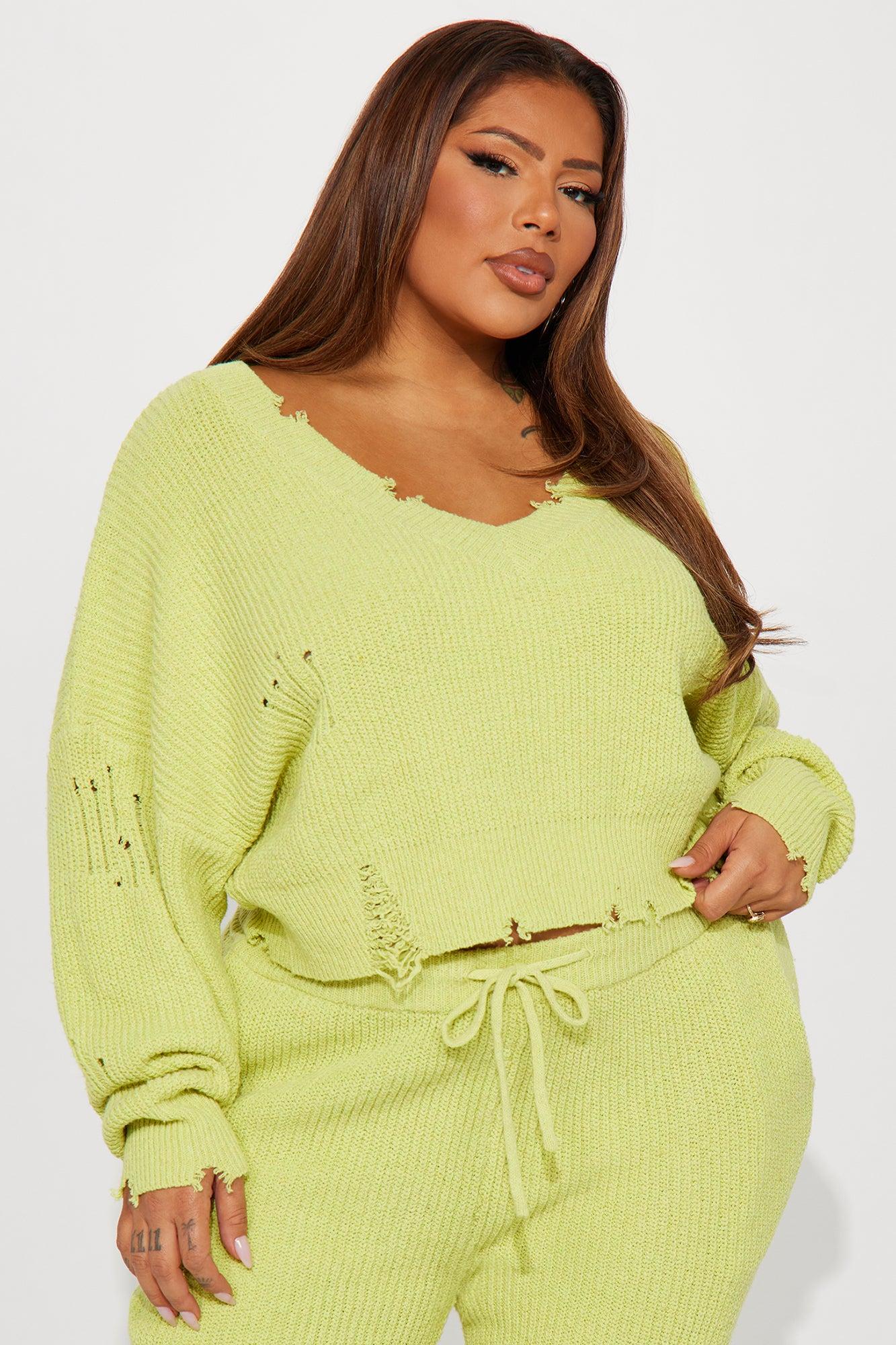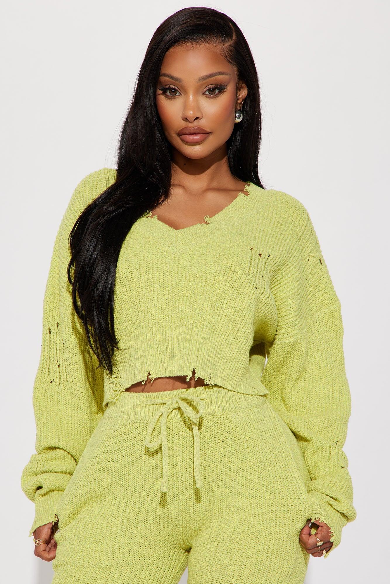 Available In Chartreuse And Charcoal. Sweater Pant Set Long Sleeve V-Neck Distressed Detail Jogger Drawstring Elastic Waistband Stretch Disclaimer: Due To The Specialized Distressing Process, Each Garment Is Unique 90% Polyester 10% Nylon Imported