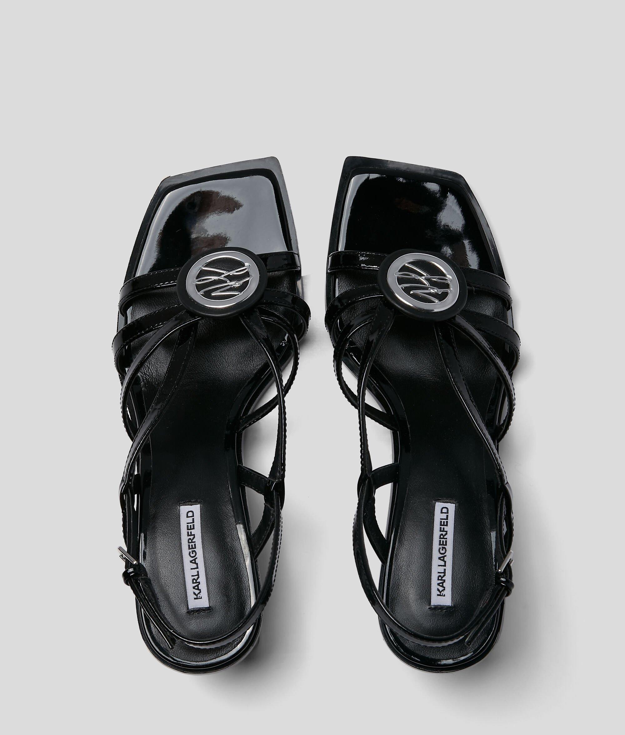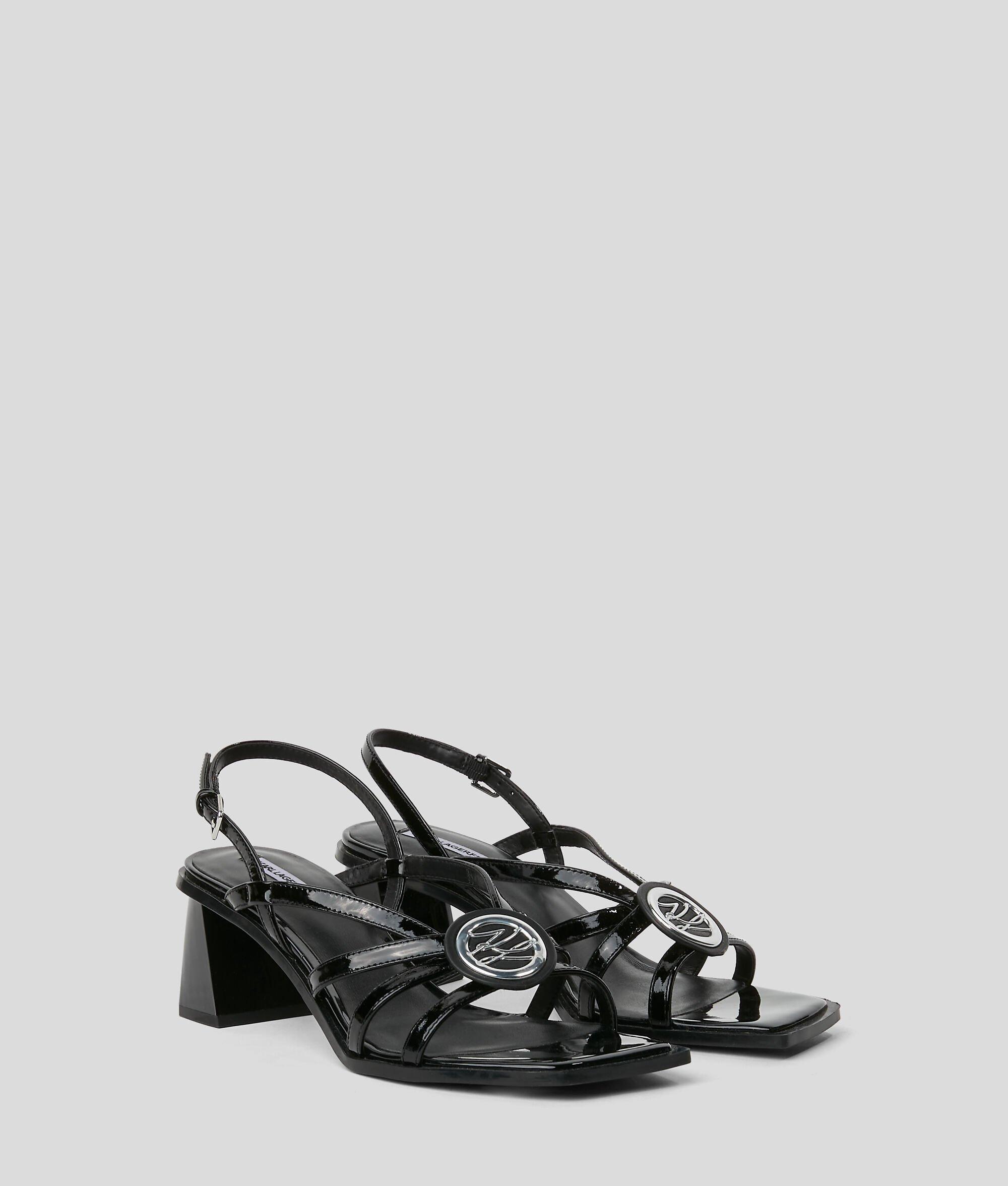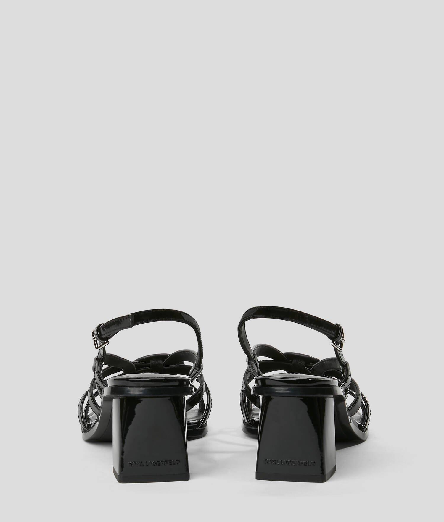 Intricate leather straps intertwine in these captivating heeled sandals. The stacked heel adds a touch of elevation, while the padded footbed and adjustable ankle strap ensure all-day comfort. A distinctive KARL Autograph patch enhances the unique charm.