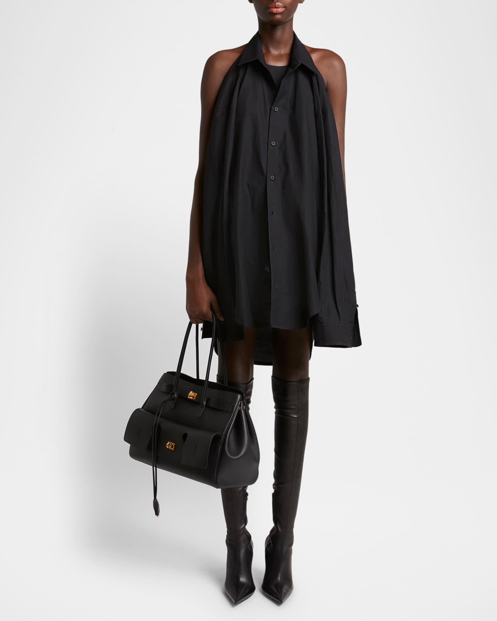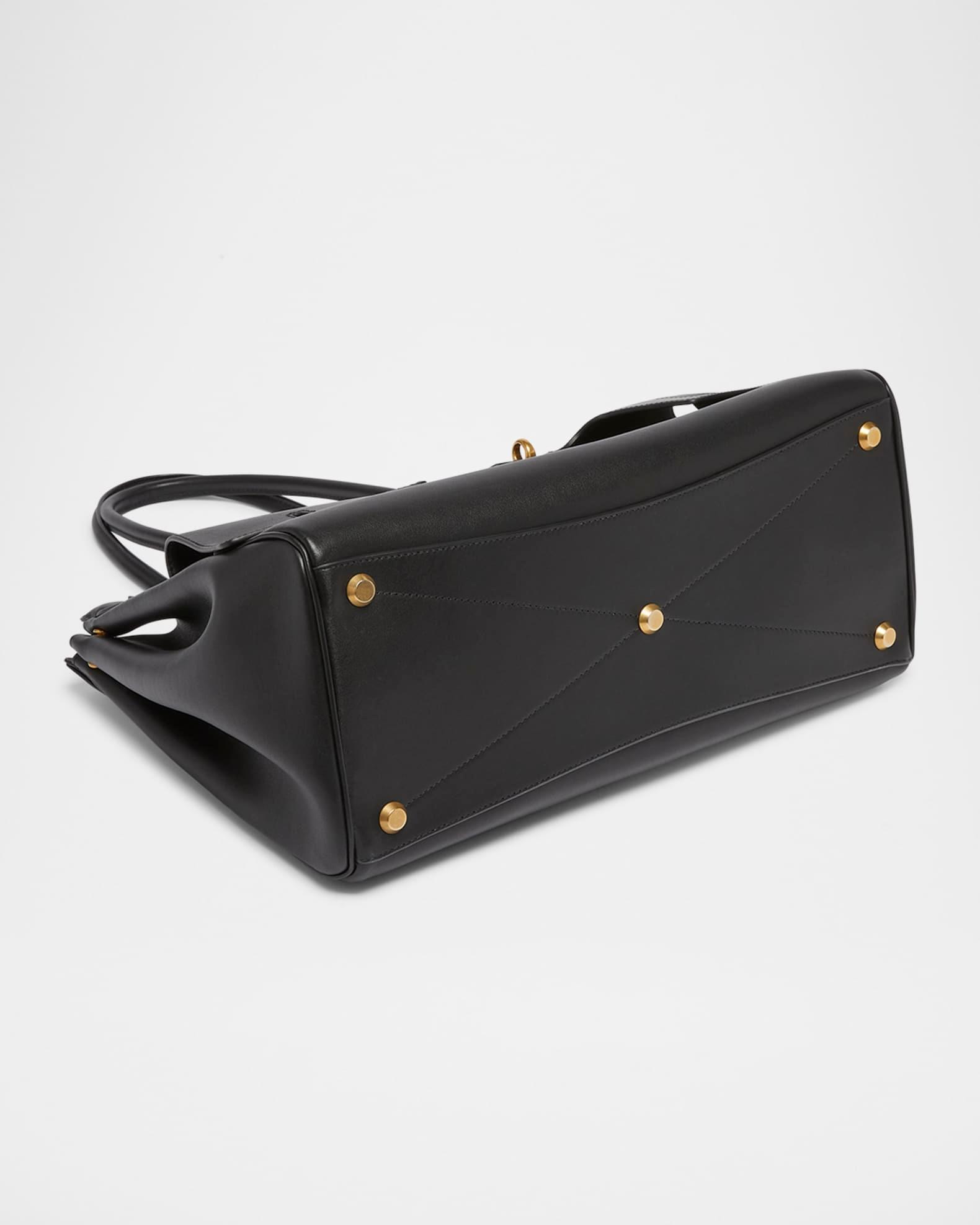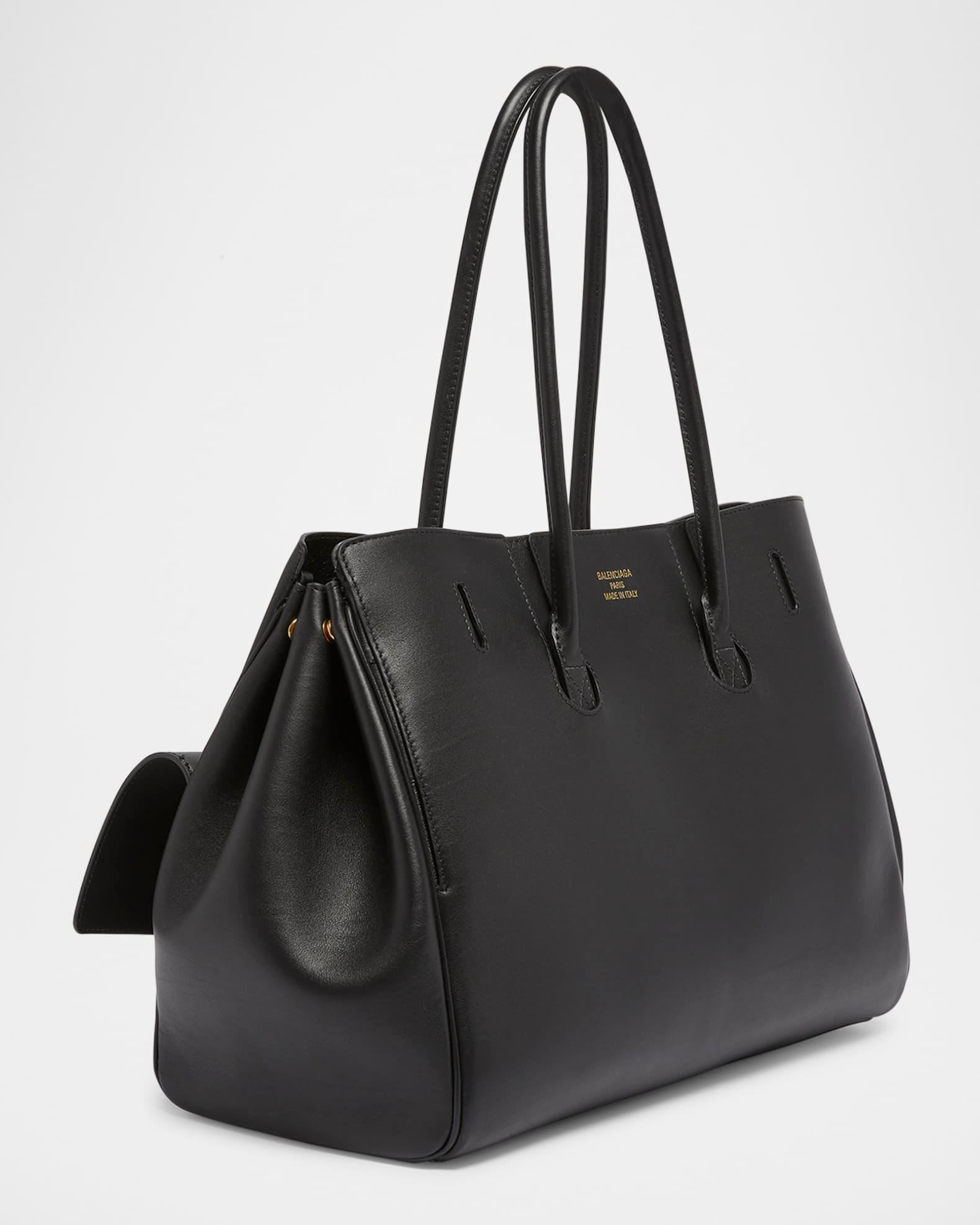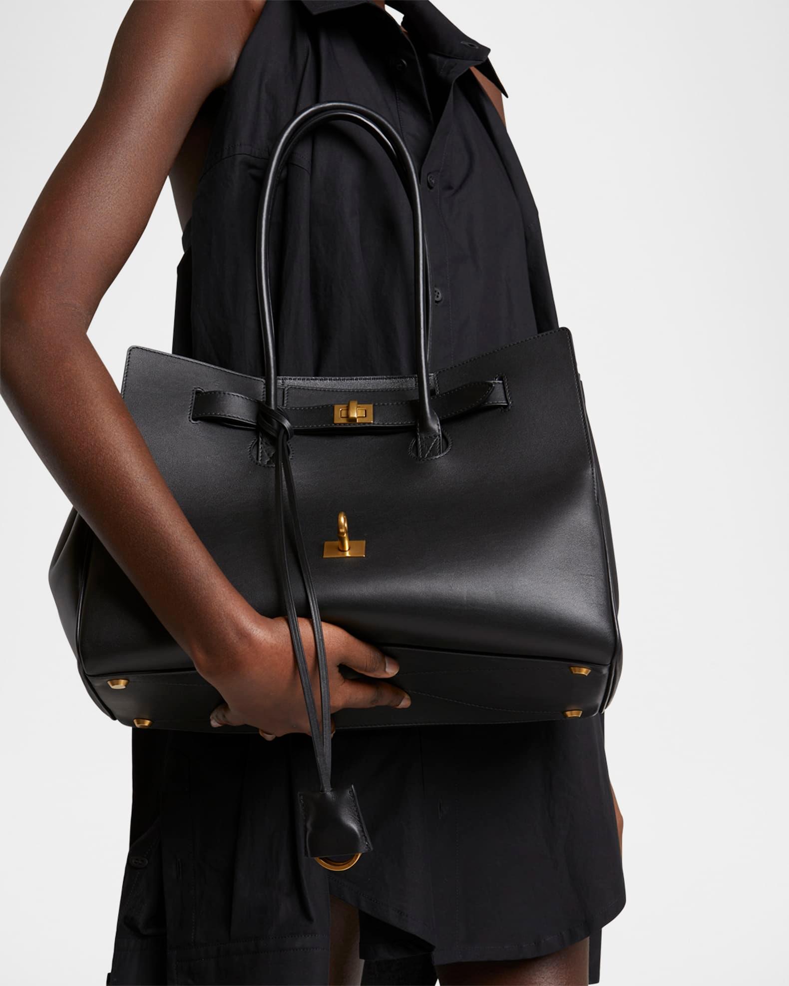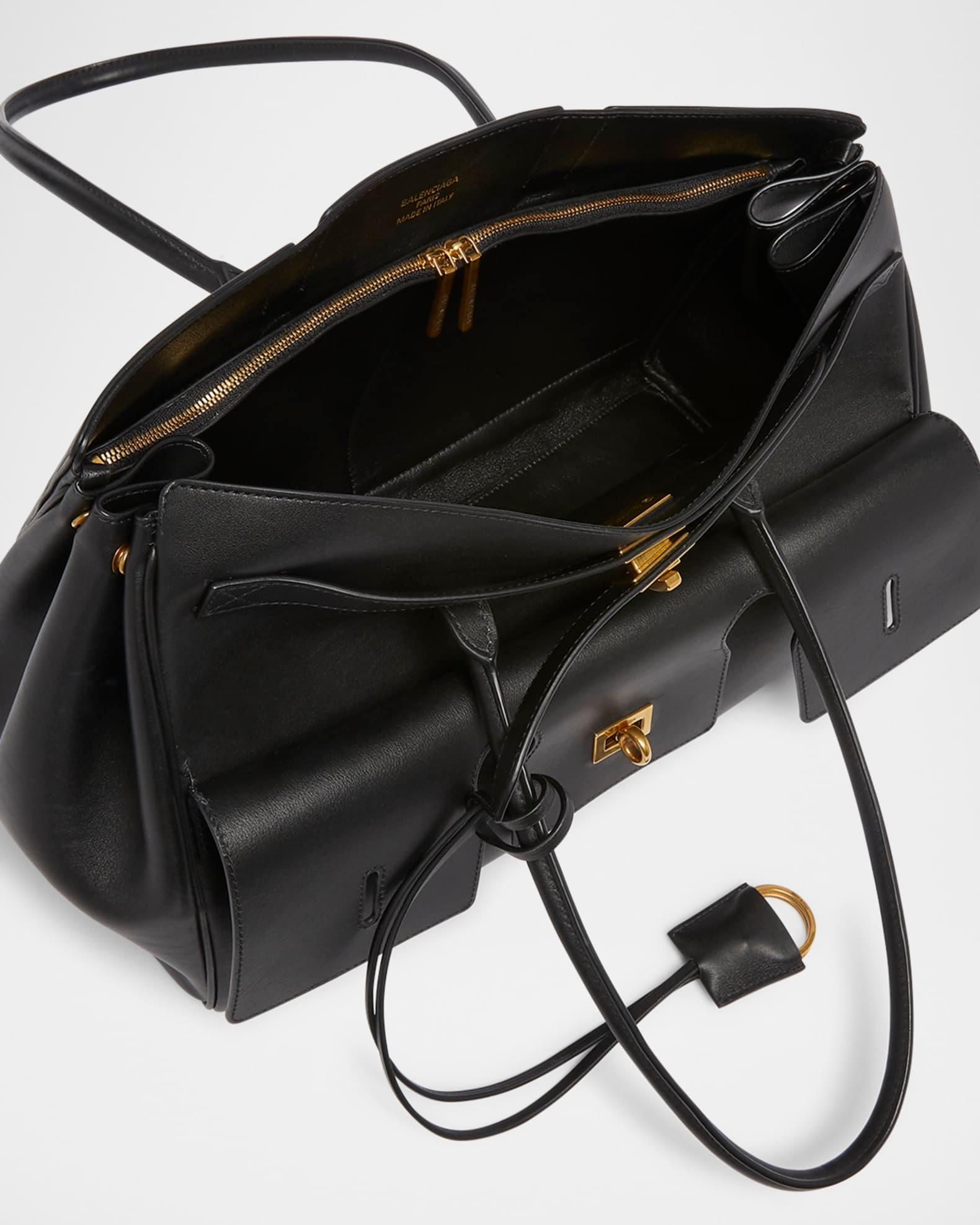 Balenciaga "Bel Air" tote bag in calfskin leather Rolled top handles with tag Open top with center turn-lock straps Exterior, front flap with turn-lock closure Interior, two zip pockets Feet protect bottom of bag Approx. 11.4"H x 10.2"W x 6.3"D Wipe clean Made in Italy