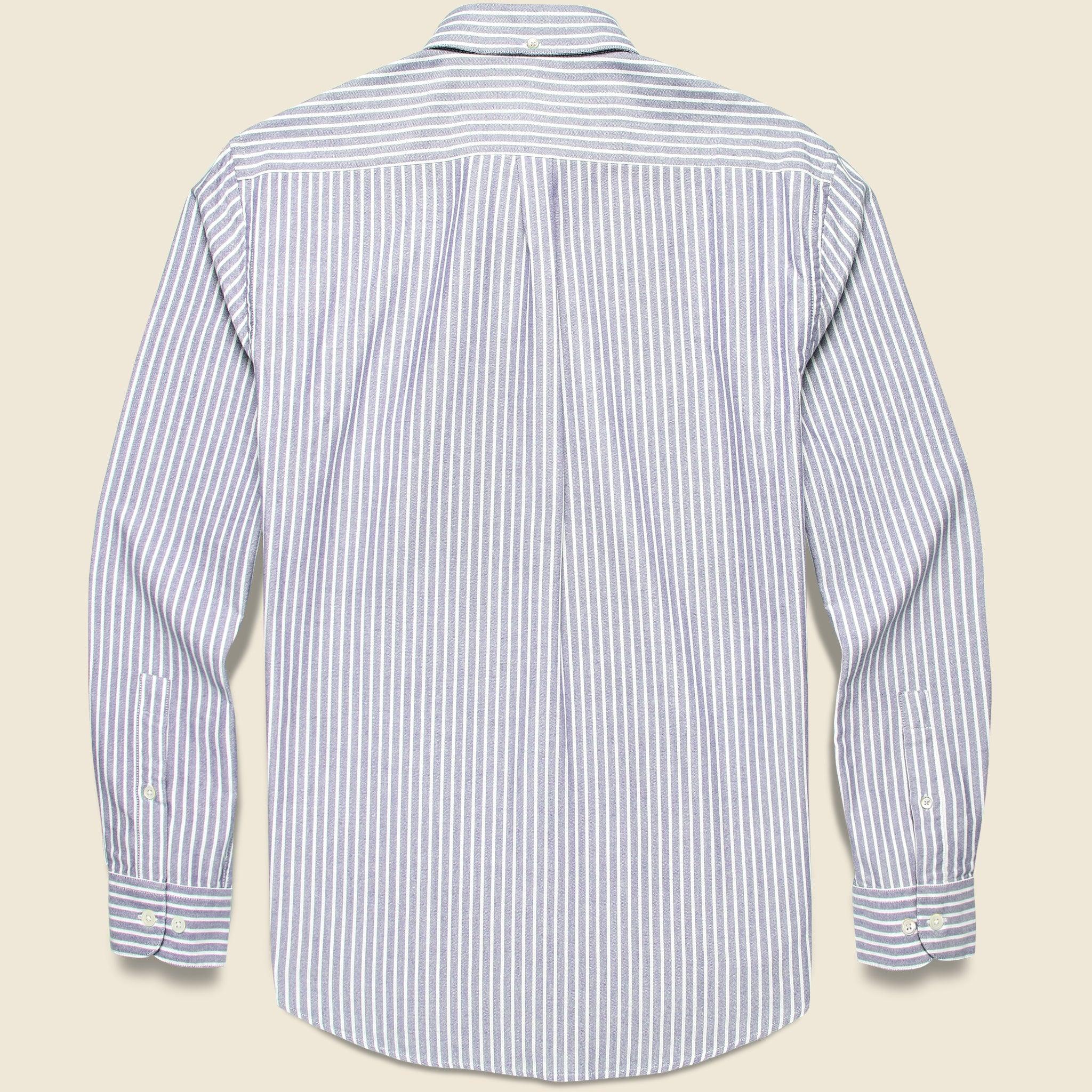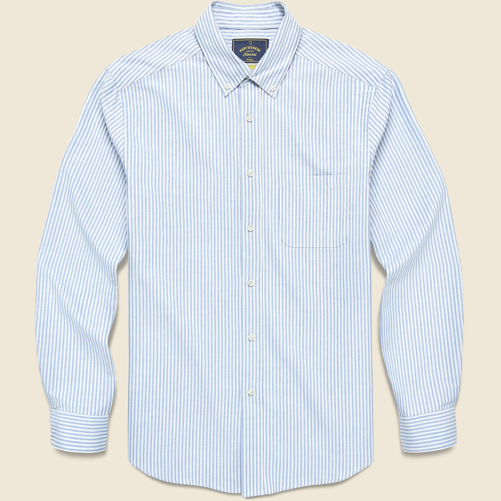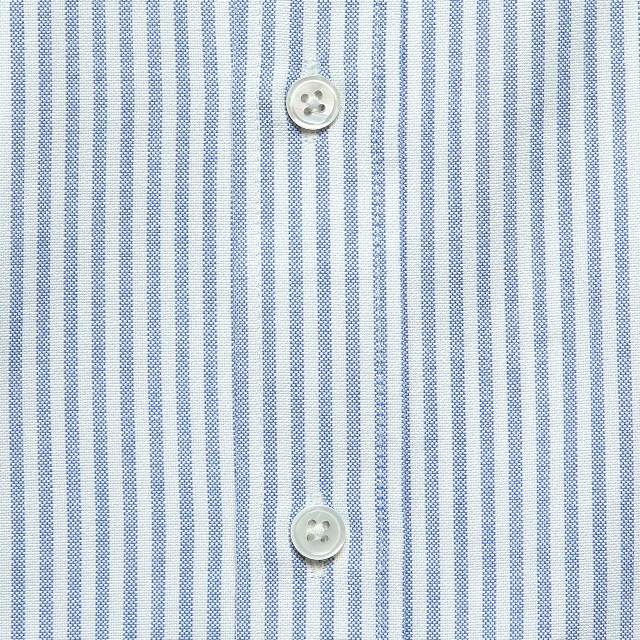 The Belavista Shirt from Portuguese Flannel is made from soft and sturdy cotton Oxford cloth and tailored with a traditional fit for everyday comfort. It’s woven with a vertical stripe pattern and topped with a button-down collar, single chest pocket, and genuine mother-of-pearl buttons for a classic finish. Soft and sturdy cotton oxford Button-down collar Single chest pocket Mother-of-pearl buttons Slightly curved hem Traditional fit that runs true to size We recommend taking your normal size or taking one size up for a more relaxed fit Materials: 100% cotton The following measurements are for size Medium: Chest: 43” | Shoulder: 17 ½” | Sleeve: 33” | Length: 30”