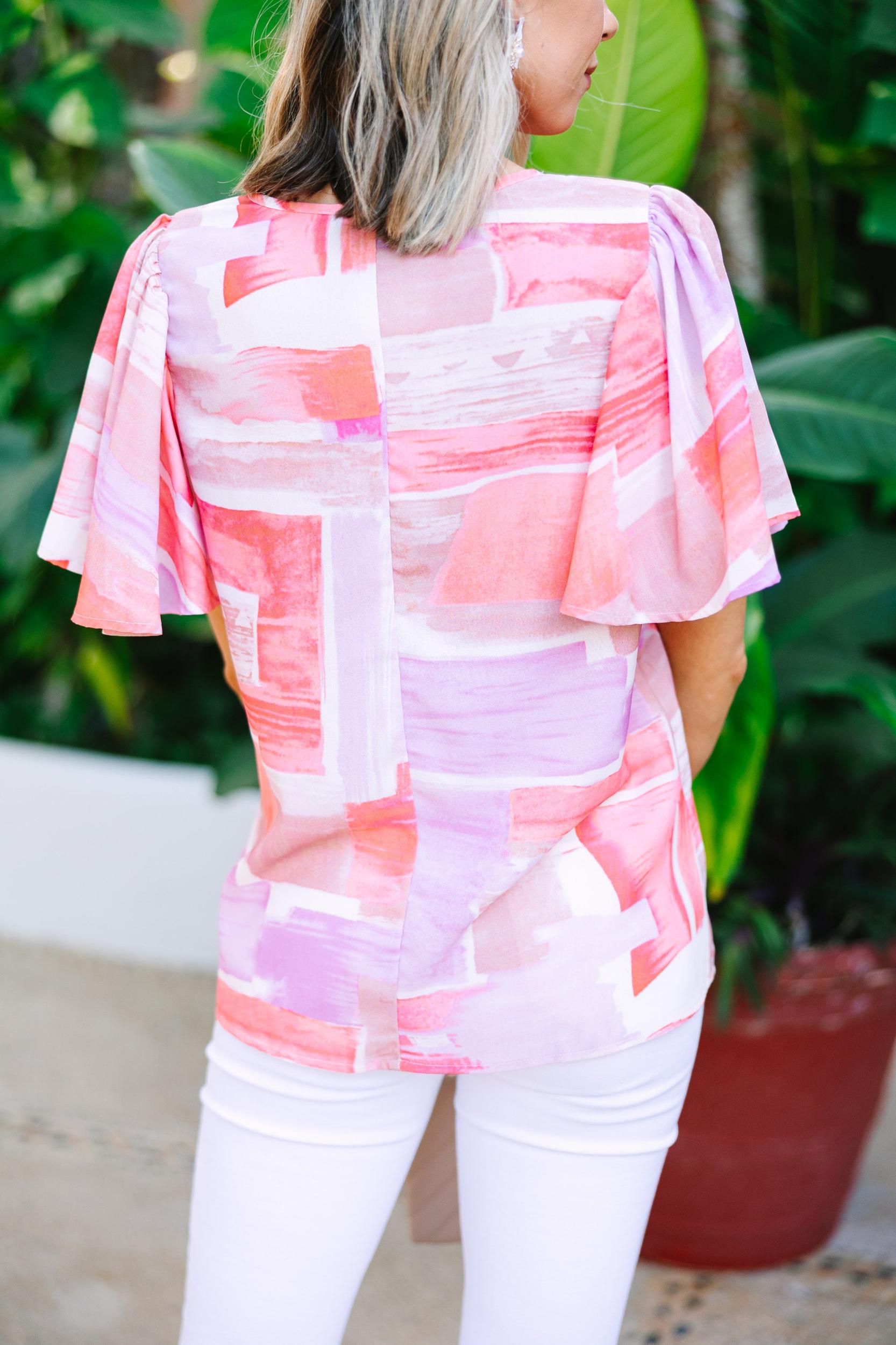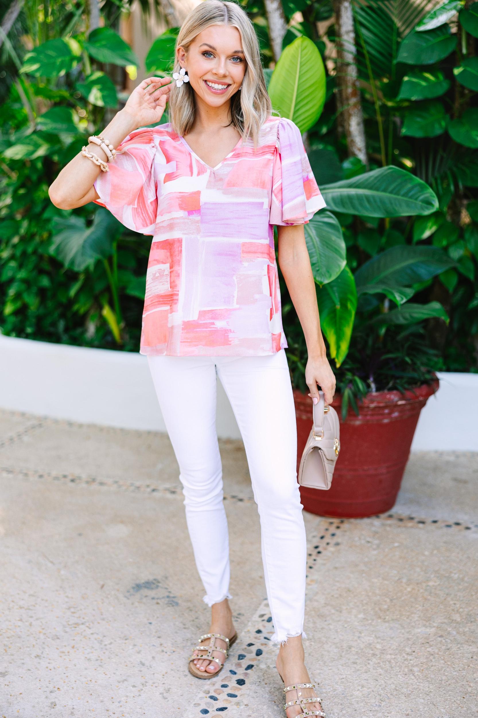 You are certainly going to believe in yourself in this fabulous blouse! It's so bold and fun! The colors look fabulous together and we love that classic fit! You are going to find it so easy to style this blouse with white jeans or short! This blouse features short flutter sleeves, a v-neck, and a unique abstract print. Material has no amount of stretch.Cam is wearing the small.