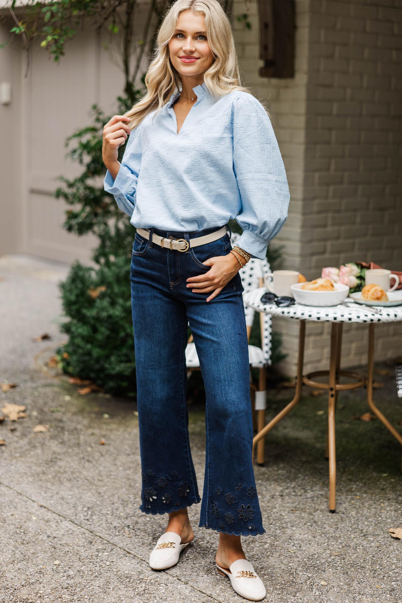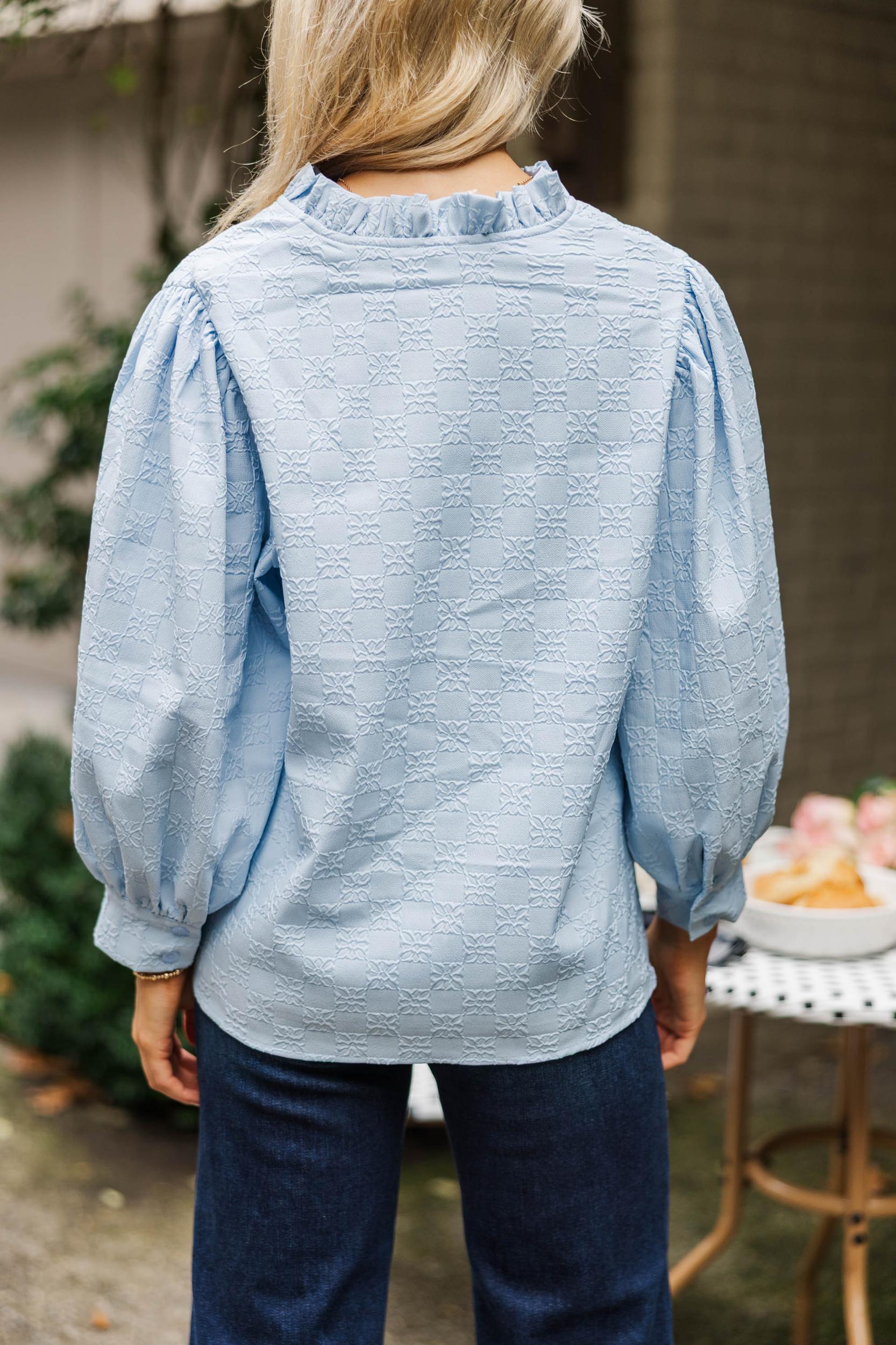This soft blue blouse is an effortless wardrobe staple with its subtle textured pattern and easy, relaxed fit. Polished yet comfortable, it pairs perfectly with denim for everyday wear or can be dressed up with tailored pants for work or brunch. The lightweight feel and timeless silhouette make it a piece you’ll reach for season after season. Split V-neckline Long sleeves Straight hemline Lightweight woven fabric Slight stretch Poppy is wearing the small.