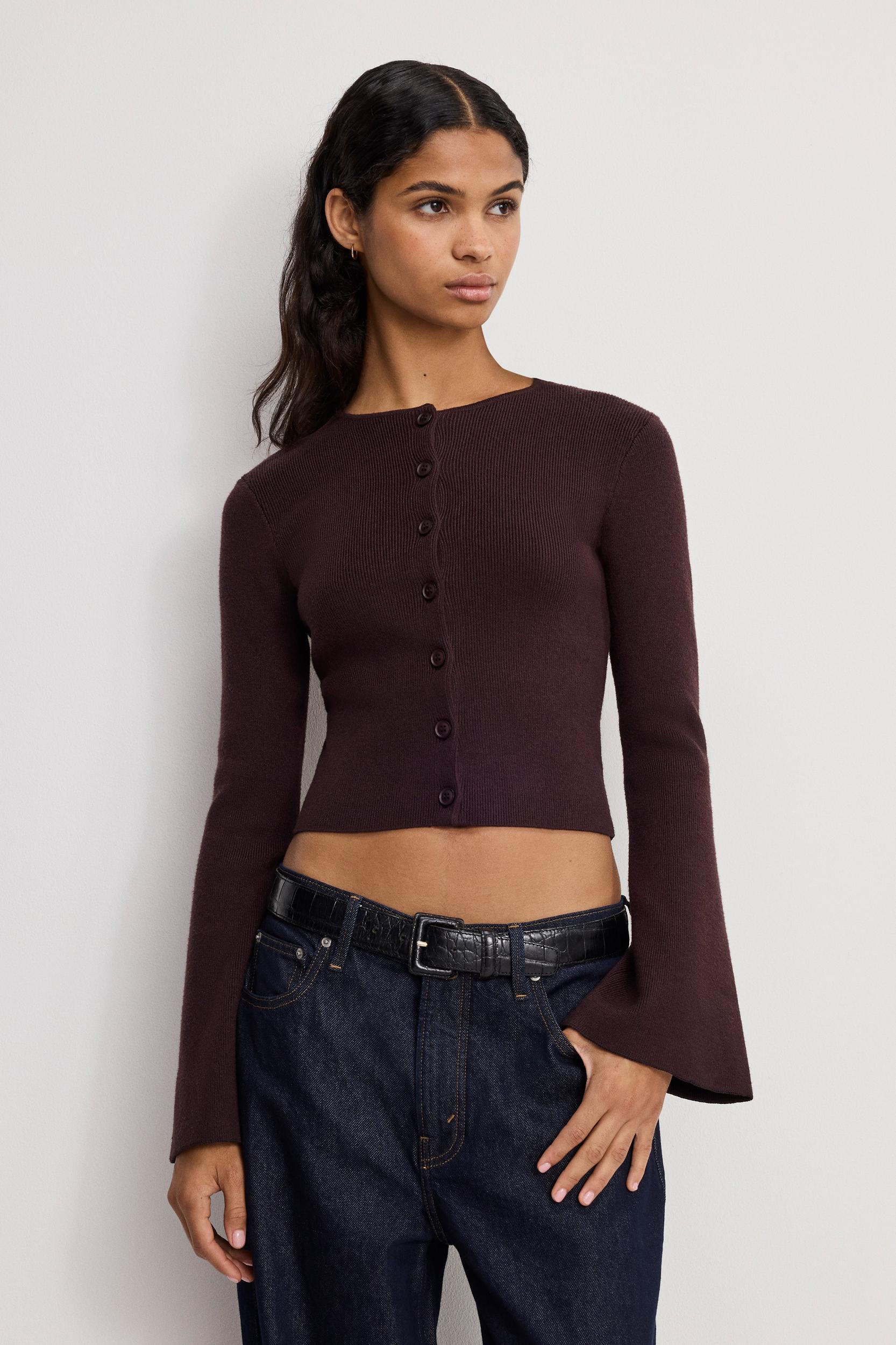 The Bell Sleeve Knit Cardigan balances softness with structure. Cut slim for a close fit, it features exaggerated sleeves that move with ease and a button-up front that keeps the look sharp. Easy to wear, hard to overlook. -Crew neckline -Slim fit -Button up front -Long bell sleeves -Sweater yarn fabric Fabric: 48% Viscose, 28% Polyester, 24% Nylon Care: Machine wash cold with similar colors or dry clean.