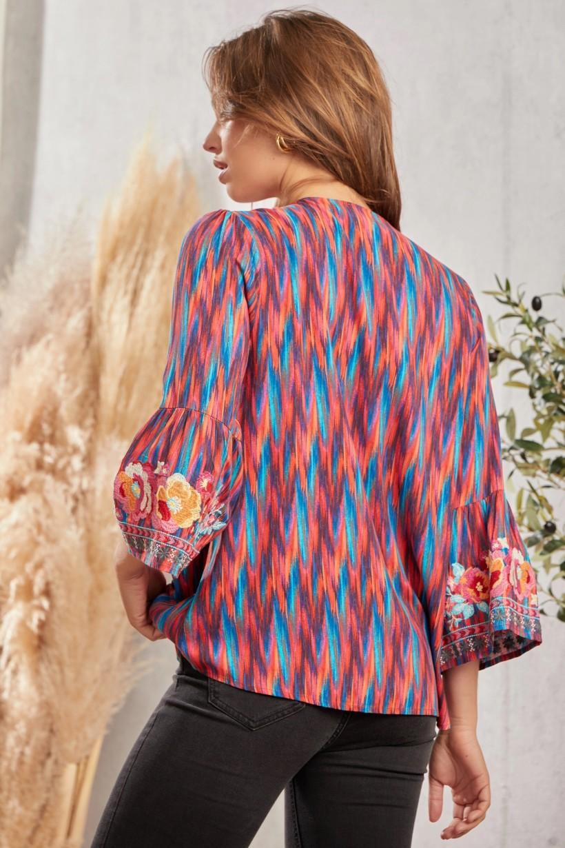 Printed top with split neckline and embroidery details. Bell sleeve, a line bodice. Woven, non sheer.100% Rayon. Hand wash cold.