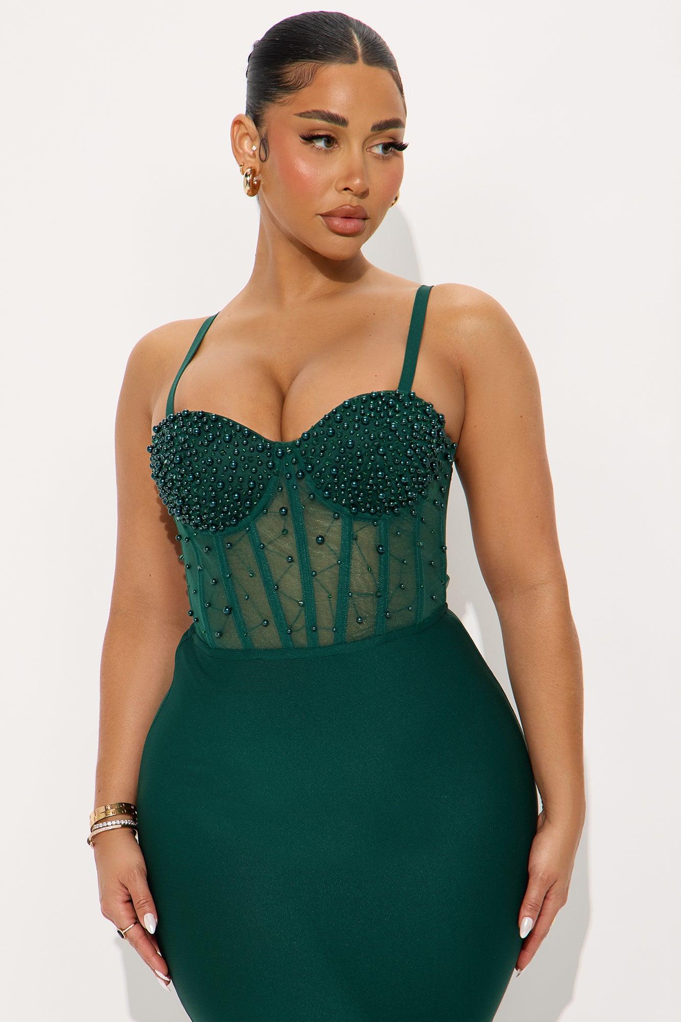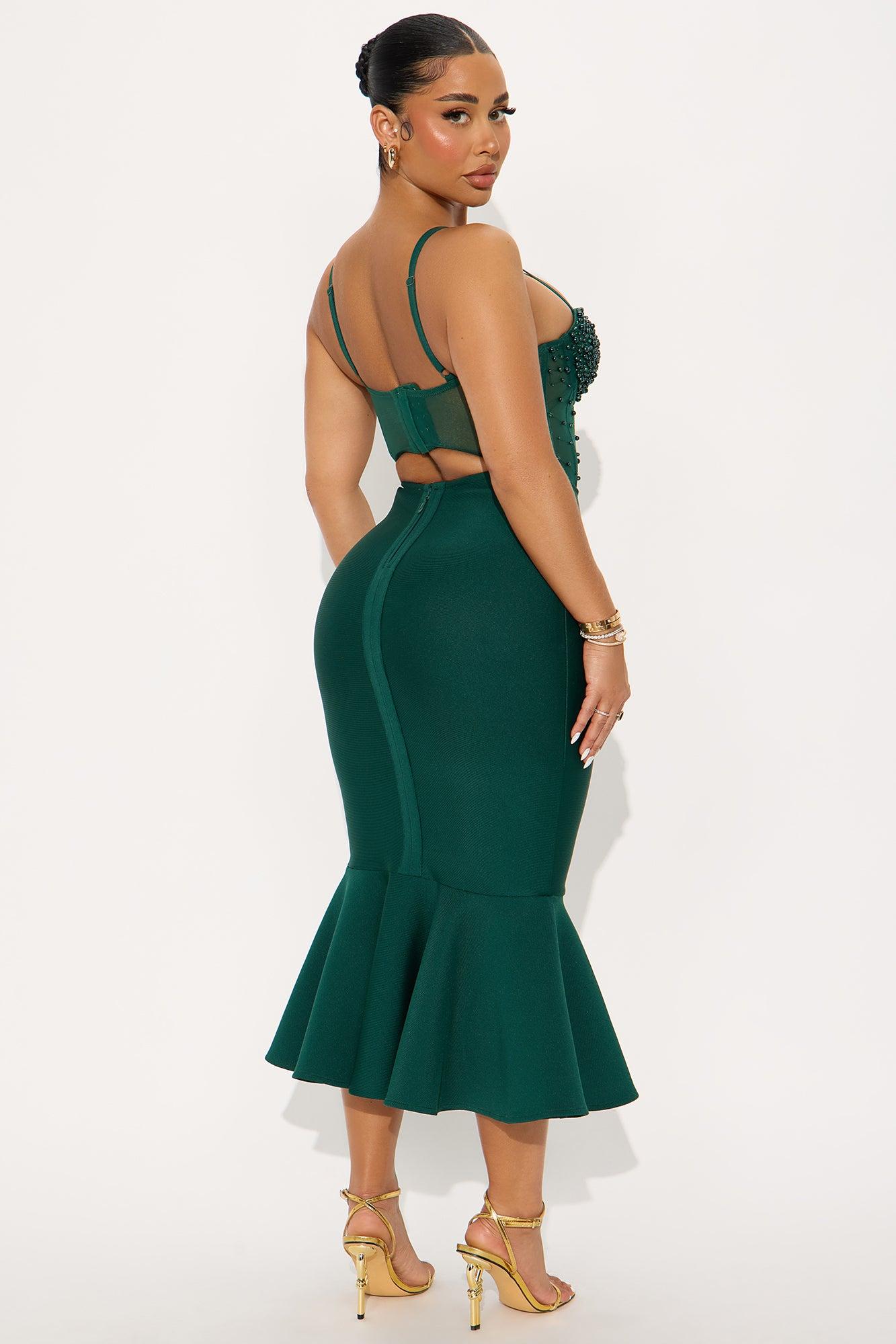 Available In Emerald. Bandage Midi Dress Adjustable Spaghetti Straps, Stretch Sweetheart Neckline Padded Bra Cups Embellished Corset Waist Peplum Hook And Eye Back Closure Back Cut Out, Hidden Back Zipper Length Measured Flat = 47" Self: 95% Polyester 5% Spandex Contrast1: 100% Nylon Contrast2: 100% Polyester Lining: 100% Polyester California Proposition 65WARNING: Cancer and Reproductive Harm - www.P65Warnings.ca.gov.