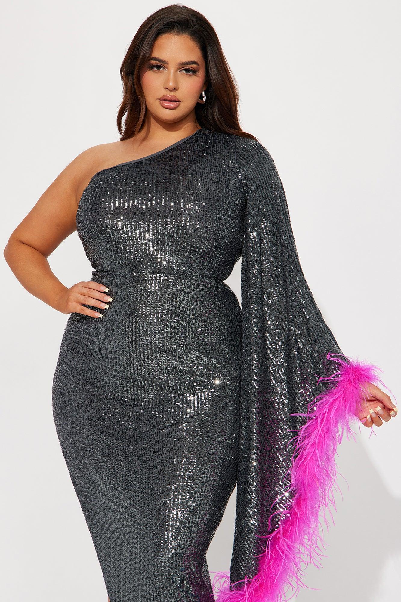 Bella Feathered Maxi Dress - Gunmetal/Pink