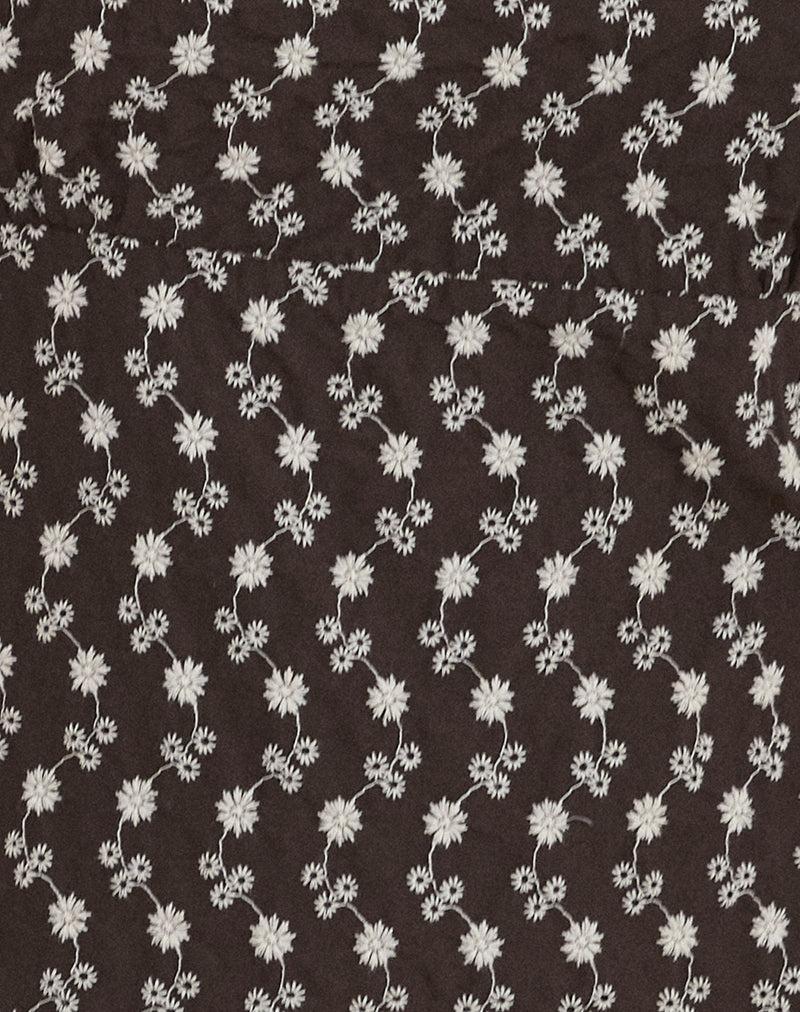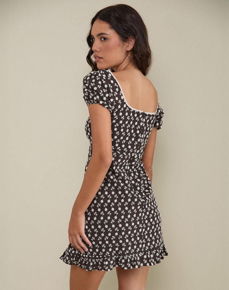 The Bella dress in brown floral broderie, features a square neckline with puffed sleeves and a fitted mini silhouette. Delicate cream picot trim accents the neckline and sleeve edges. The hemline includes a subtle ruffle detail. MODEL WEARS SIZE:EXTRA SMALL - MODEL HEIGHT:5'7