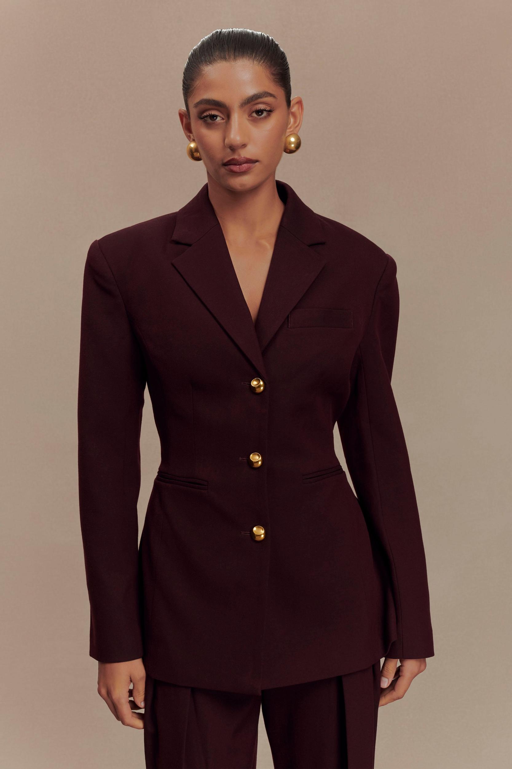 The Quintessential Blazer. The BELLAMY Cinched Blazer is a statement piece that combines timeless elegance with a contemporary edge. Featuring a button front closure, classic collar and lapel, and strong structured shoulders enhanced with shoulder pads, this blazer offers a powerful silhouette. The long sleeves and functional welt pockets add both style and practicality, while the centre back vent ensures ease of movement. Fully lined for a luxurious finish and with a back belt to cinch the waist, it creates a flattering hourglass figure. Pair with the Penelope Pleated High Waisted Pants for a sophisticated, tailored look.