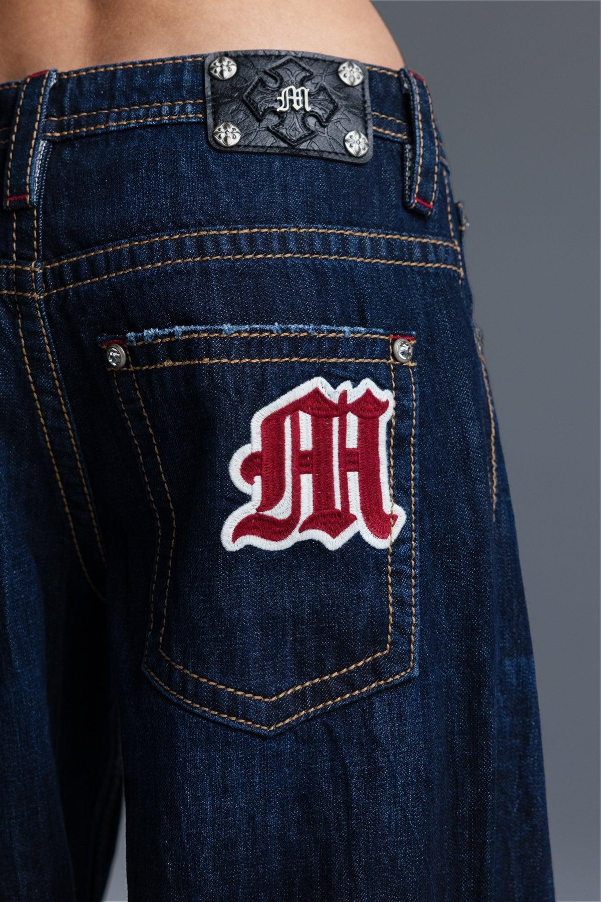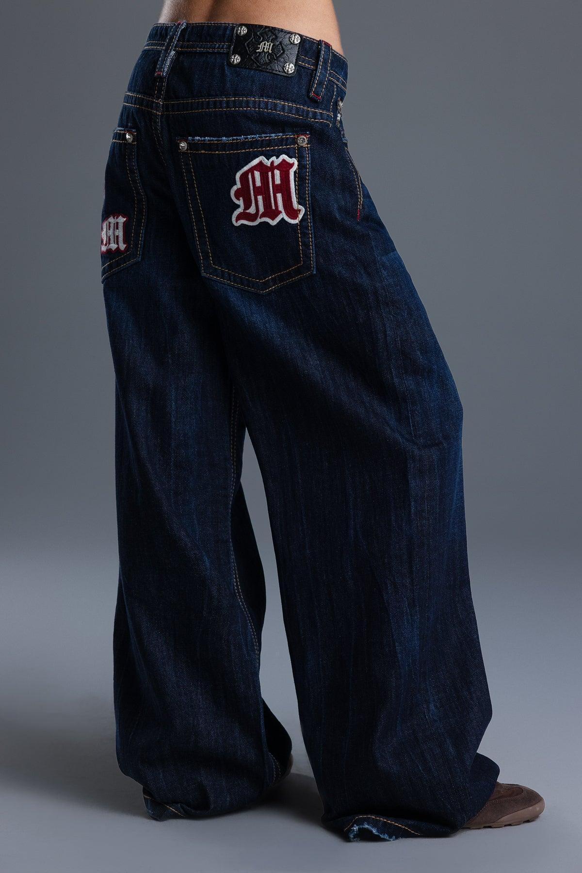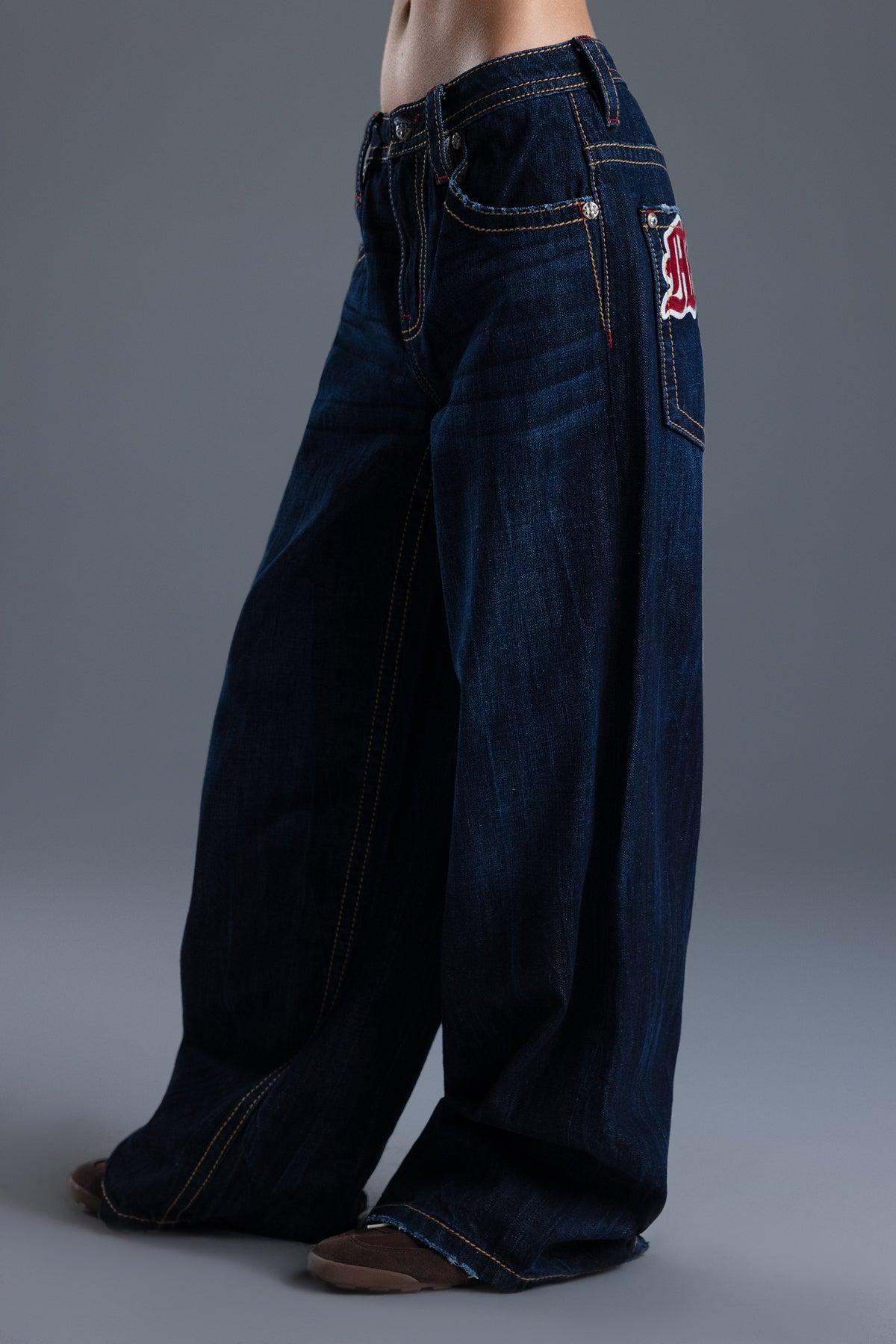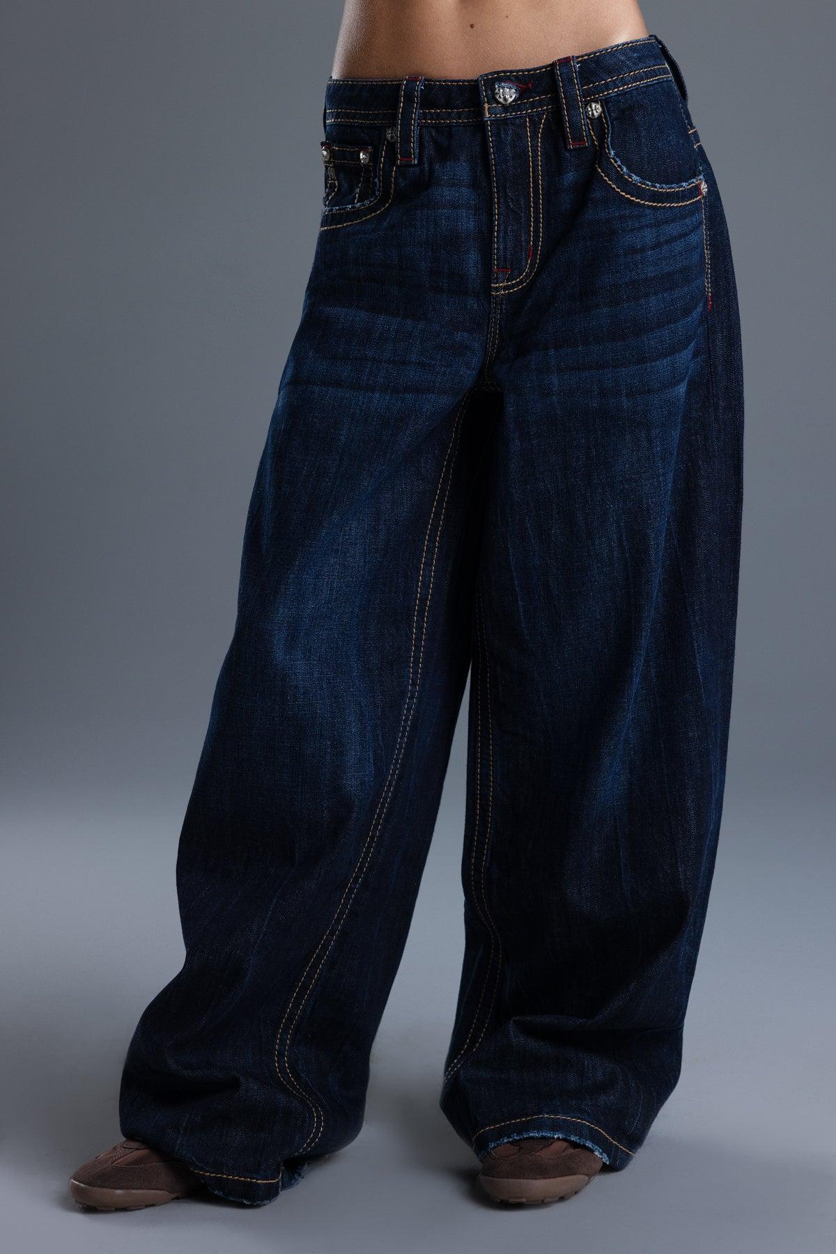 Washed finish, low to mid-rise baggy wide jeans- Contrast embroidered monogram logo design- Abraded pocket edging- Raw edge hem detailing- Embossed black studded leather cross Miss Me brand patch- Whiskering details- 5-pocket design Model is wearing size: 25 Model Measurements:Height: 5'9"Bust: 34"Waist: 26"Hips: 35" Fabric Content: 100% Cotton Care: Gentle machine wash inside-out with like colors in cold water. Tumble dry low. Style No. 2415BWS-D1181, 2415BWV-D1181