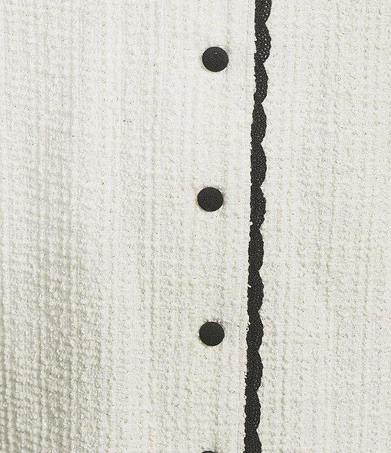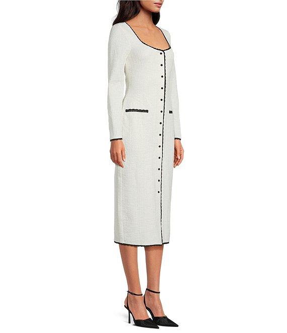 From Belle by Badgley Mischka, this dress features: Tweed fabrication Fitted column silhouette Square neckline Long sleeves Black lace piping detail Fully lined Straight hemline Button front closure Approx. 47.5" length Polyester/cotton/spandex; lining: polyester Dry clean Imported.