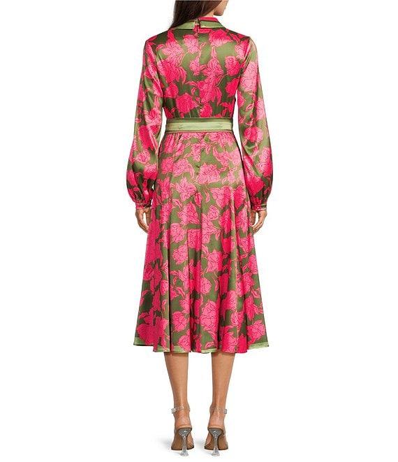 From Belle by Badgley Mischka, this dress features: Woven fabrication A-line silhouette Notch collar neckline Long sleeve Floral print Belted Center zip back closure Approx. 49" in length Polyester/spandex Hand wash/lay flat to dry Imported.