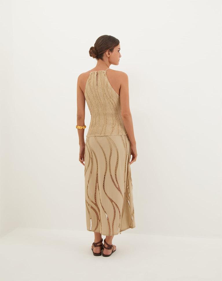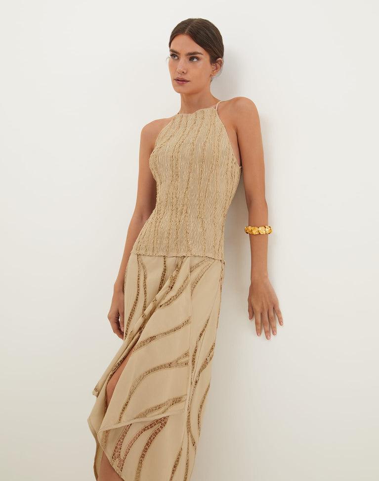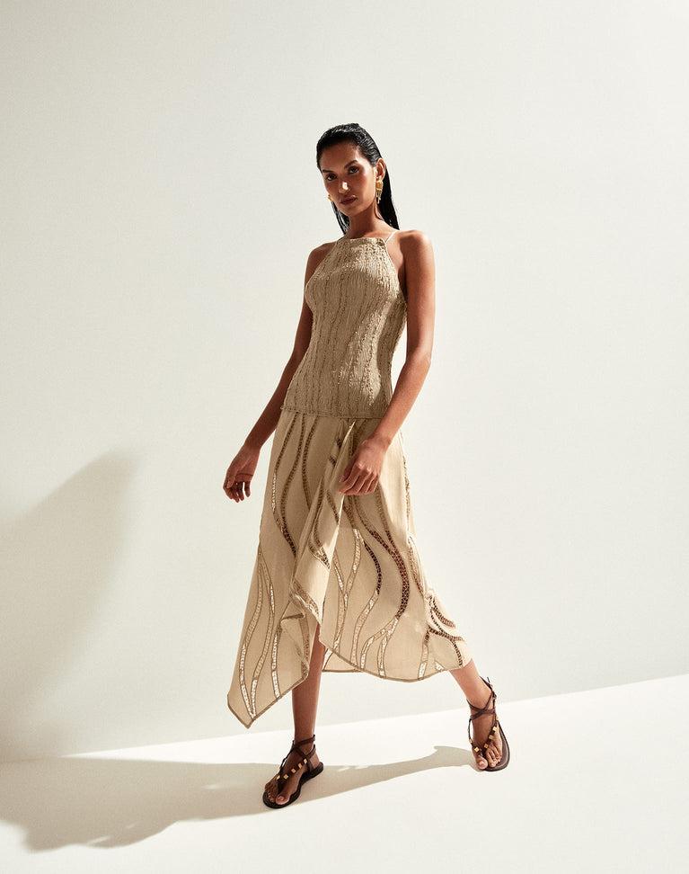 The ViX Belle Midi Dress is crafted from 100% cotton and features a sleeveless design with a halter-inspired neckline, handkerchief hemline, and intricate eyelet details throughout. It includes a smocked, elasticized bodice, making it a versatile and stylish choice for any occasion. Style the Belle Midi Dress with flat
