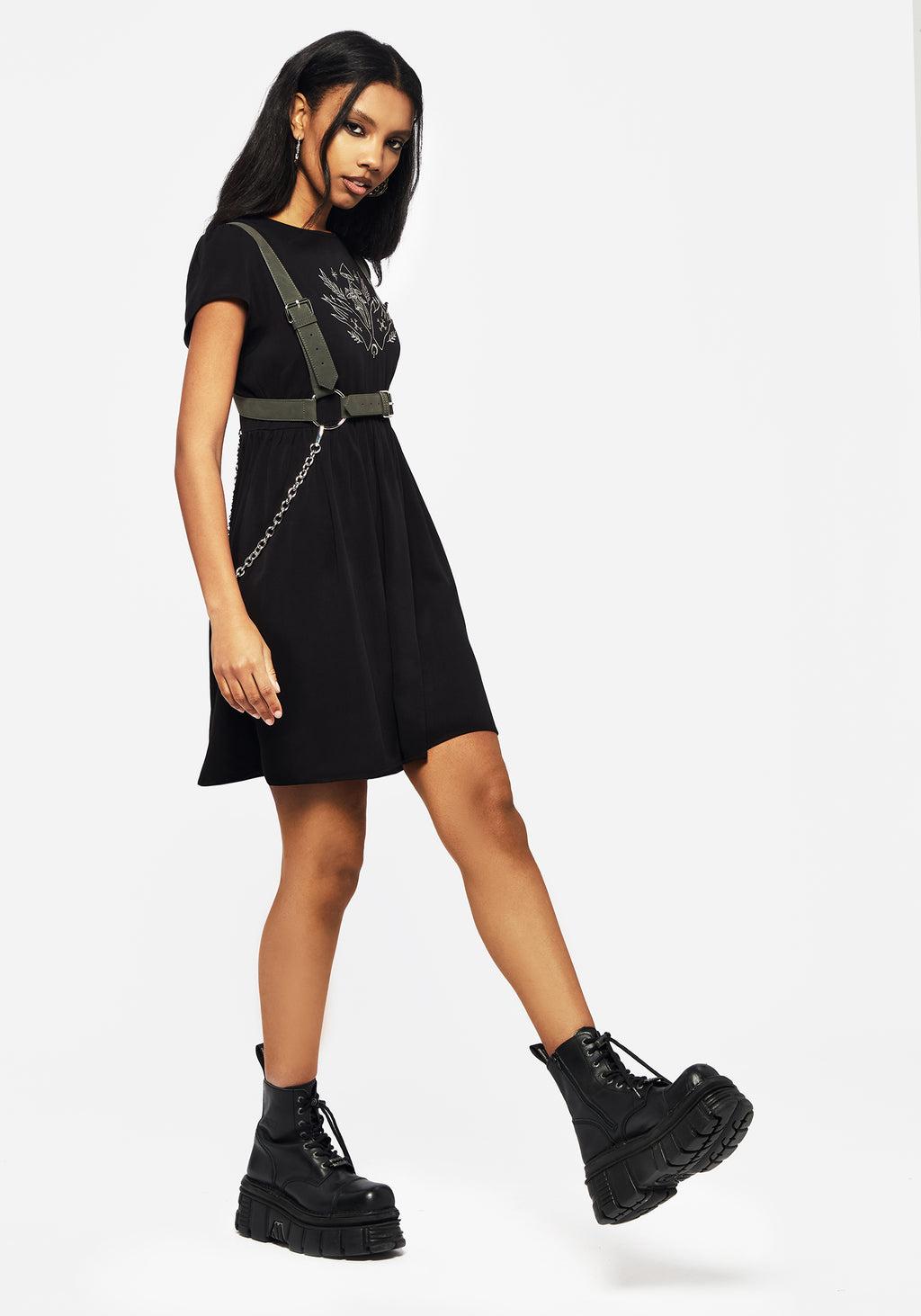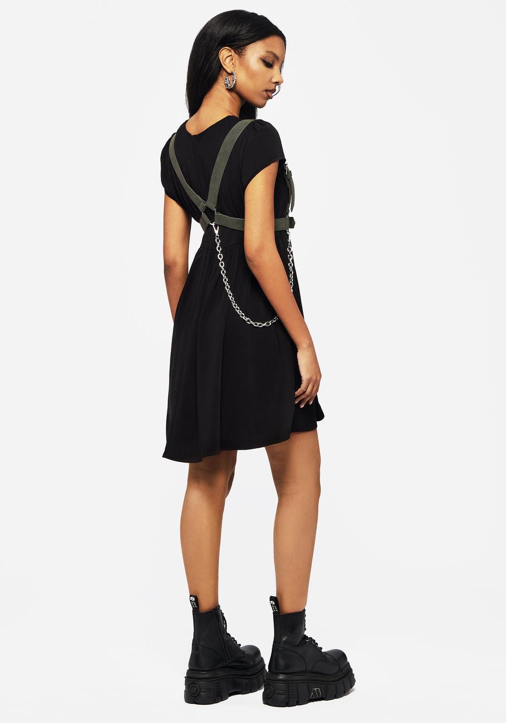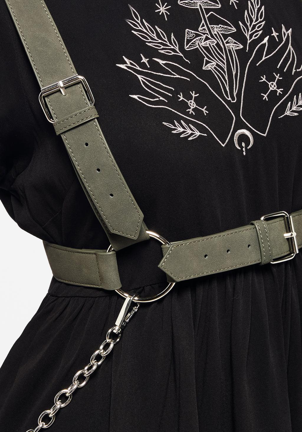 Charcoal O-Ring Faux Leather Harness Shoulder and Front Adjustable Buckles Silver Hardware Silver Side Chain 100% Polyerethane