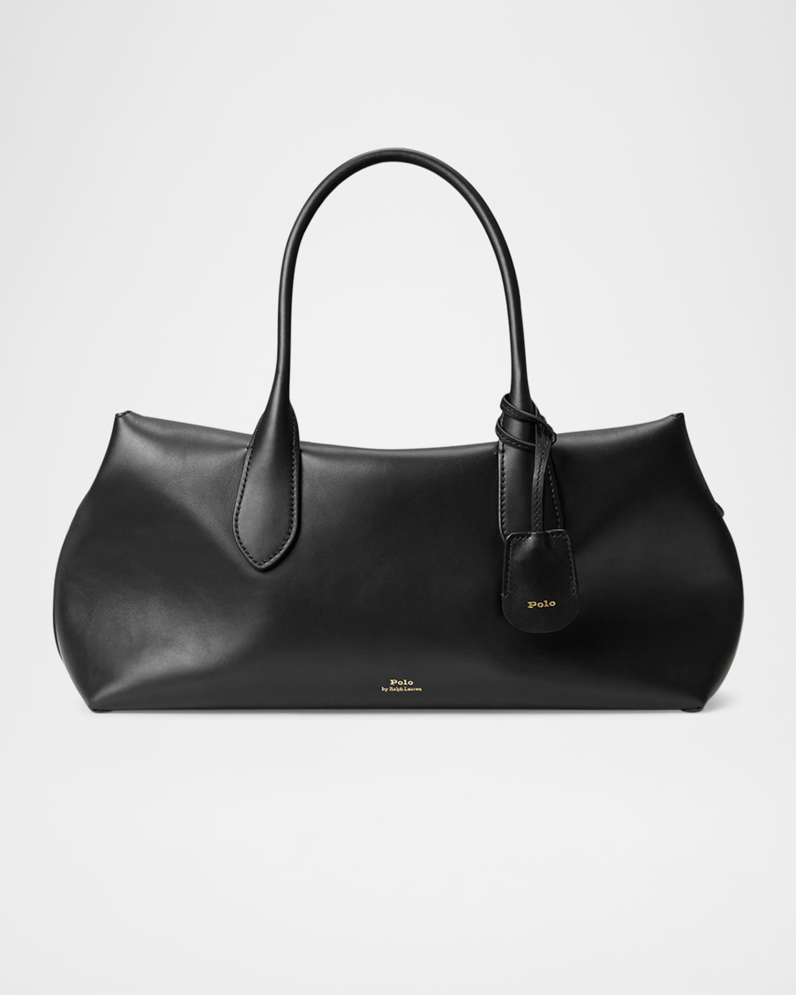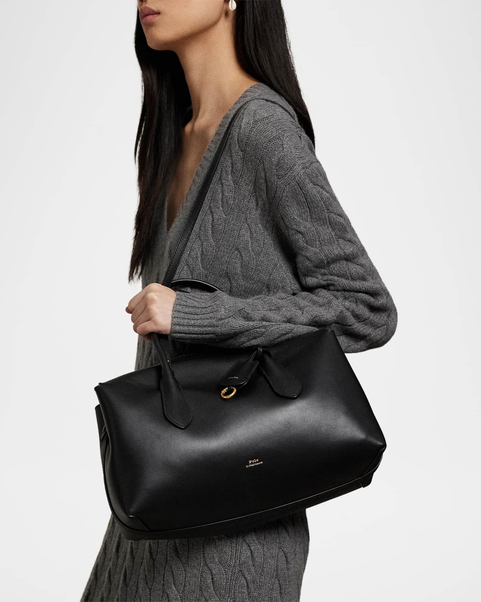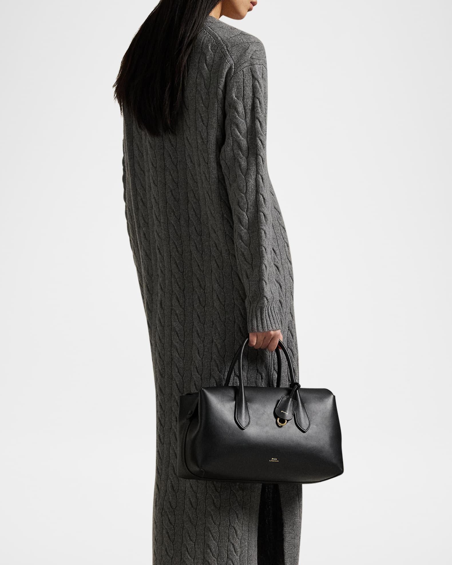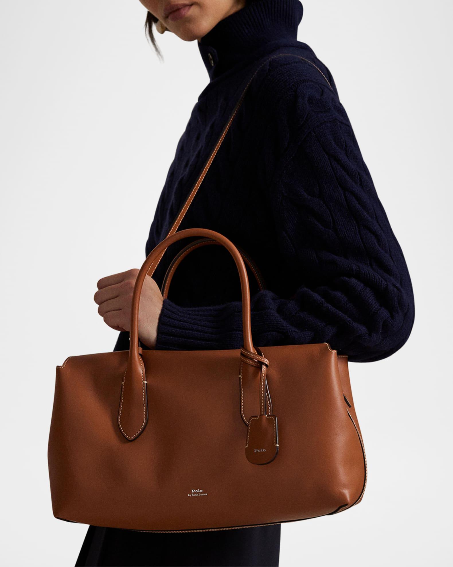 Soft and slightly slouchy, the Polo Ralph Lauren "Bellport" top-handle satchel bag is crafted with premium calfskin leather that ages and softens with wear Rolled top handles, 5.75" drop Detachable crossbody strap, 16.75" max drop Can be worn as a top handle or crossbody bag Overlapping top with magnetic closure Side snap tabs Interior, one slip pocket Lining: Bonded suede Approx. 7"H x 14"W x 5.5"D Imported