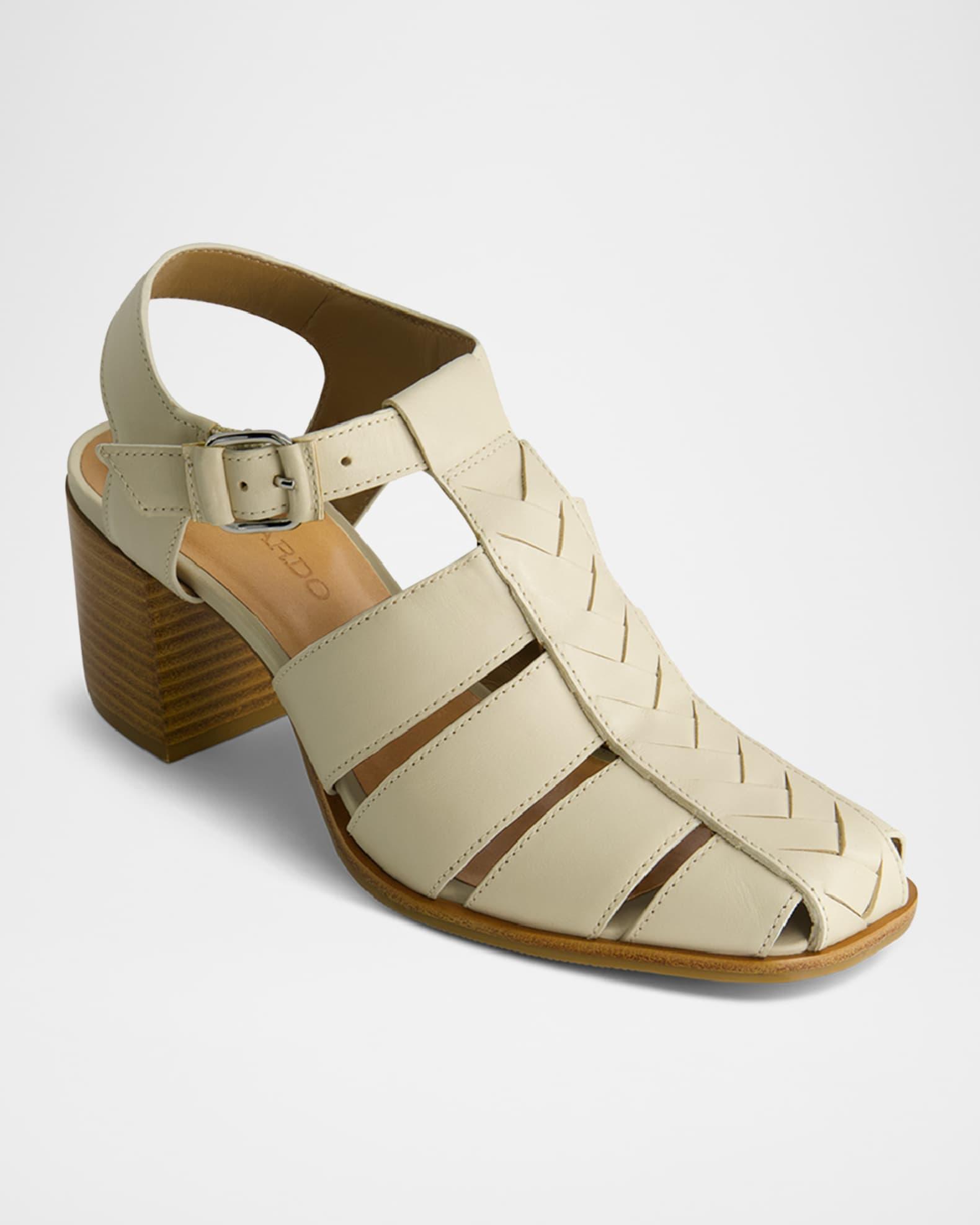 Bernardo "Belmont" calf leather heeled fisherman sandals with woven leather T-strap 2.50 in / 65 mm block heel Round toe Caged vamp Adjustable ankle strap Leather/Rubber outsole Lining: Leather Professional cleaning recommended Made in Brazil