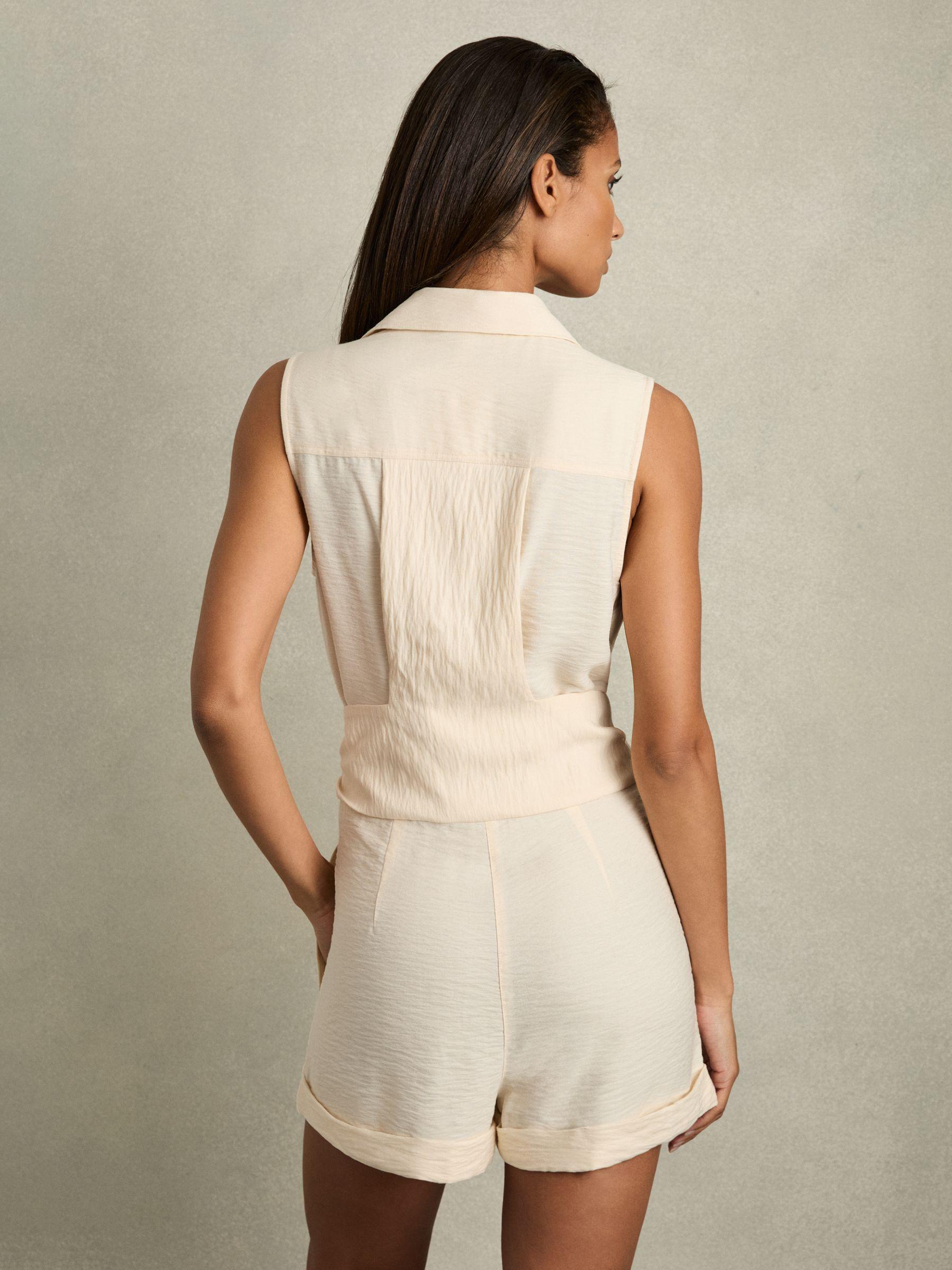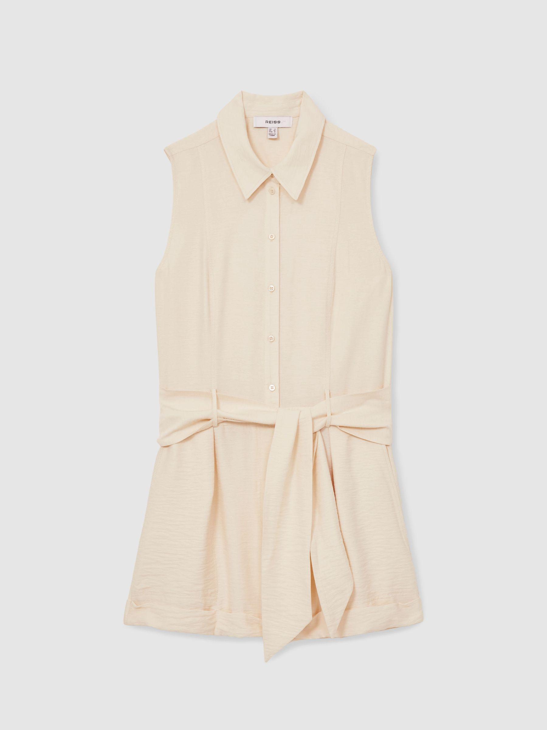 The airy, lightweight nature of the Millie playsuit makes it the perfect piece to slip on over swimwear. A self-tie belt cinches at the waist, whilst front pleats are a flattering touch. Wrinkle-effect lightweight. fabric. Self-tie belt. Front pleats. Side slip pockets. Turn-up hems. Front button placket.