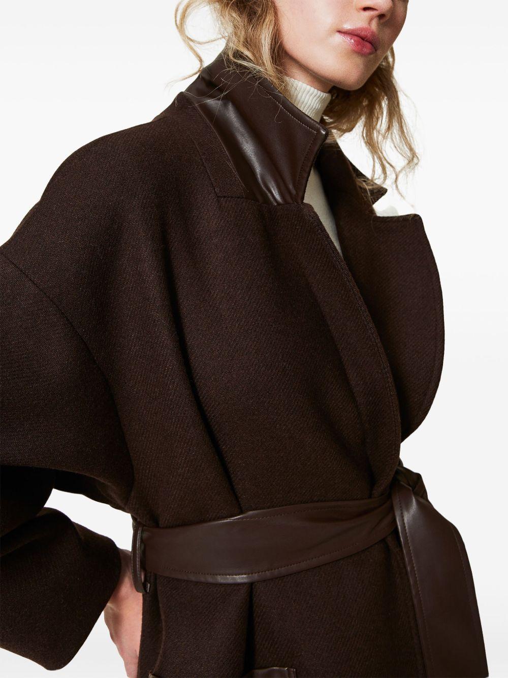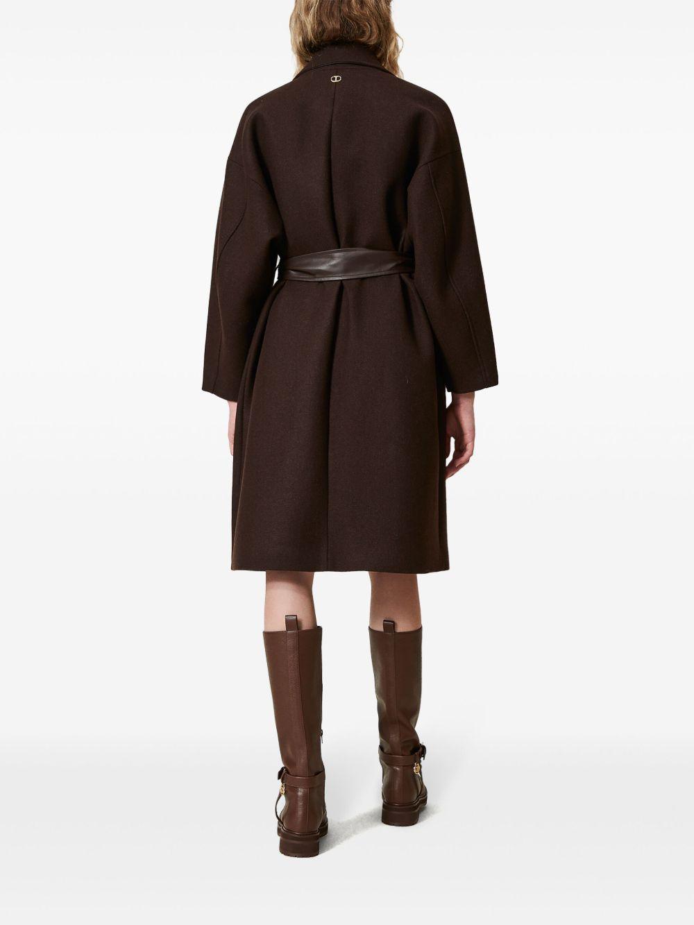 TWINSET belted coat | Brown | chocolate brown | wool blend | felted | faux-leather trim | double-breasted button fastening | notched lapels | drop shoulder | long sleeves | belted waist | two side patch pockets | mid-length | straight hem | Wool/Polyester/Polyamide/Other fibres | Double Breasted & Peacoats | Coats | Clothing | Women
