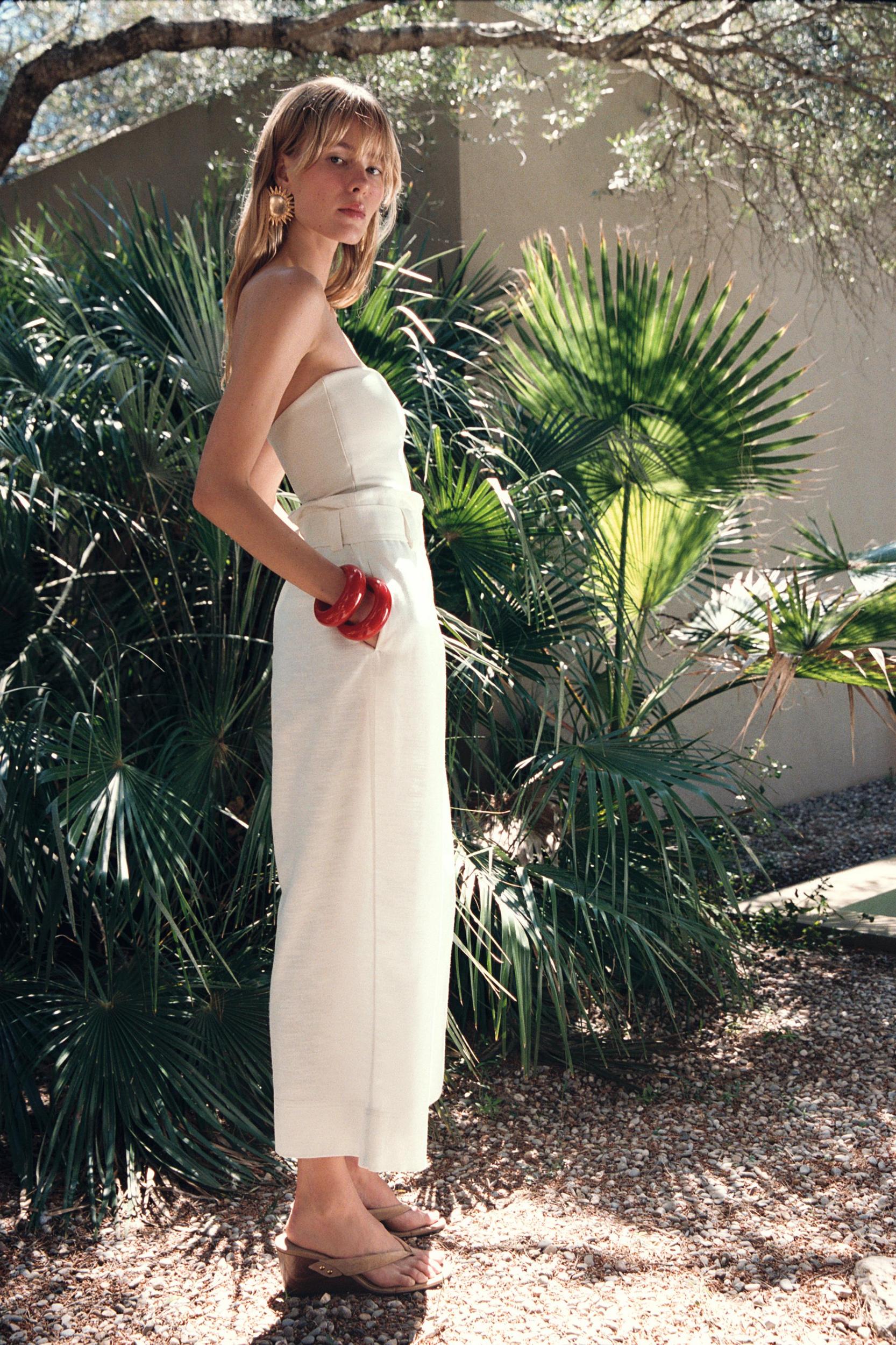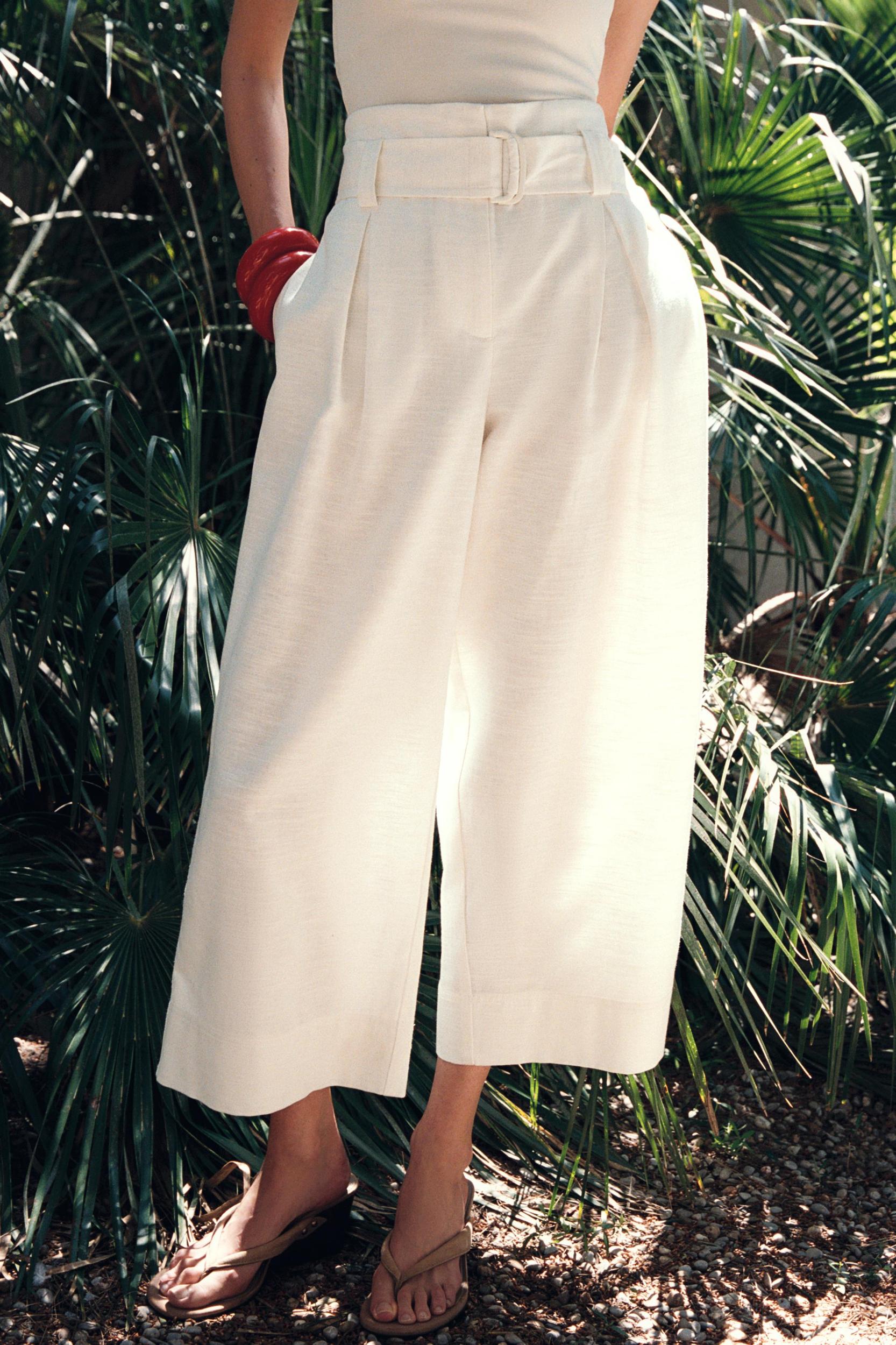 High-waisted pants with belt and front darts. Front pockets and false welt pockets in the back. Wide, cropped leg. Front closure with zipper, inner button and hooks.