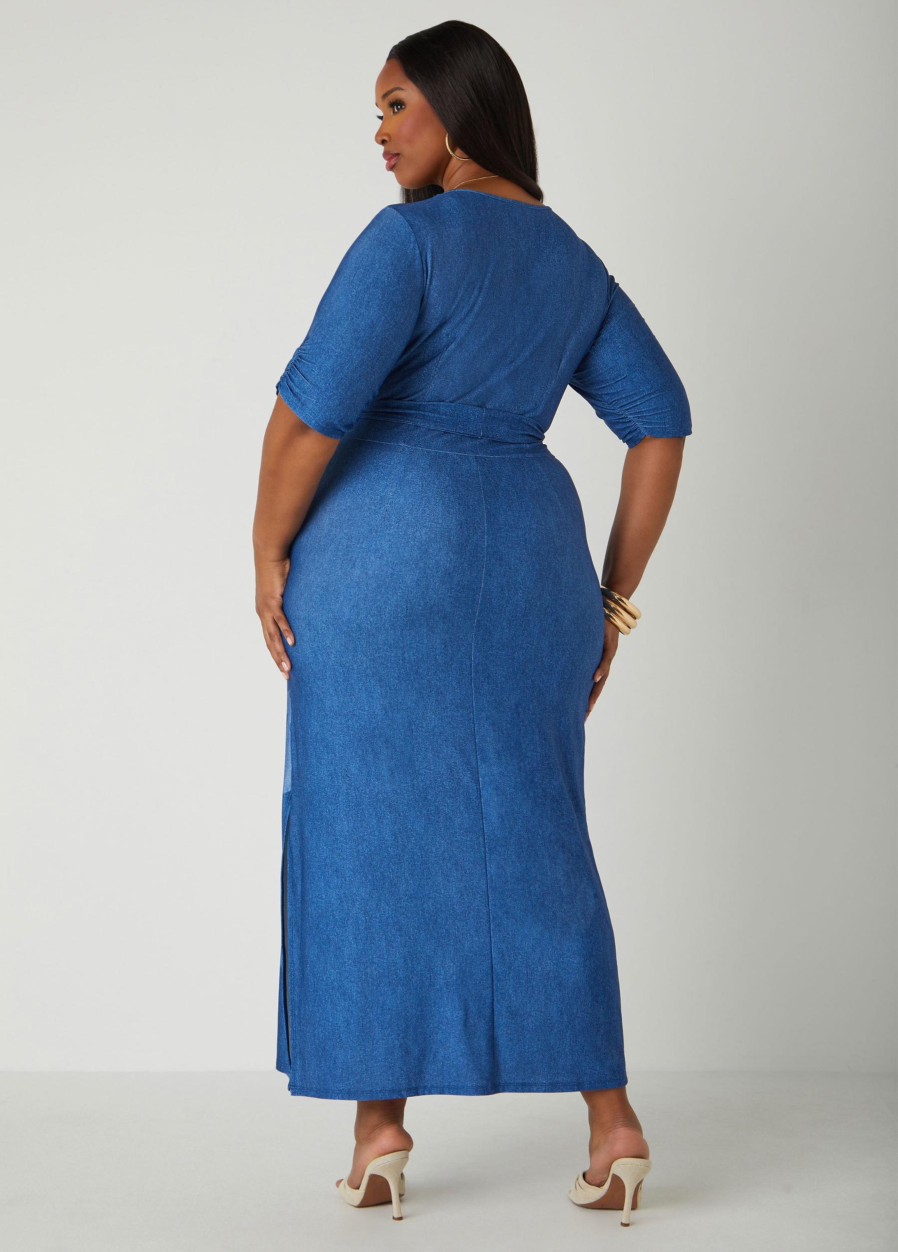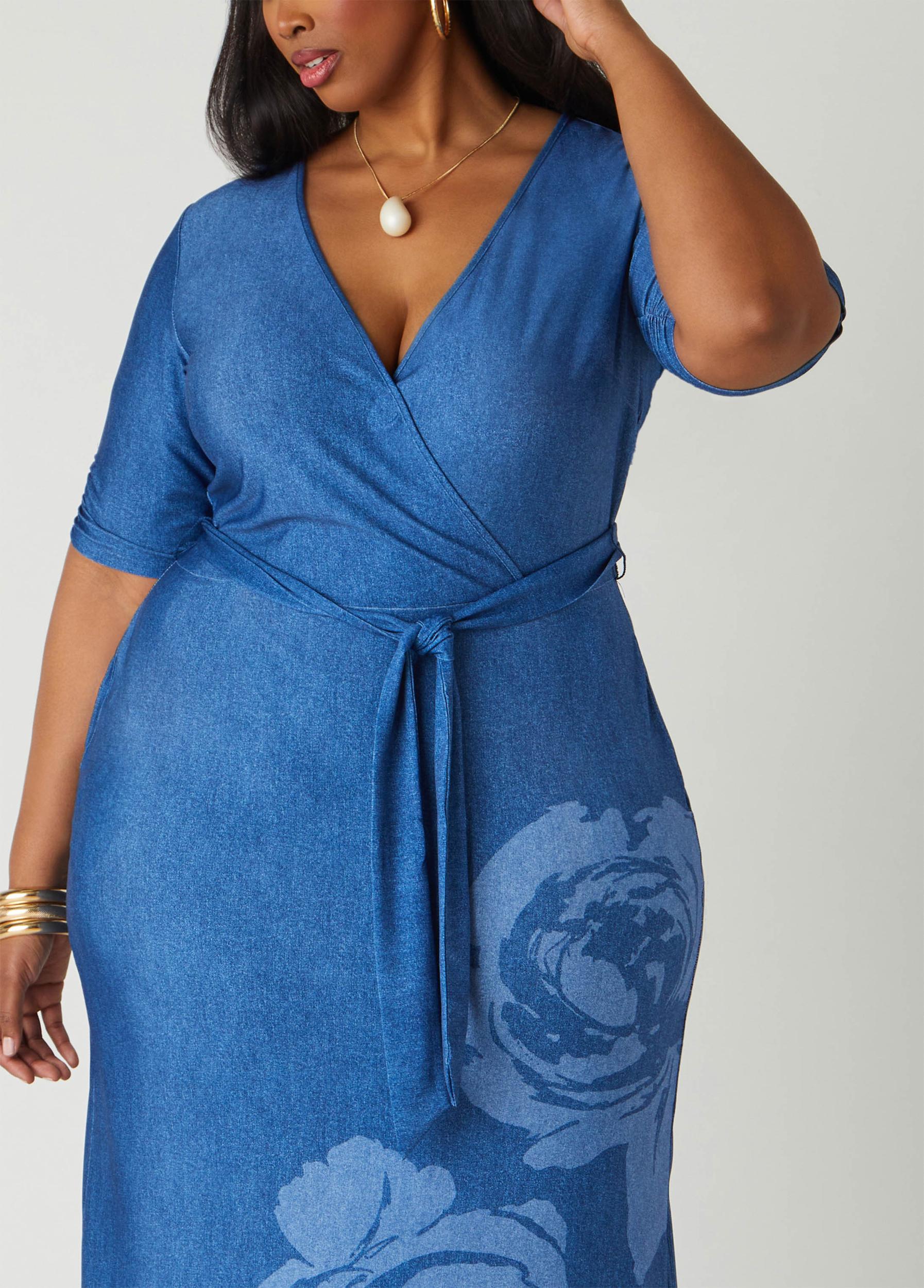 This denim-print maxi dress is a game changer. With a faux wrap neck & a floral print dancing at the hem, it's all about flirty sassiness. The side slits give you room to move, while the two side pockets keep things practical and chic. A sash tie at the waist cinches it just right, giving you a shape that turns heads (without even trying). Ready to wear, ready to slay.
