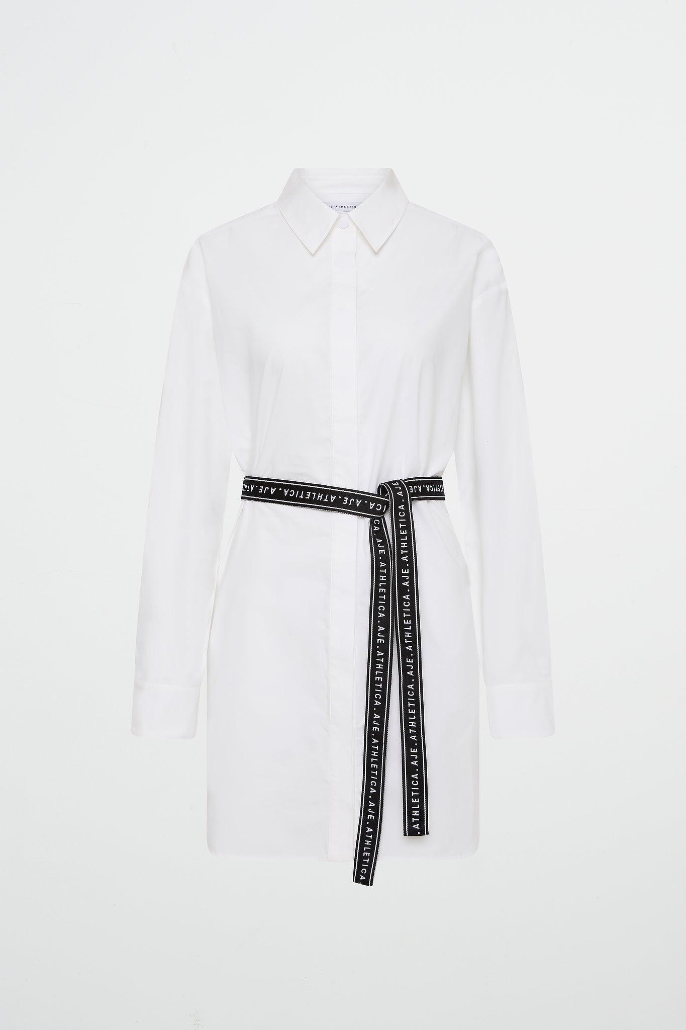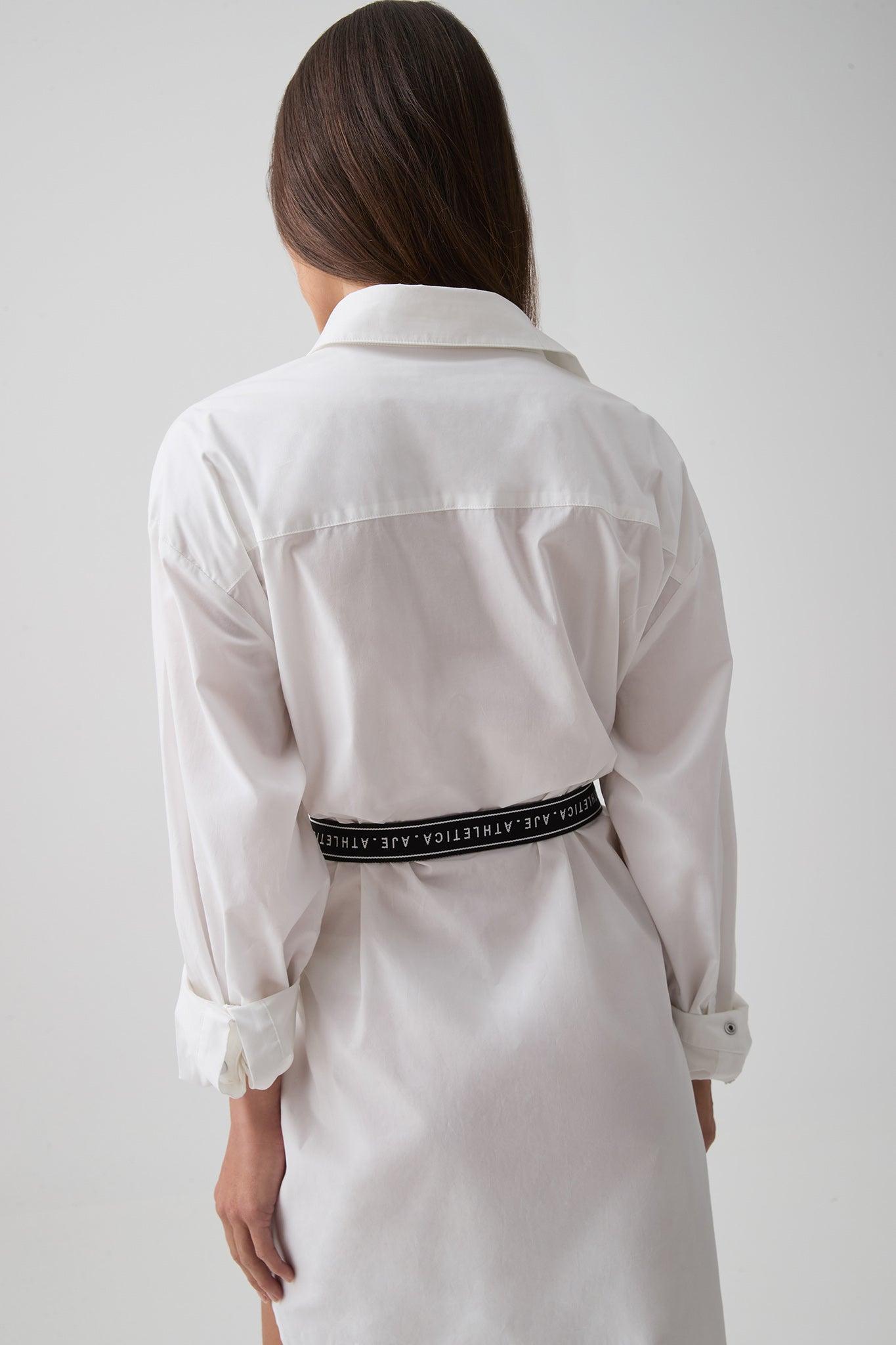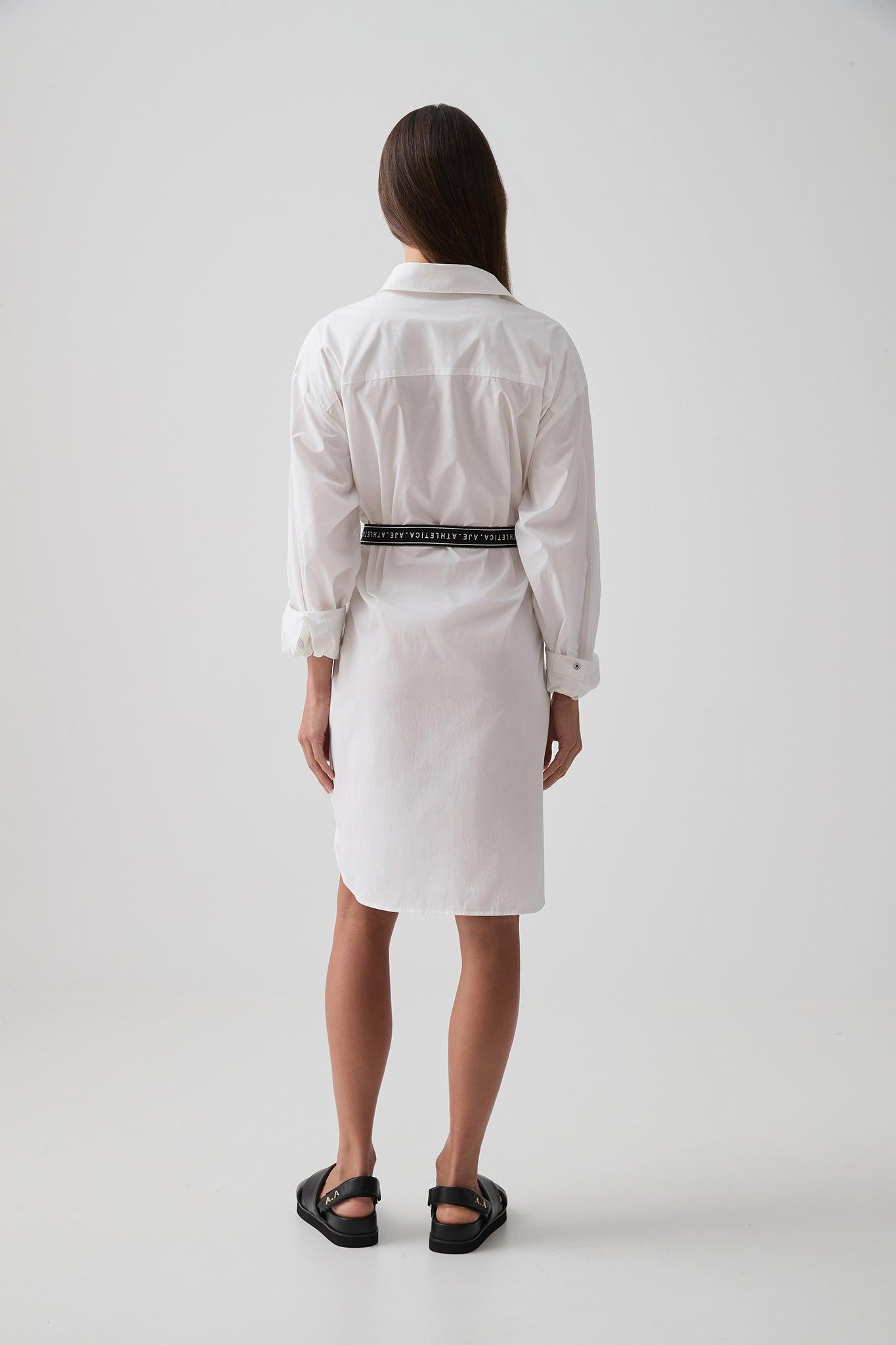 PRODUCT DETAILS Women’s cotton dress Oversized fit Shirt collar Front chest patch pocket Front snap closure Long sleeves with snap-closure cuffs Belt loops Logotape belt Asymmetrical hem SIZE & FIT Helena wears a size 8/S and is 173cm/5’8” FABRICATION 100% Organic Cotton