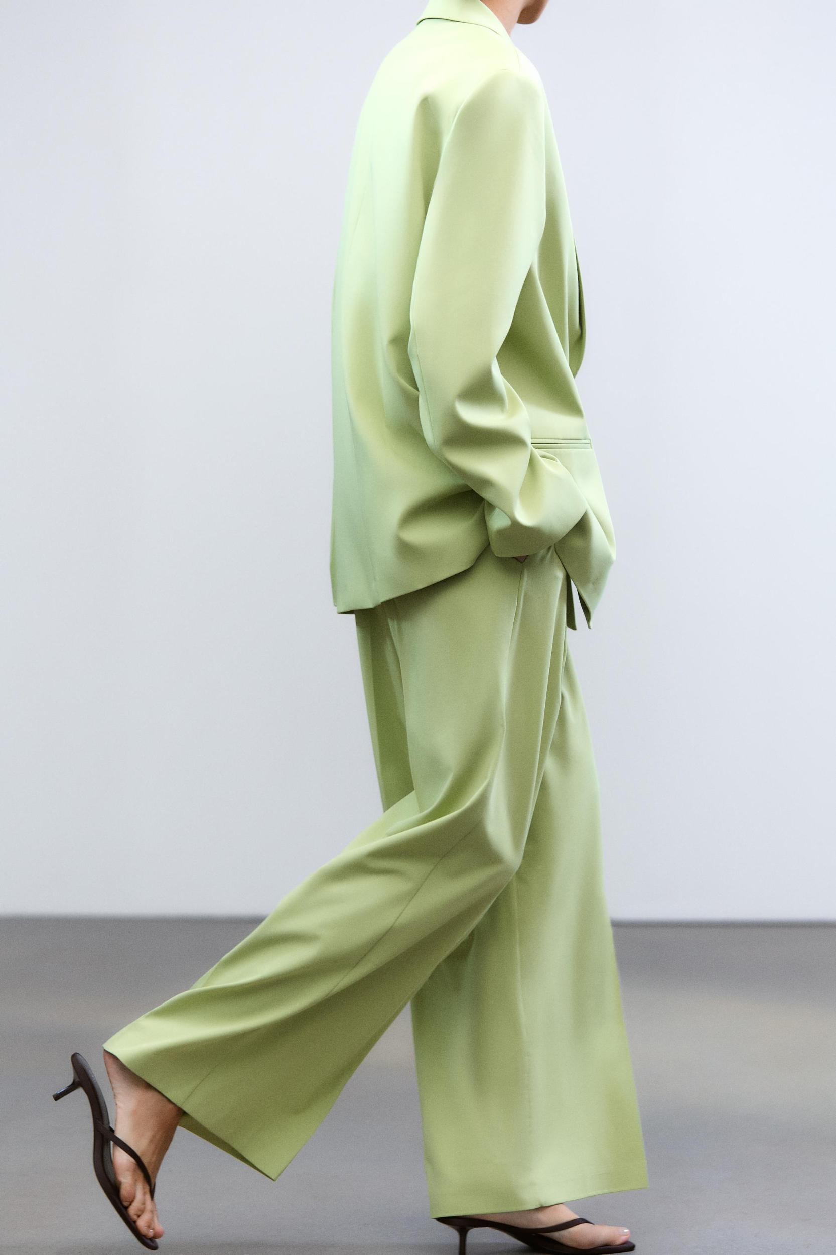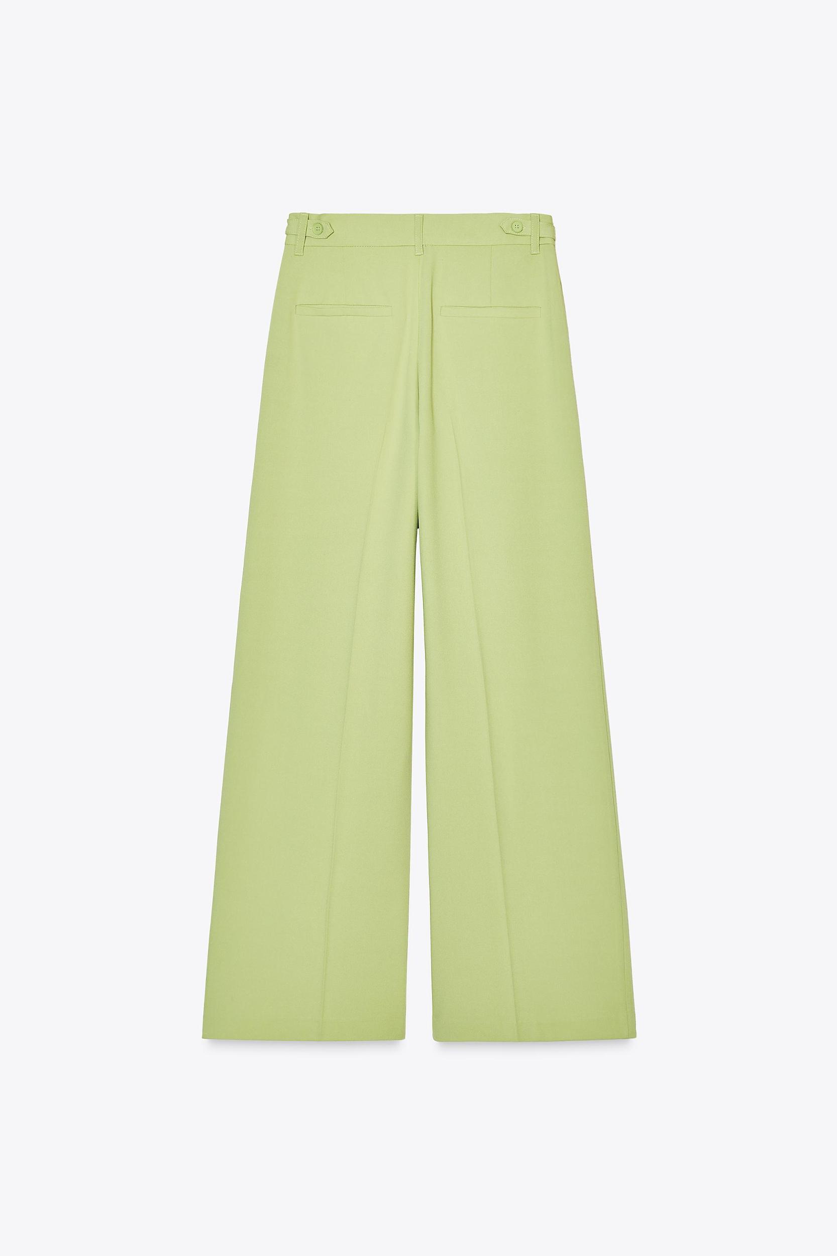 High-waisted pants with belt loops and a button at the waist. Pleat detail. Side pockets and faux welt pockets at back. Front zip, interior button, and metal hook closure.