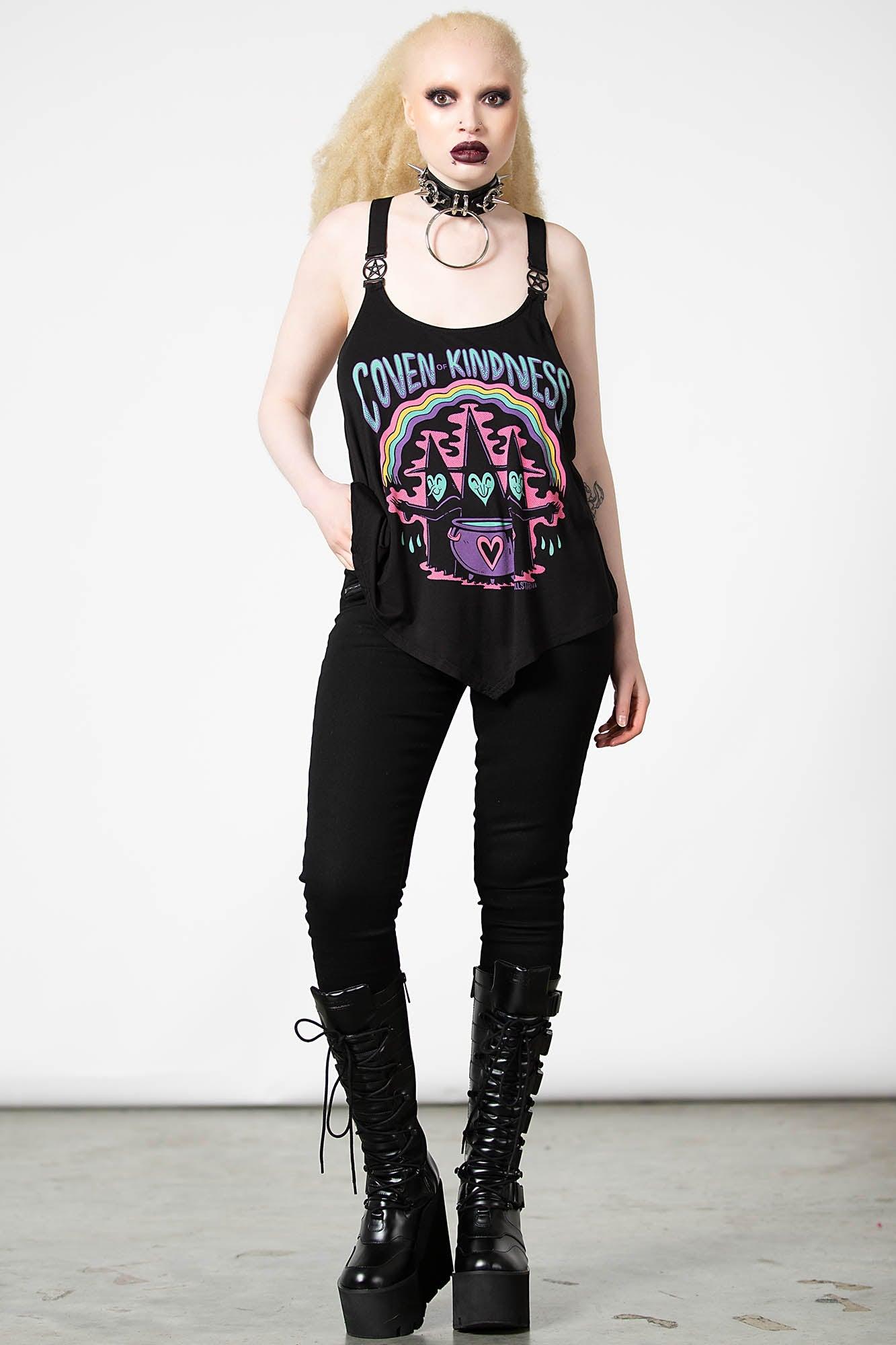 BENEVOLENT.- Low Neckline.- Statement Graphic On Front.- Super Soft Fabric.- Straps With Pentagram Hardware.- Handkerchief Hem.- Relaxed Fit.Stay cute, stay kind with our ‘Benevolent’ vest top. Crafted in super soft, flowing fabric and a hanky hem to give a relaxed fit. Finished with straps which feature metal pentagram hardware and a large, statement graphic on the front, this top is far from basic. Perfect piece for layering!So versatile and easily dressed up or down for whatever your dark heart desires.Model wears a size XS.With KILLSTAR Branding, 95% Rayon, 5% Elastane.