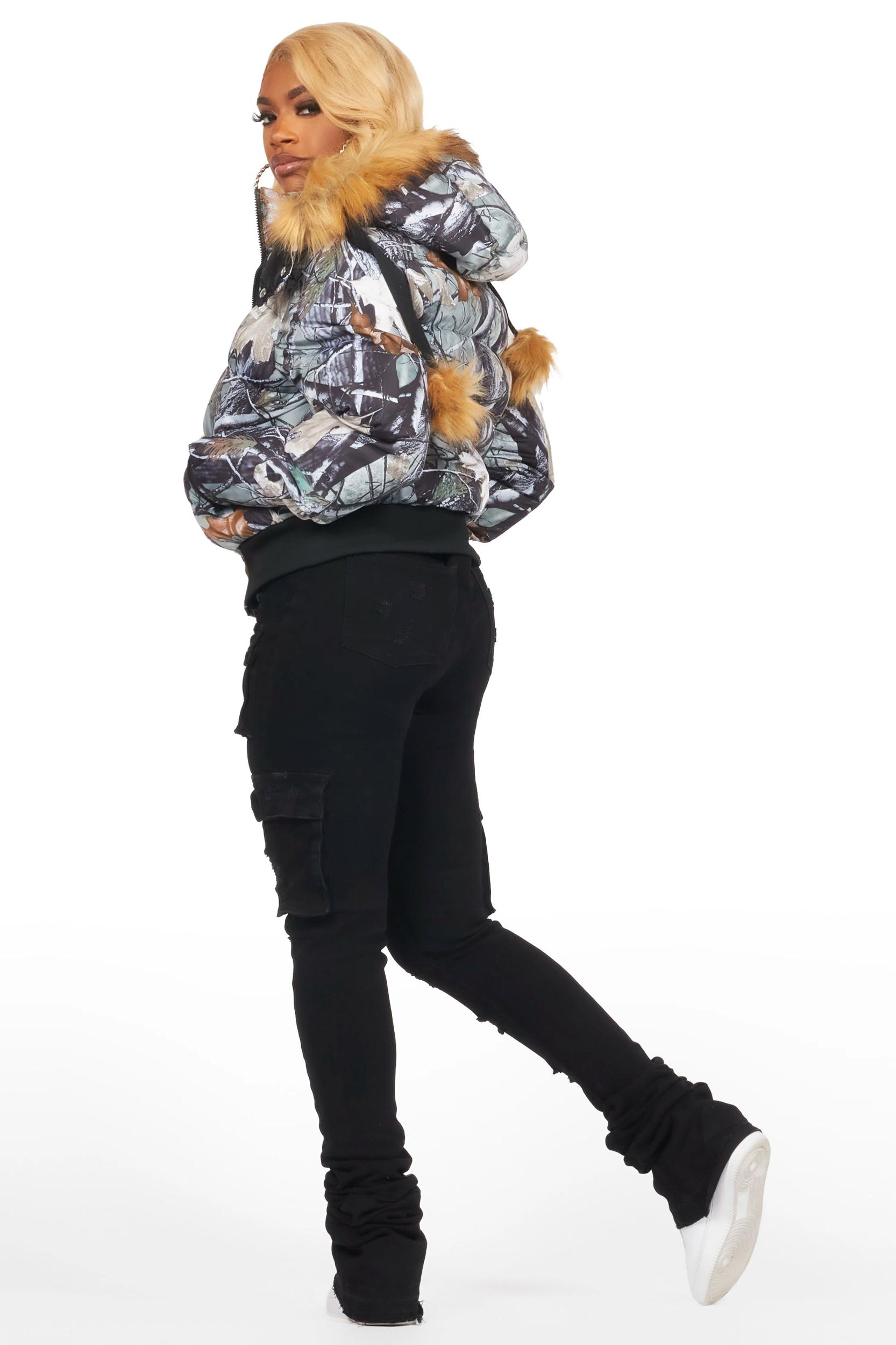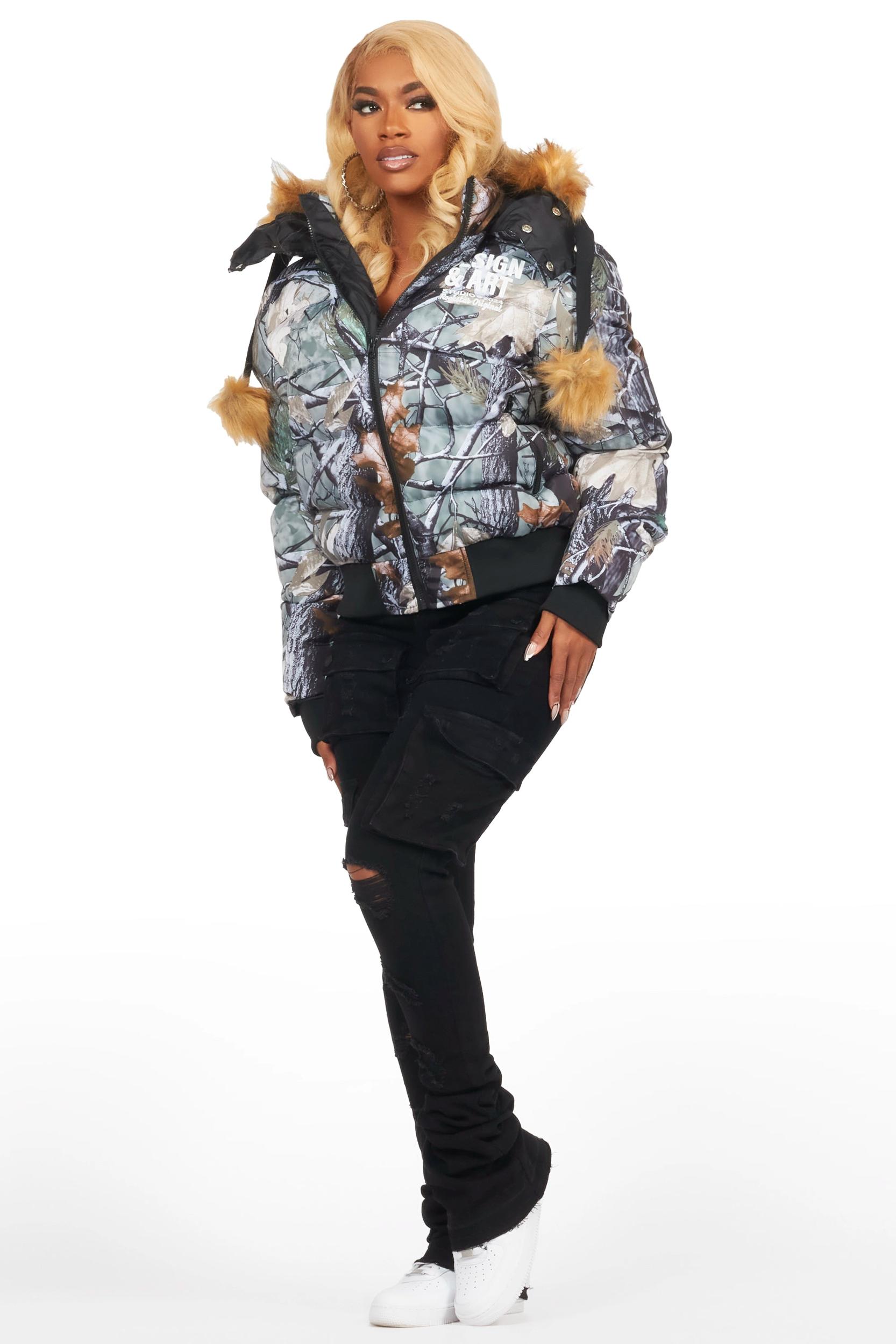 An urban quilted puffer jacket for women in grey tree camo. Designed with water-resistant fabric and insulation for a versatile streetwear style. Removable button faux fur hood Full front zip closure Long sleeves Ribbed knit cuffs Dual slant pockets Embroidered RSO logos