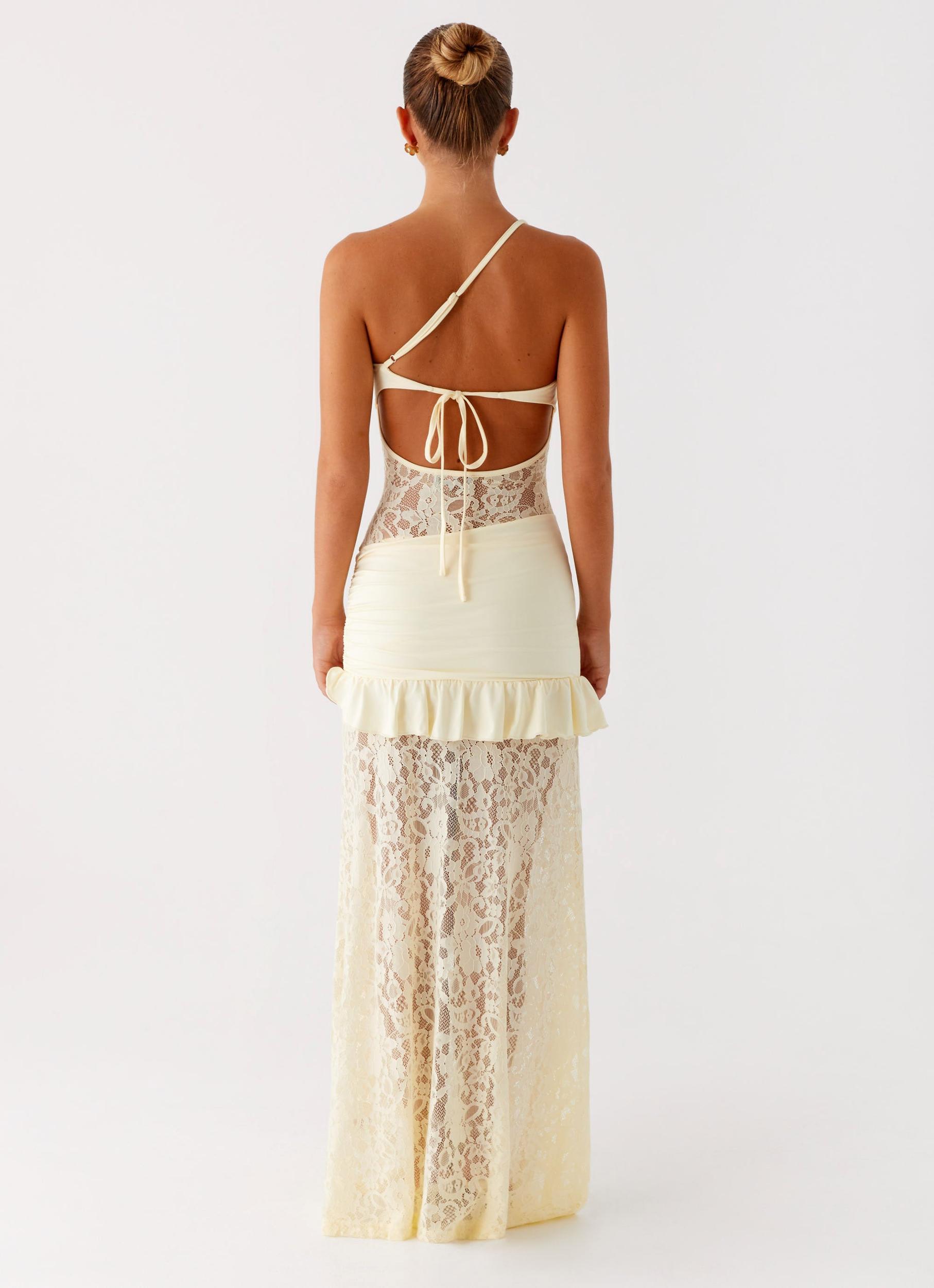 Peppermayo Exclusive The Benita Maxi Dress is the perfect combination of comfort and elegance. Made from soft stretch jersey, it moves with your body, providing a flattering, figure-hugging fit. The ruched side detail adds a touch of sophistication and shape, creating an effortlessly chic silhouette. - Maxi length- Asymmetrical neckline- Stretch jersey- Ruched side- Ruffled waistline- Self-lined bodice and skirt- Stretch lace side and skirt, semi-sheer- Low back- Back neck tie- Composition: 95% Polyester, 5% Spandex Size AU 8 / US 4 garment measurements: Length - 153 cm / 60.2 inBust - 74 cm / 29.1 inWaist - 59 cm / 23.2 inHip - 82 cm / 32.3 inHem - 170 cm / 66.9 in Yasmin is 170cm and wearing a size AU 8 / and US 4